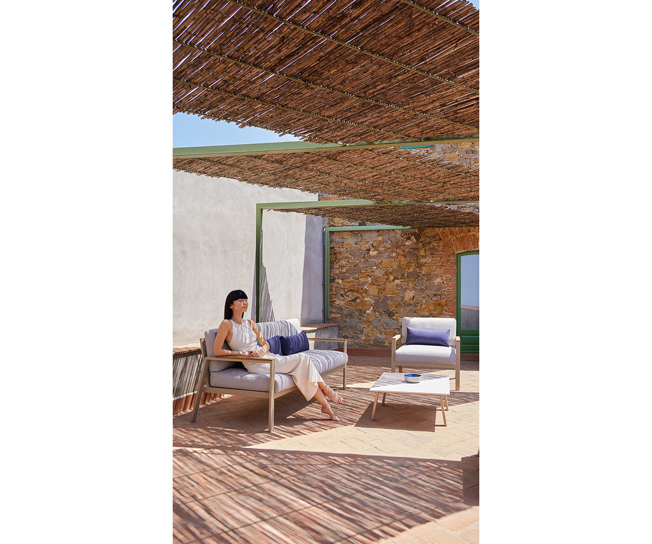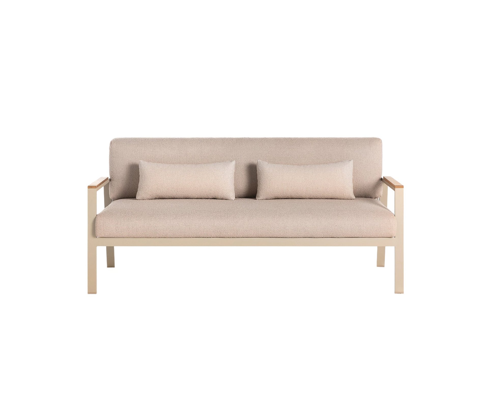 The TIMELESS 2 seat sofa completes the collection. It is an outdoor sofa made of powder-coated welded aluminium profiles, available in many colour options and with teak wood accents. The mats and cushions are made of polyurethane foam rubber protected with a waterproof fabric. The outdoor grade upholstery is removable, and you can customize it by choosing from the many different textile options available in our catalog.
