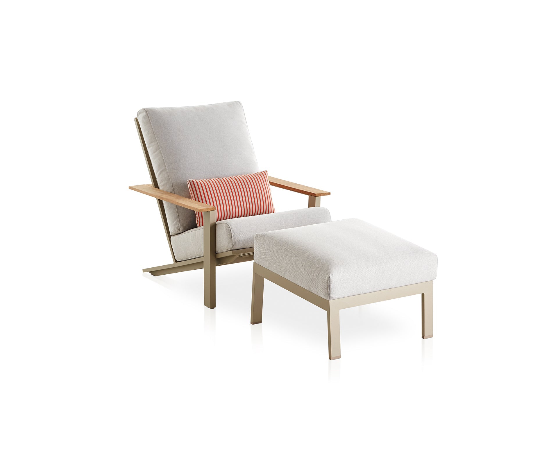 It is a designer club armchair that you can enjoy inside or outside your home. The quality upholstery fabrics by Dedar Milano, Sunbrella and Kvadrat, among others, are available in different finishes whose texture reminds us of upholstery used for interiors.