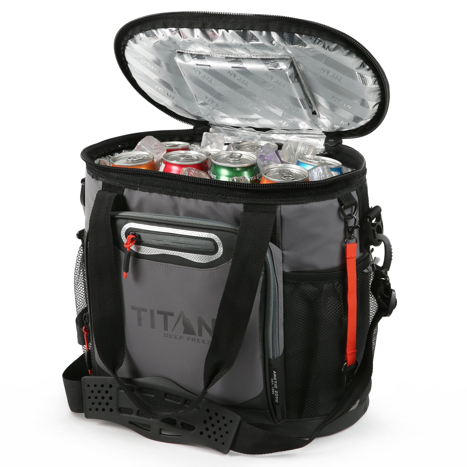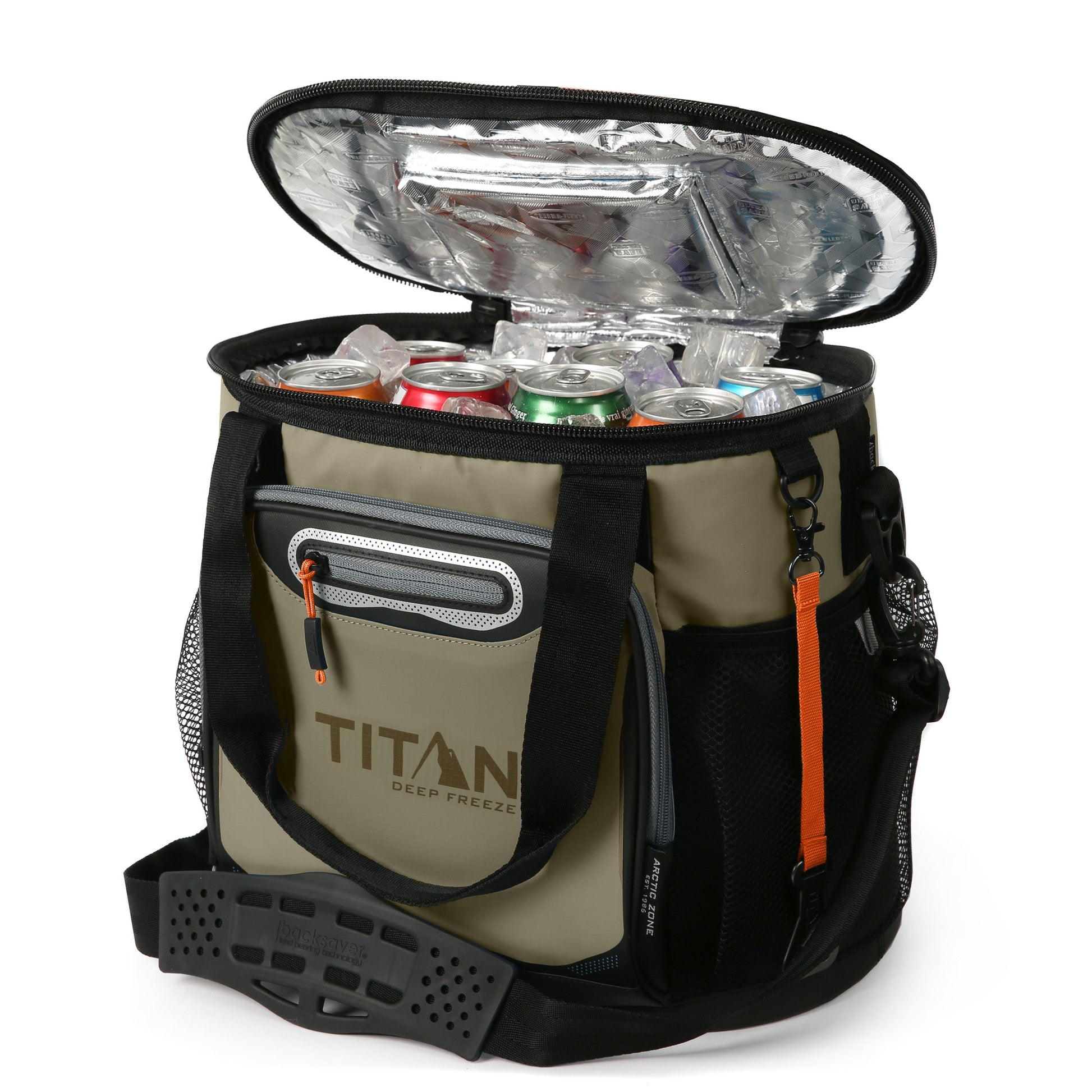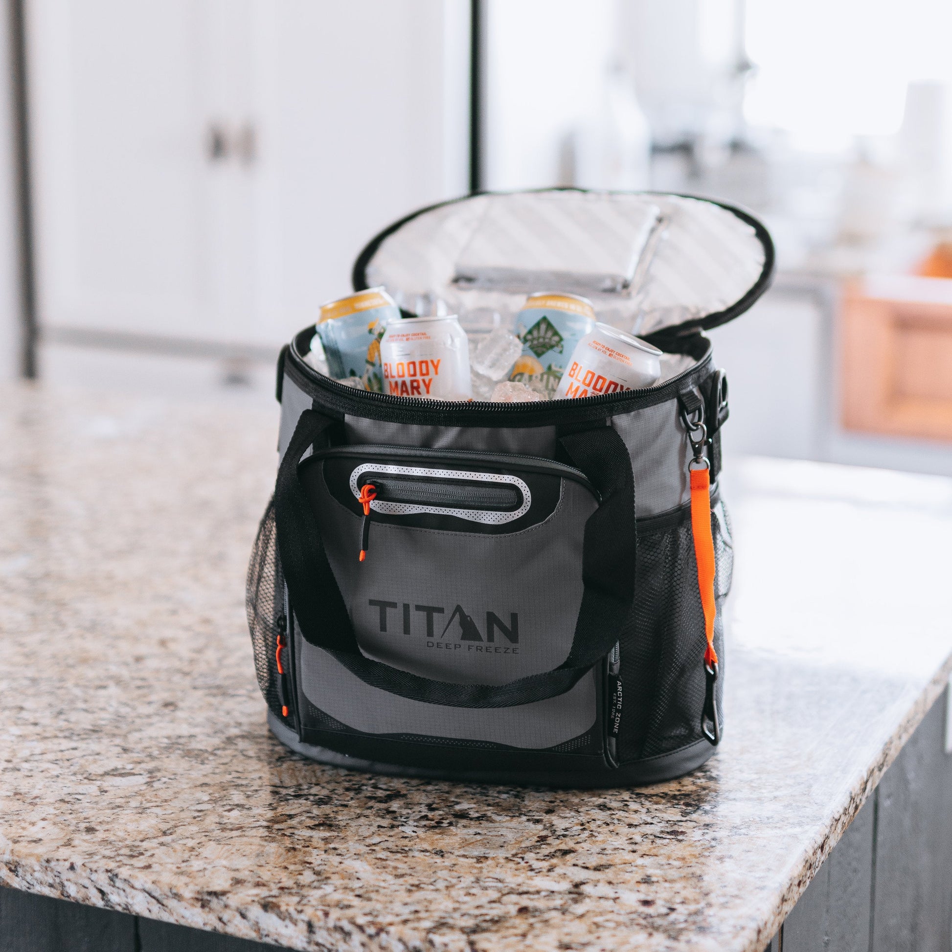 The Titan Bucket Tote has a 24 can capacity, keeps ice up to 2 days and features an easy access lid so grabbing a cold one is a snap. The tough exterior of the Bucket Tote is water and stain repellent and easy to wipe clean. The exterior also includes an insulated front pocket as well as a detachable bottle opener.