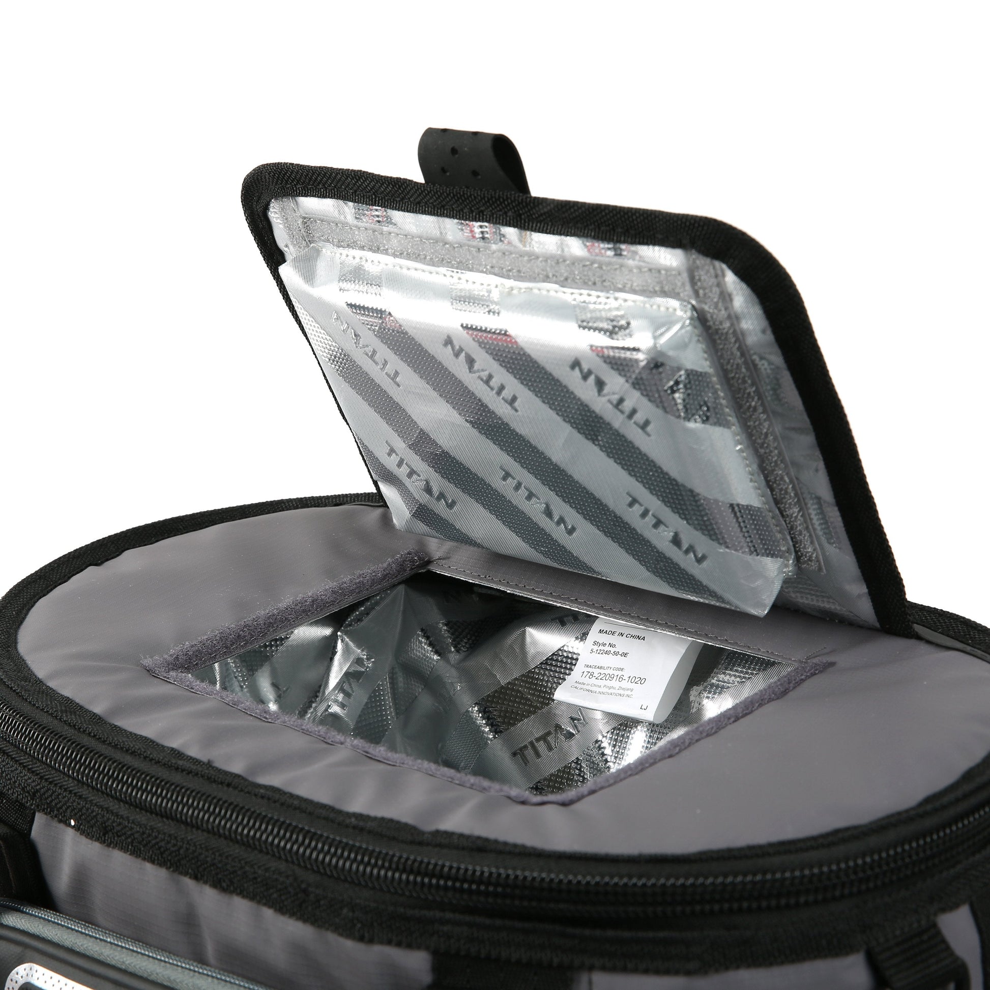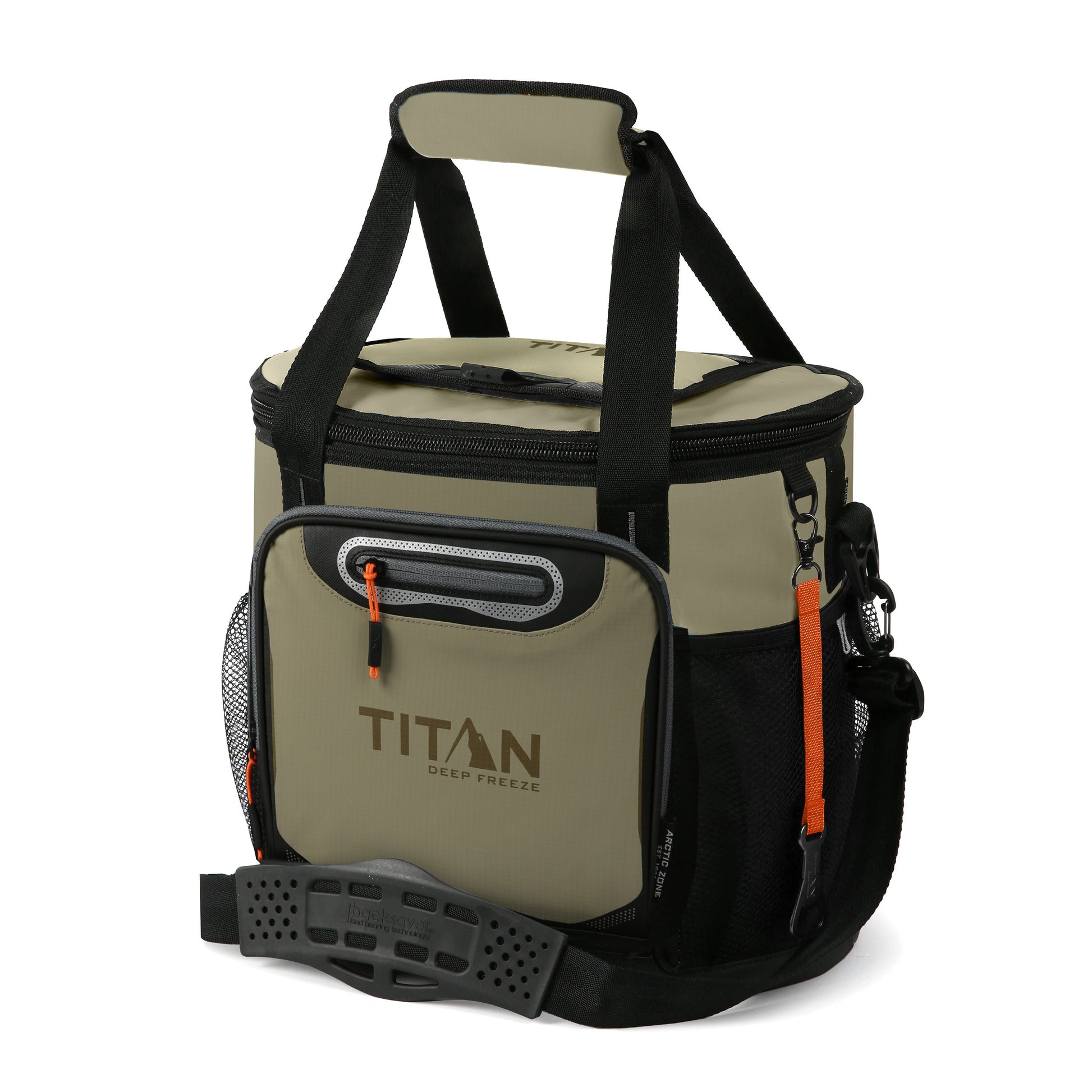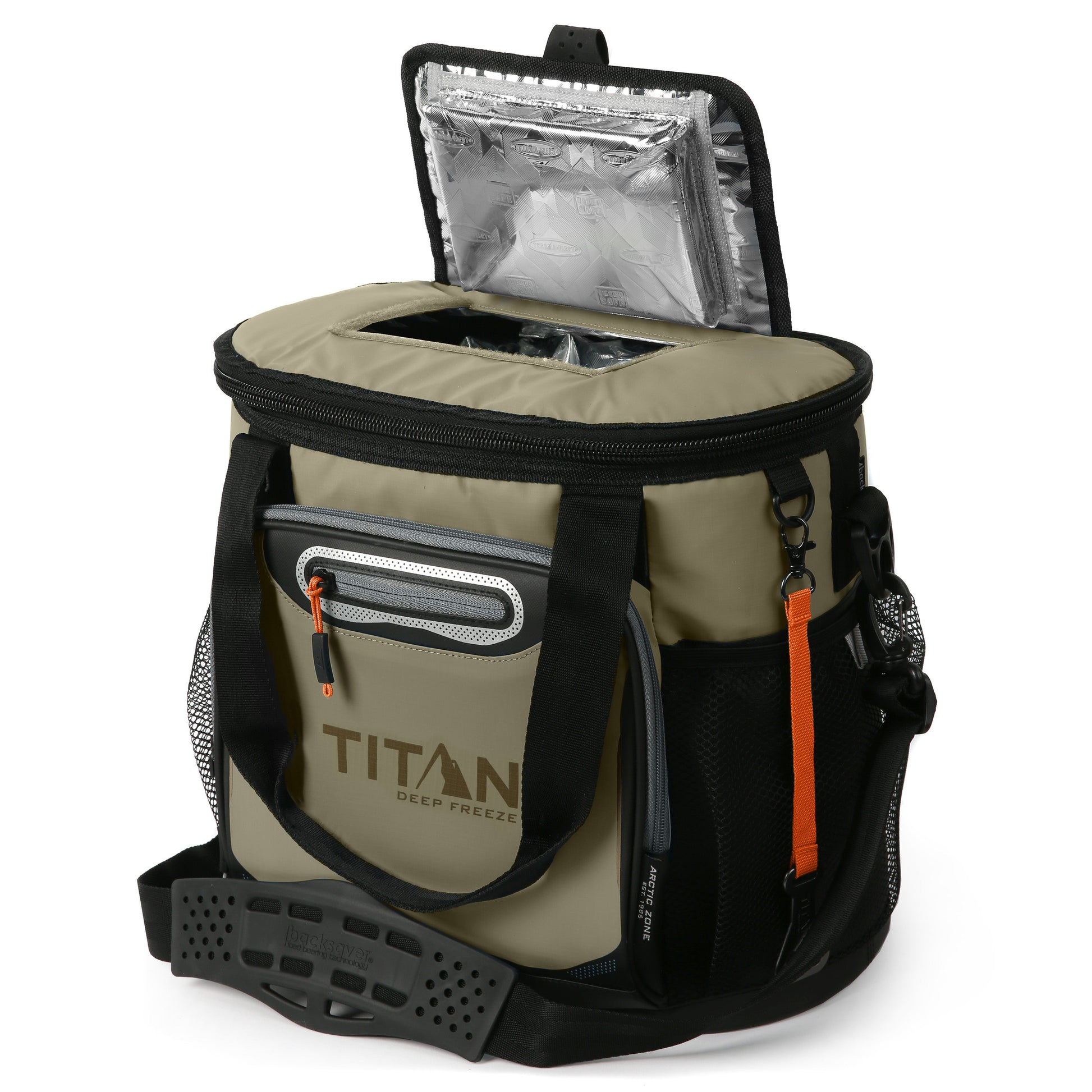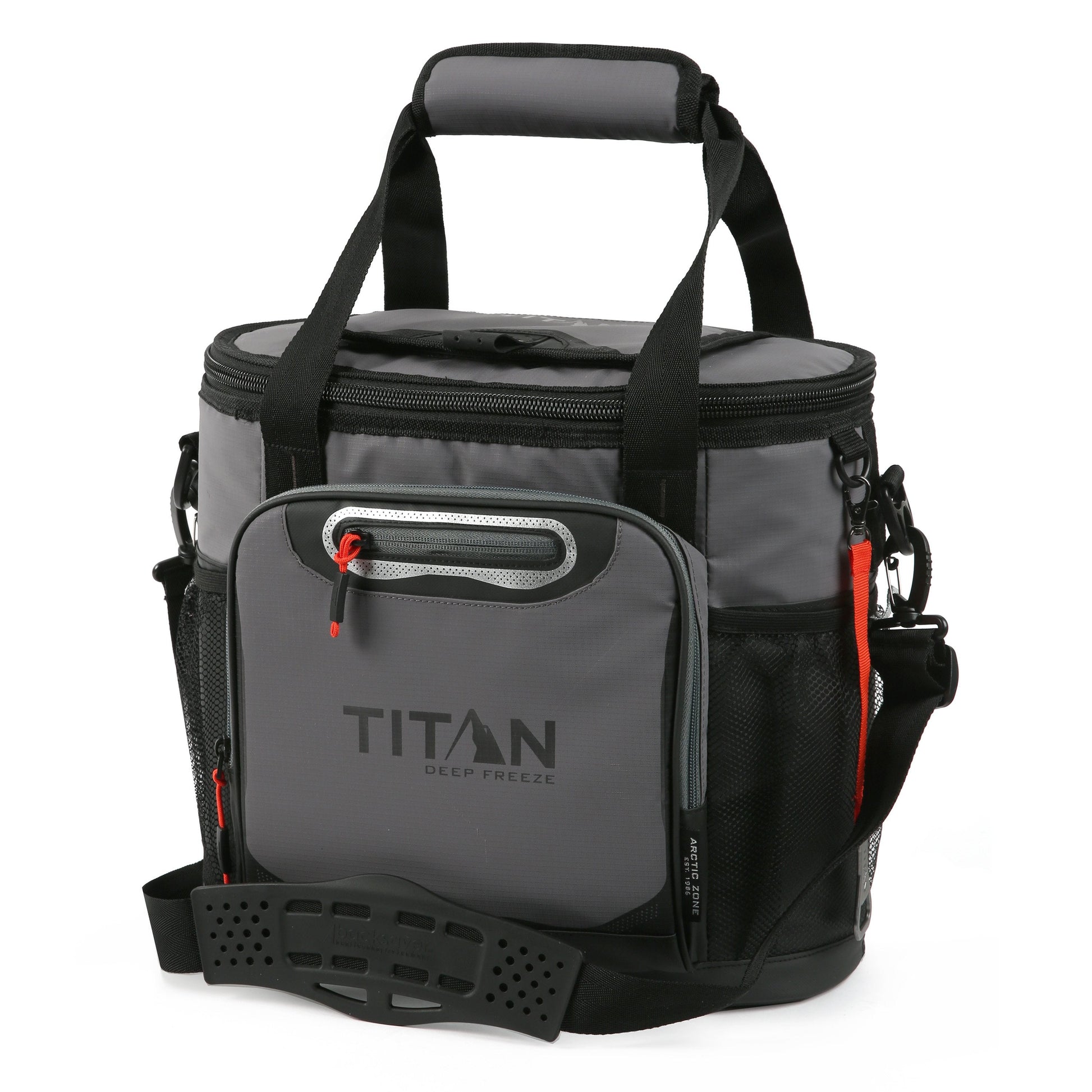 The Titan Bucket Tote has a 24 can capacity, keeps ice up to 2 days and features an easy access lid so grabbing a cold one is a snap. The tough exterior of the Bucket Tote is water and stain repellent and easy to wipe clean. The exterior also includes an insulated front pocket as well as a detachable bottle opener.