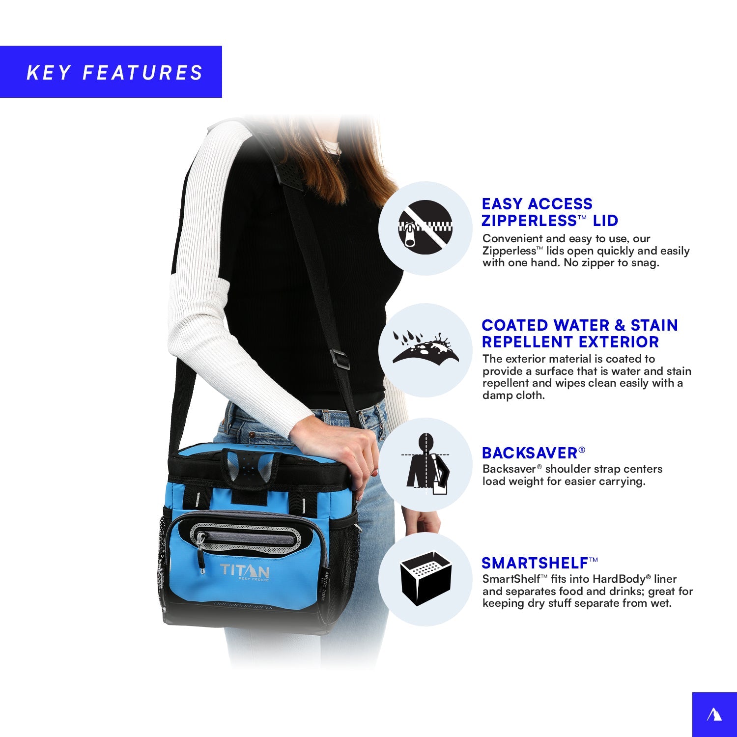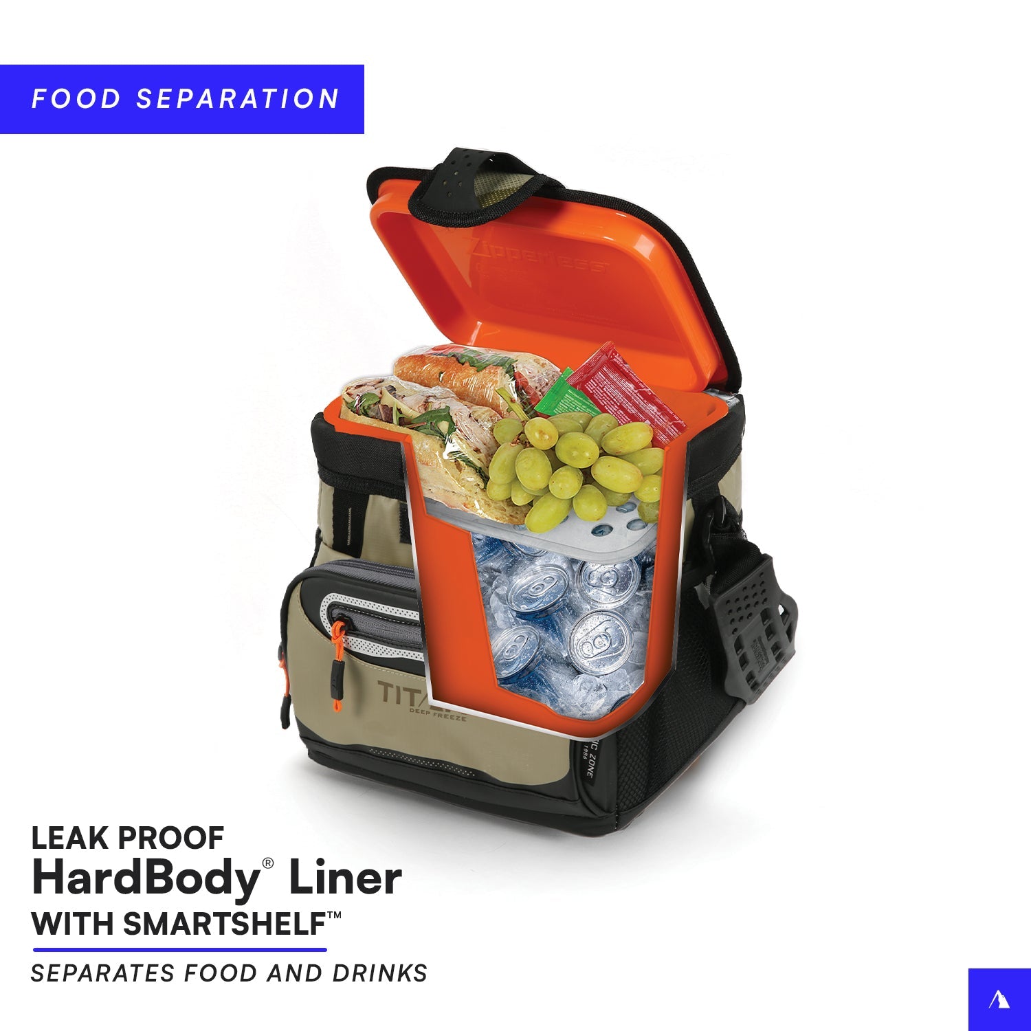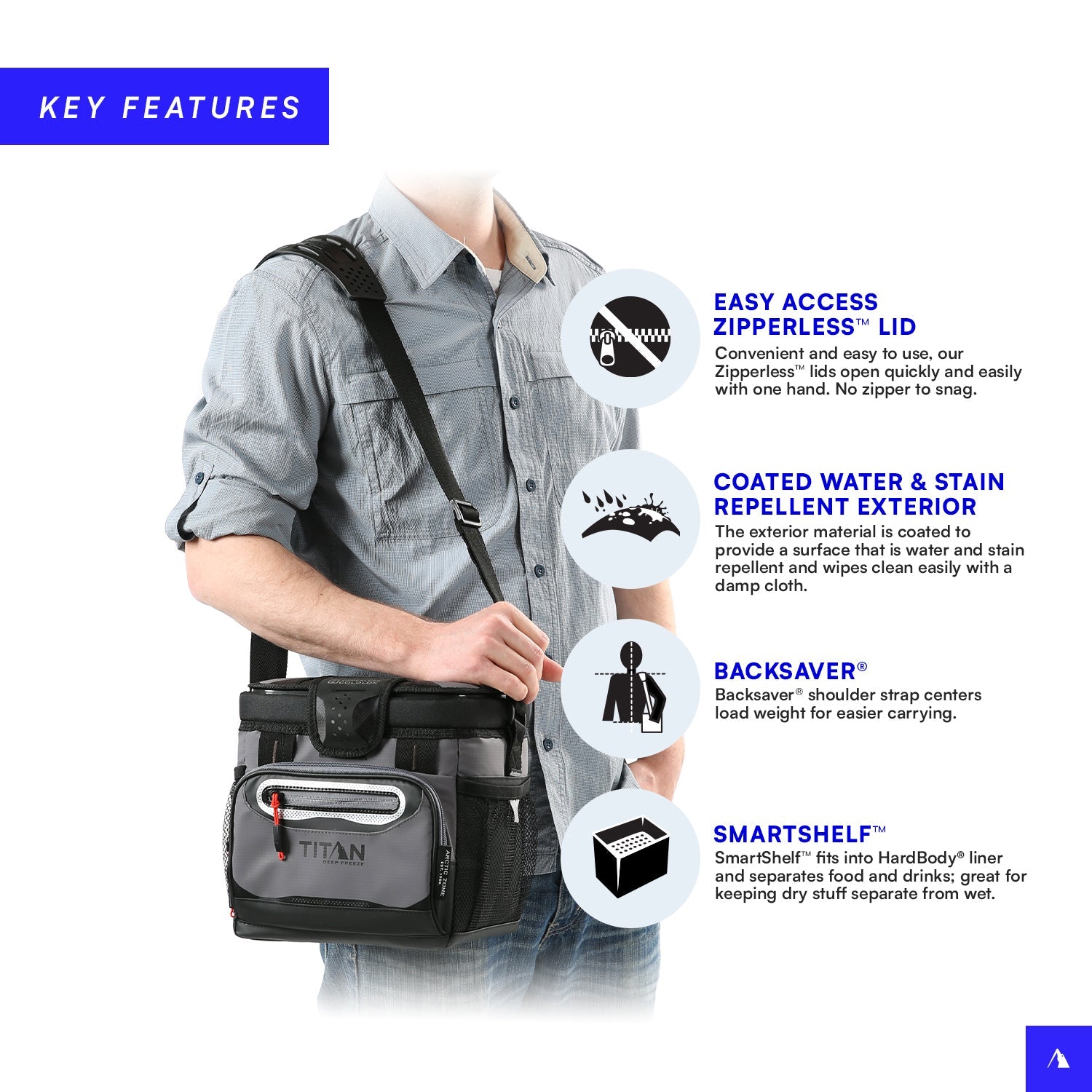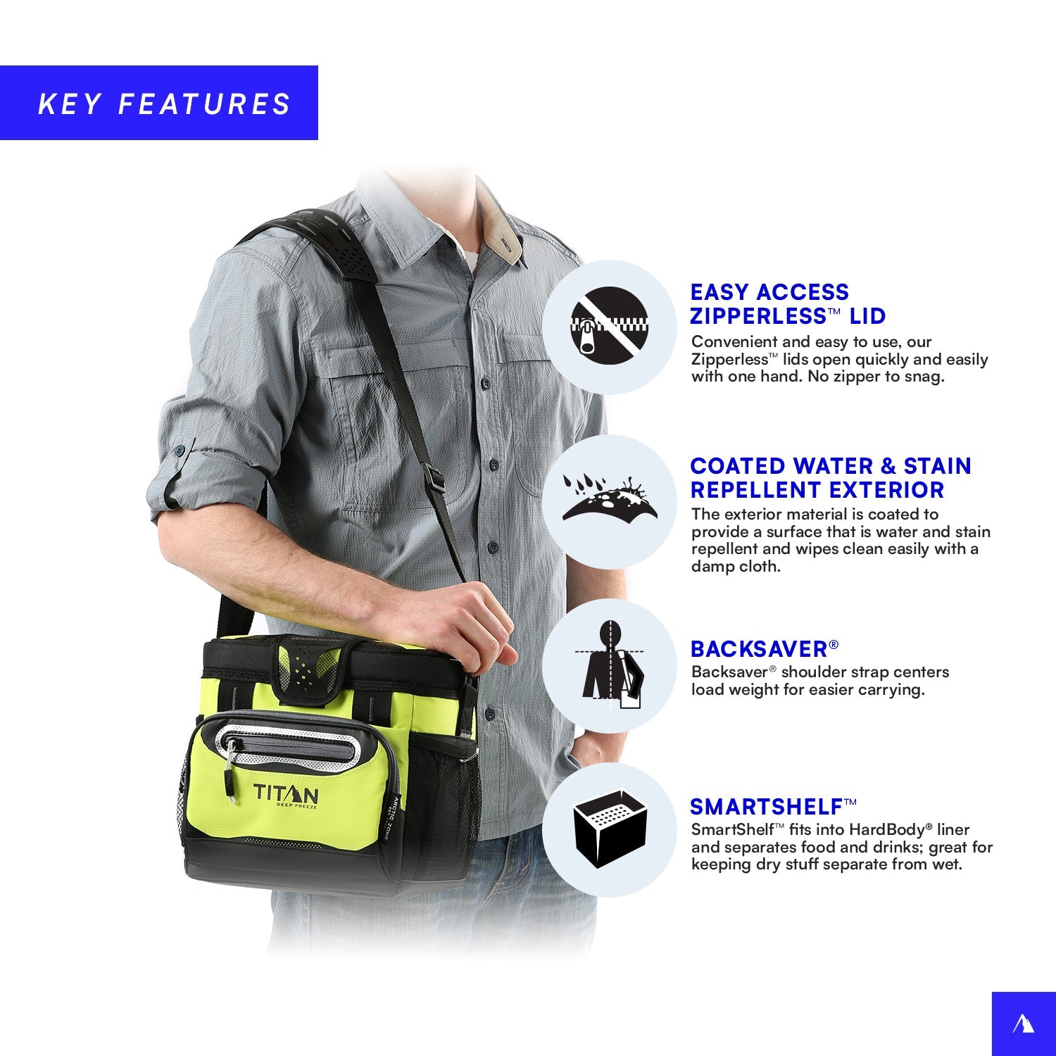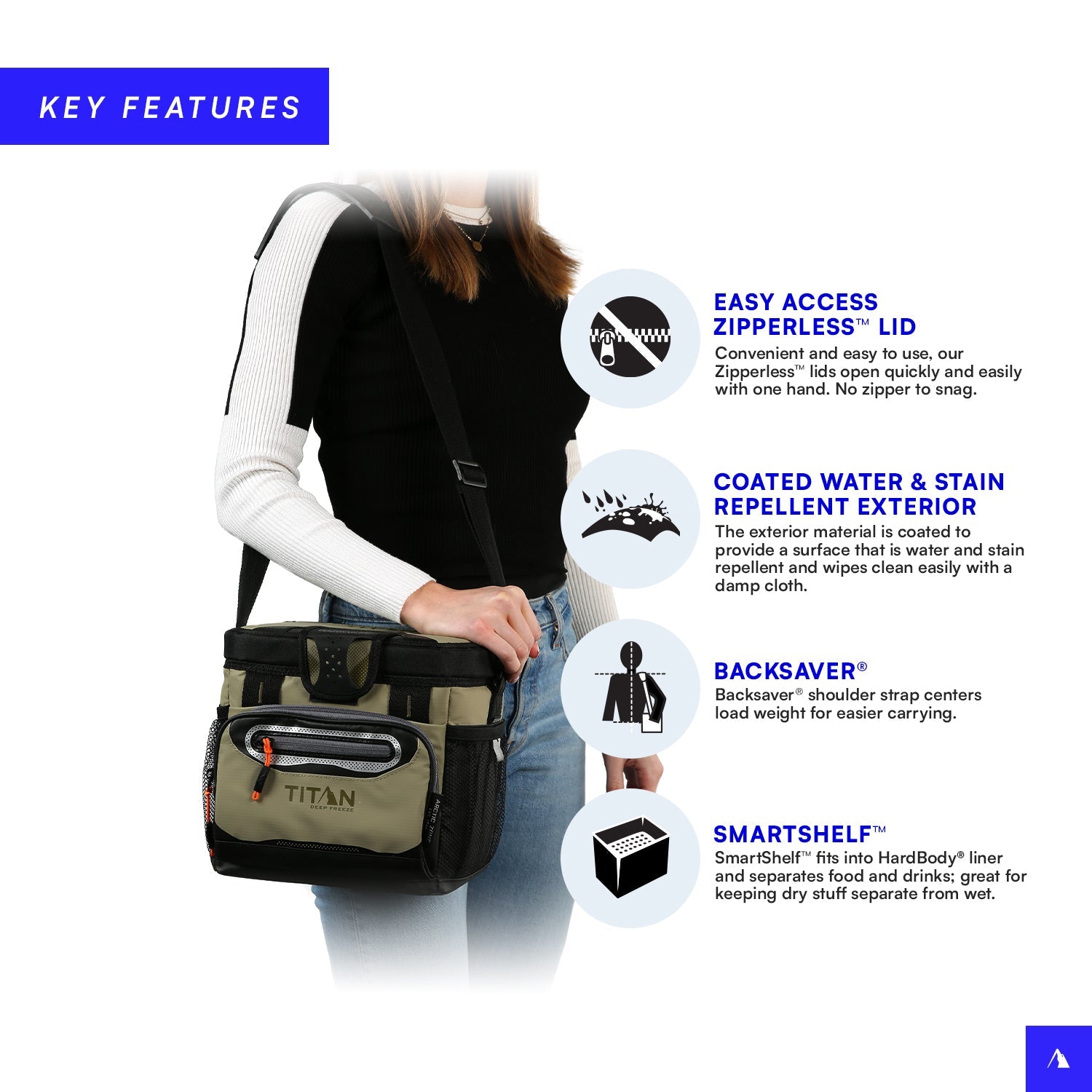 The Titan 9 Can Zipperless HardBody® Cooler keeps ice up to 2 days and includes a “flip-open”, patented Zipperless™ lid that provides quick access to food and drinks as well as an insulated front pocket.