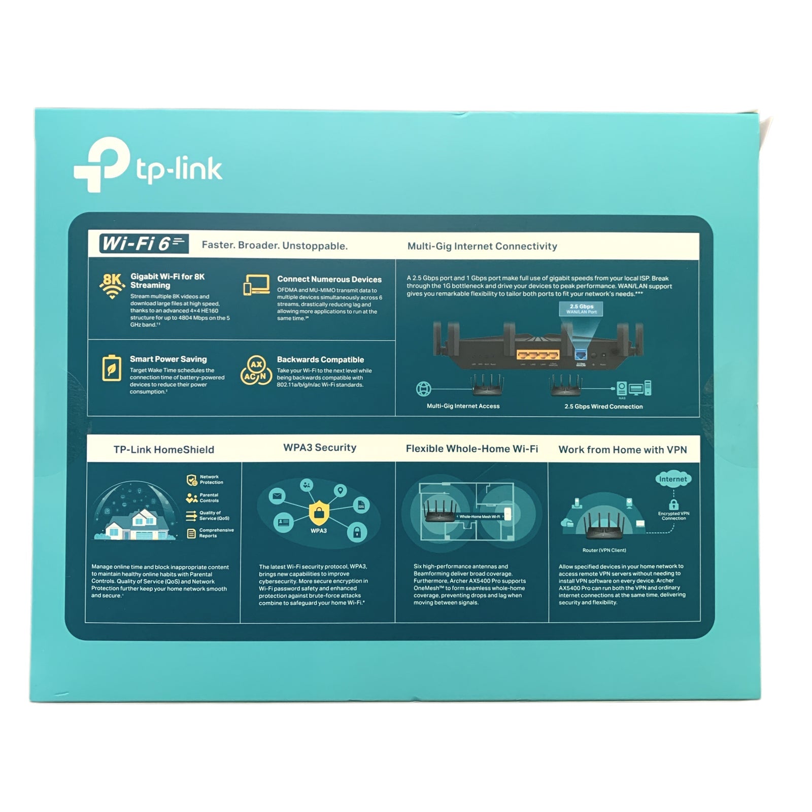 Go Further and Faster: Archer AX5400 Pro is fully featured AX5400 Multi-Gigabit Wi-Fi 6 Router. Equips with the top 4T4R and HE160, Level up your Wi-Fi game with Wi-Fi 6 technology providing up to 4804 Mbps on 5.0 Ghz and 574 Mbps on 2.4 Ghz band. Drastically improved streaming, downloading, gaming speed and even stream multiple 8K videos without buffering. Features Boosted Coverage Six high gain external antennas and a powerful chipset work together to send Wi-Fi to every corner of your home. Beamforming technology detects devices and concentrates wireless signal strength towards them. Stay connected and enjoy fast Wi-Fi whether you’re lounging on the sofa or relaxing on the balcony. Connect More Devices and Reduce Latency MU-MIMO and OFMDA technology works hand in hand to boost throughput and efficiency of your Wi-Fi network. MU-MIMO communicates with your router to provide multiple data streams simultaneously, greatly increasing the number of connected devices and OFDMA enables sharing a single data stream between multiple devices to further enhance the efficiency of each data stream.* Easily Setup and Manage Your Wi-Fi Setup is fast and easy with the Tether app. Download the app to your Android or iOS mobile device and follow the on-screen guide to complete the setup. Check your Wi-Fi status and manage your network whether home or away and even invite friends and family to help manage.
