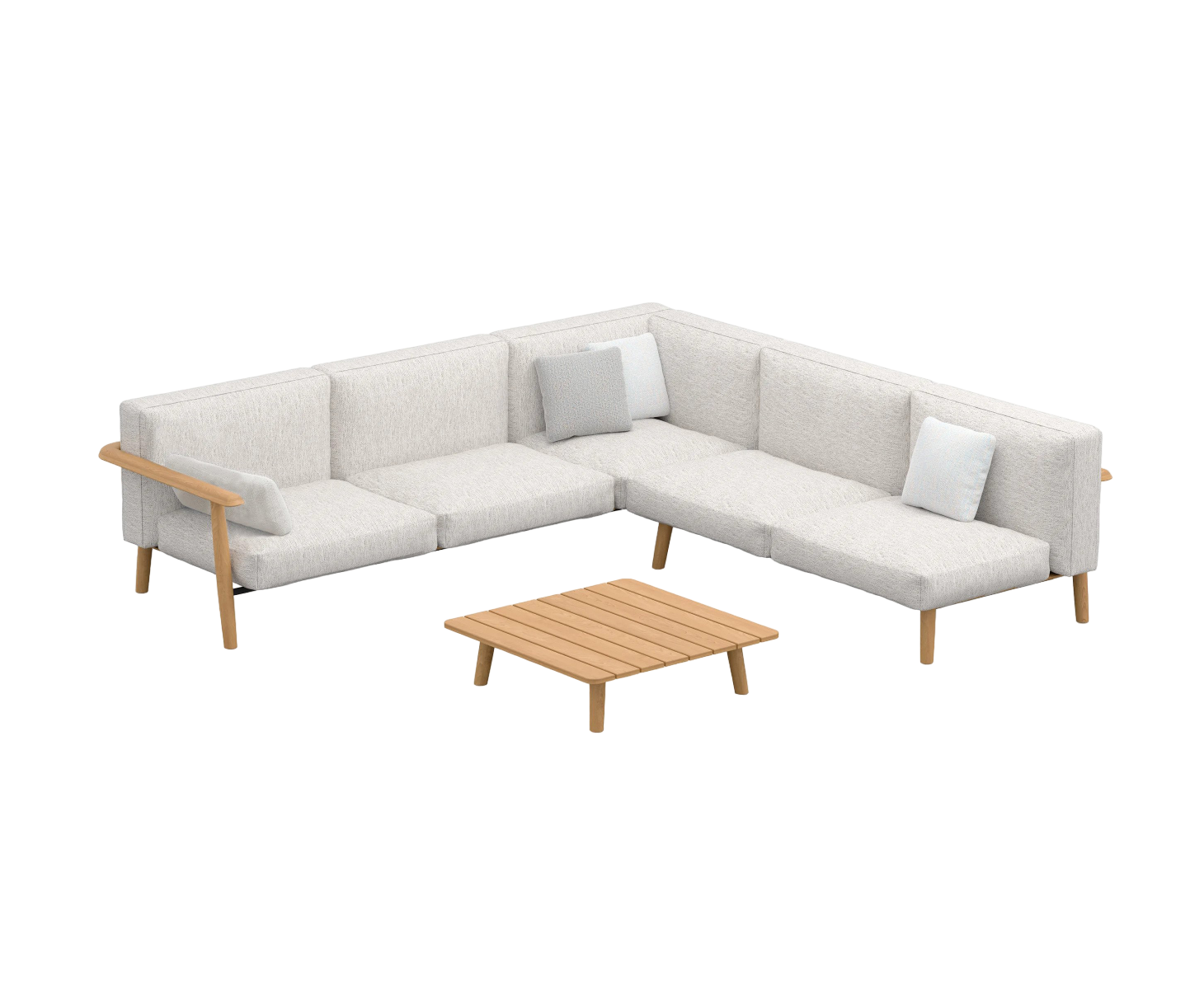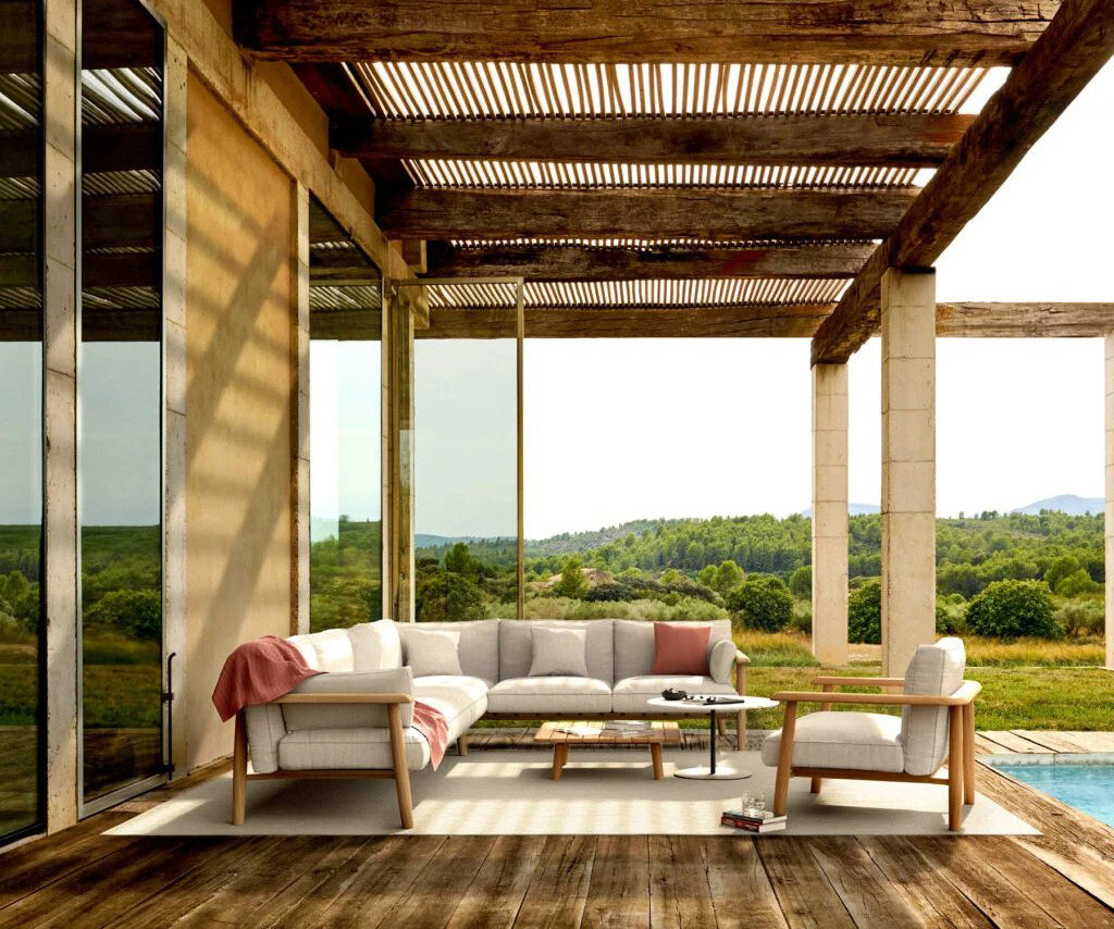 The Mambo Lounge Sectional Sofa by Royal Botania is a masterpiece of outdoor luxury, combining inviting design with durable craftsmanship. This piece offers a harmonious blend of comfort and elegance, crafted with soft, flowing lines and high-quality materials. The rich, warm wooden frame perfectly complements the plush cushions, creating an atmosphere of relaxed sophistication and ease.