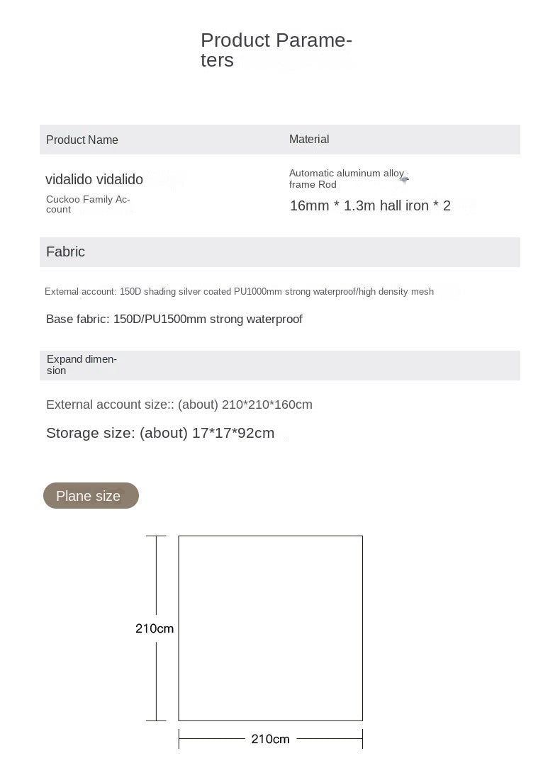 Material: 150D Oxford Cloth, Mesh, Aluminum Alloy, Fiber glass