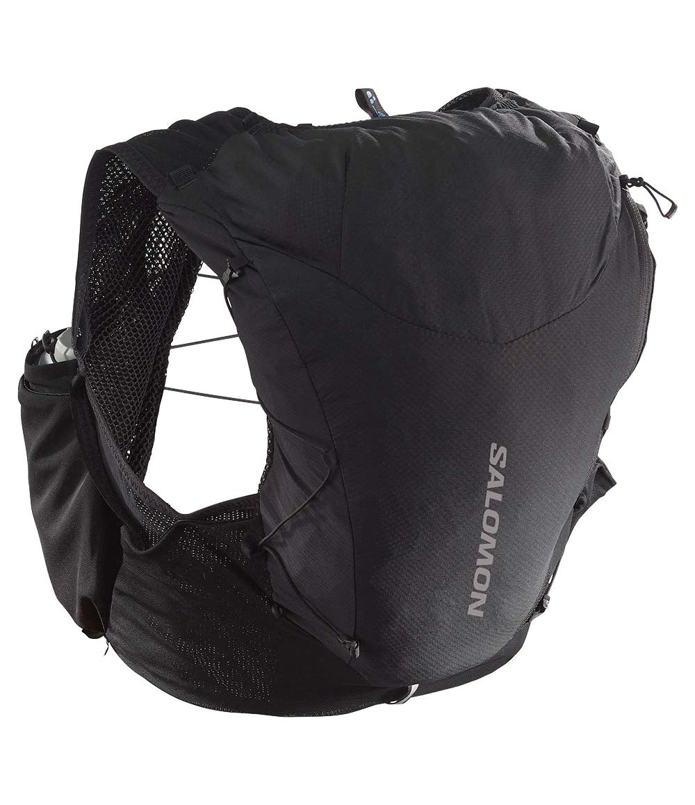 - 2 Front Flask Pockets: Designed to fit Salomon soft flasks, these front pockets limit bouncing. Top elastic loops secure your flasks and keep them ready to drink.
