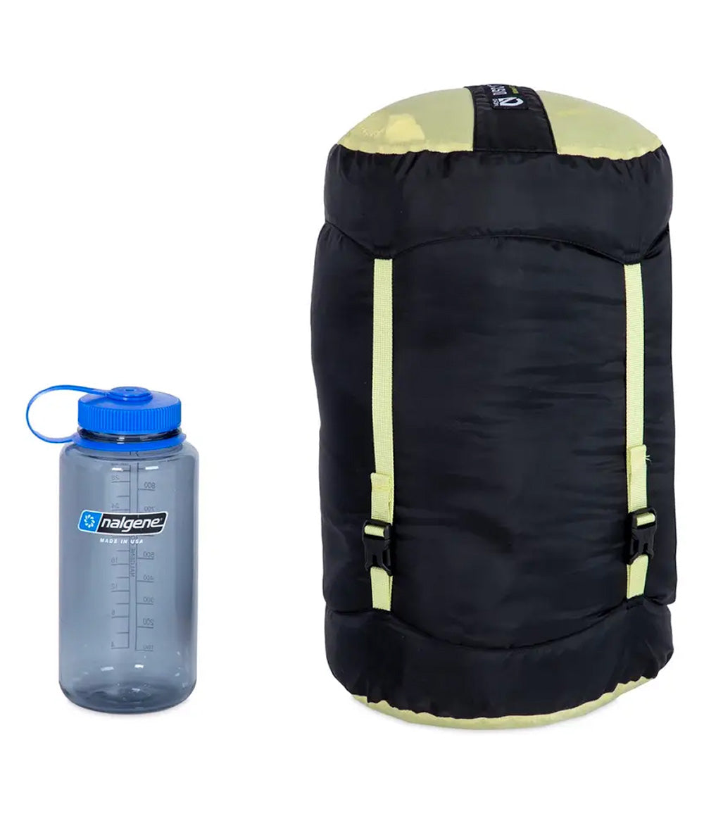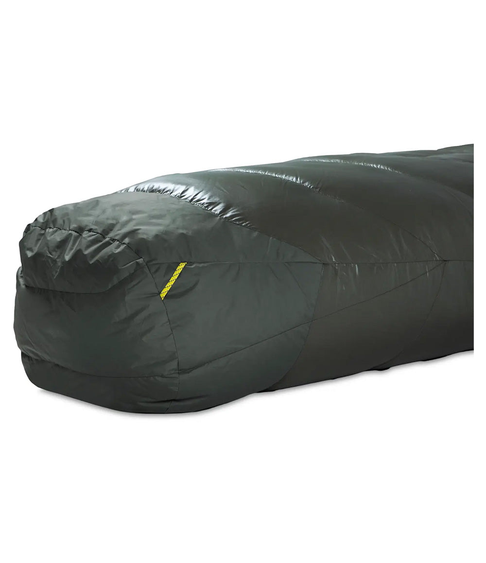 - Hood and footbox are reinforced with recyclable material treated with PFAS-free waterproofing to prevent tent condensation from soaking into the bag's fabric.