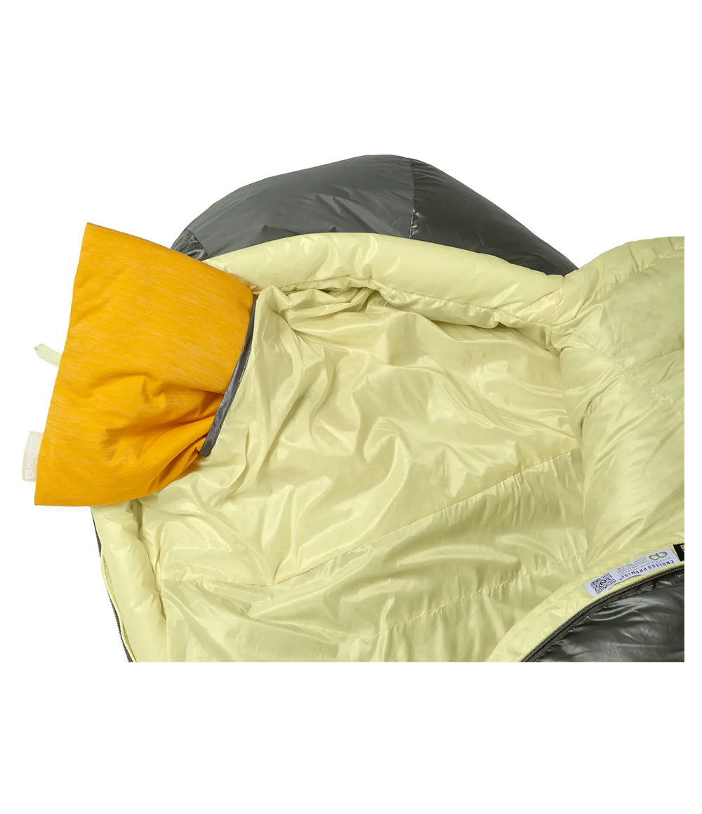- Hood and footbox are reinforced with recyclable material treated with PFAS-free waterproofing to prevent tent condensation from soaking into the bag's fabric.
