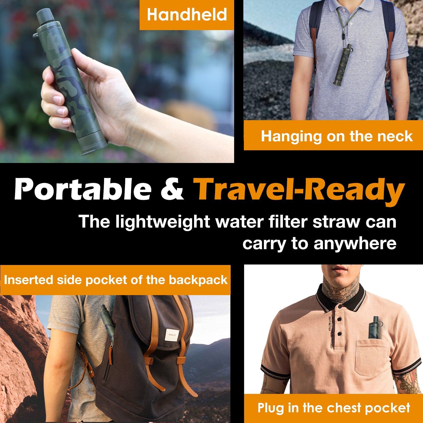 The Water Filter Straw is the safe way to drinking healthy water anywhere, and at anytime whether your camping, hiking, backpacking, climbing, fishing, hunting, or include it into your survival kit.