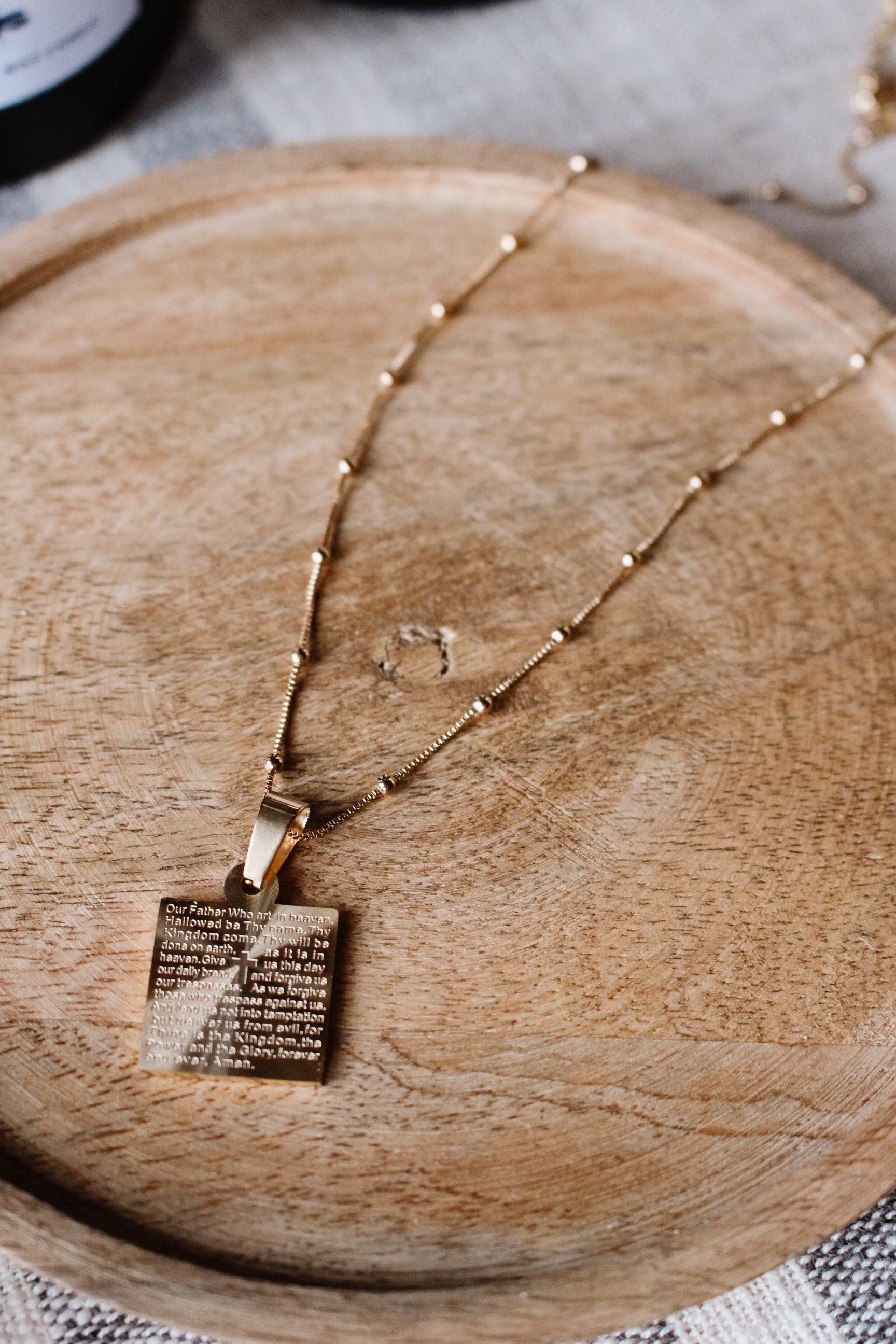This elegant gold necklace features the Lord's Prayer, serving as a daily reminder of faith and strength. Showcasing the beautiful design of Weisinger Designs brand, it is a timeless piece that will enhance any outfit while conveying a powerful message of belief and inspiration.