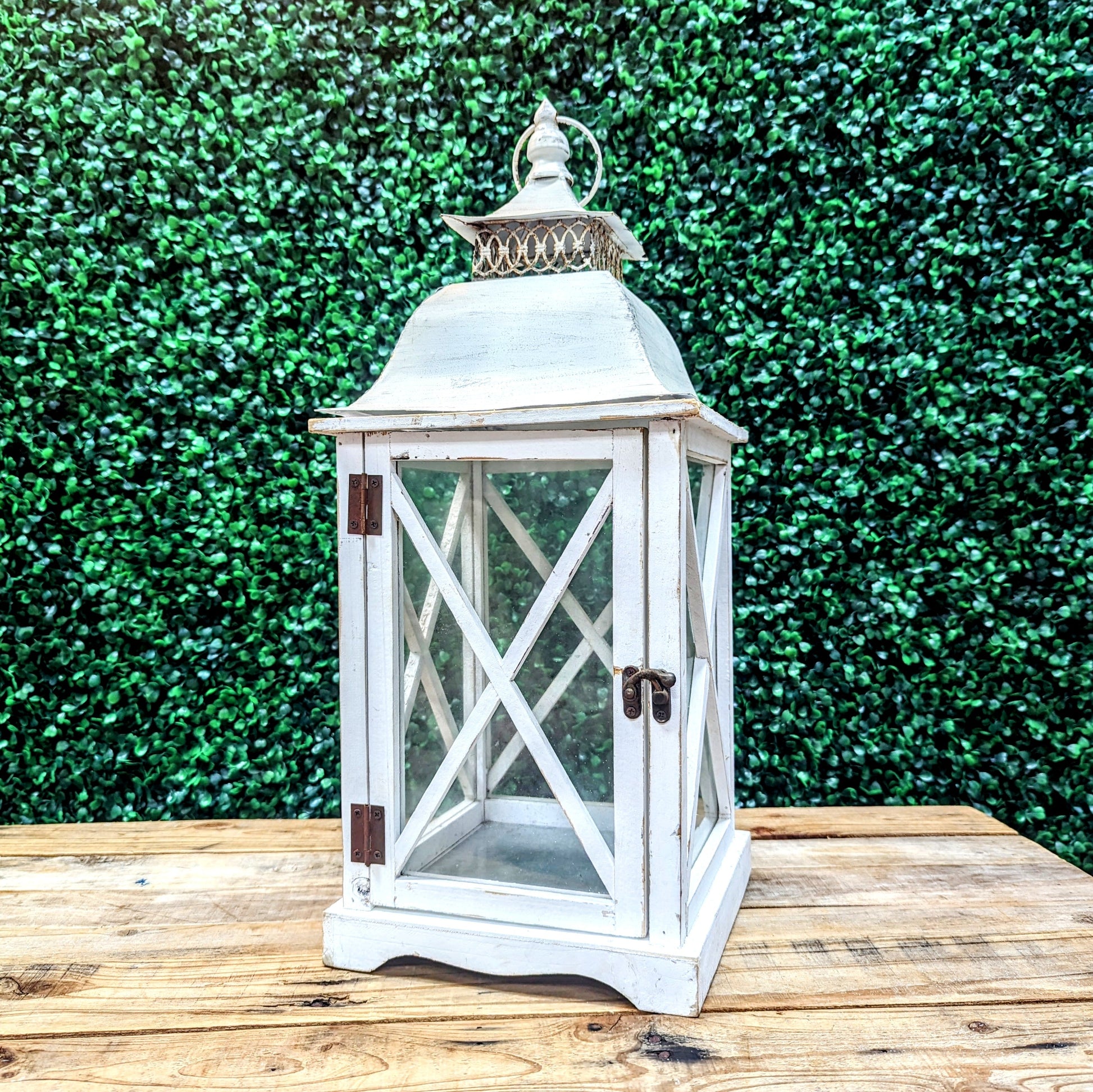 Capture the essence of classic romance with our White Bella Lanterns. Featuring a white rustic look with an X-shaped panel design, these elegant lanterns are an ideal rental for weddings or parties in Panama City Beach, Florida. Add a candle for a classic centerpiece or fill with spilling flowers to create a beautiful table accent or aisle marker. These lanterns provide a nautical feel with a touch of rustic charm.