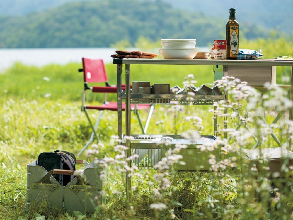 The durable, stainless steel Shallow Mesh Tray 1 Unit is designed to add extra storage to the Iron Grill Table.