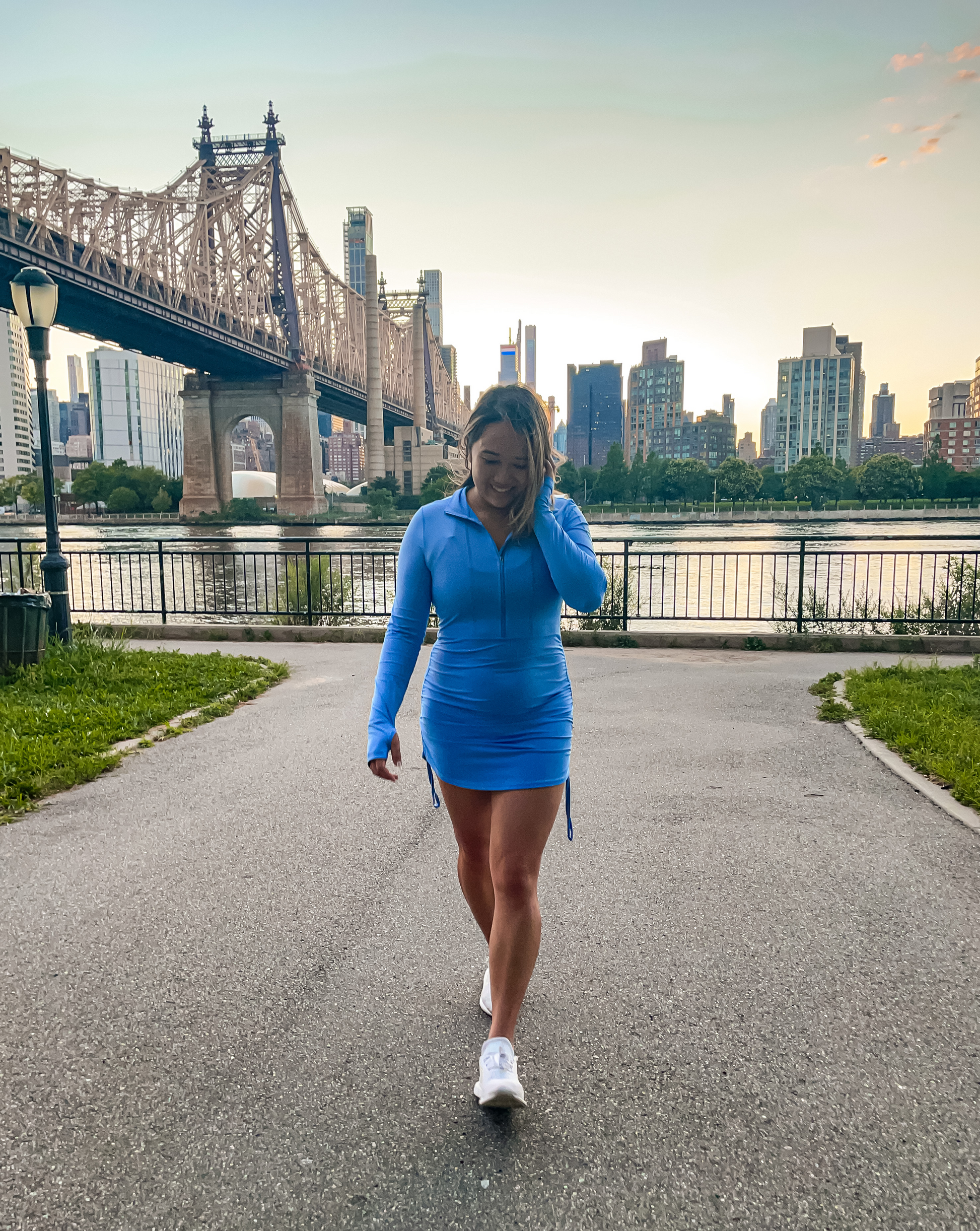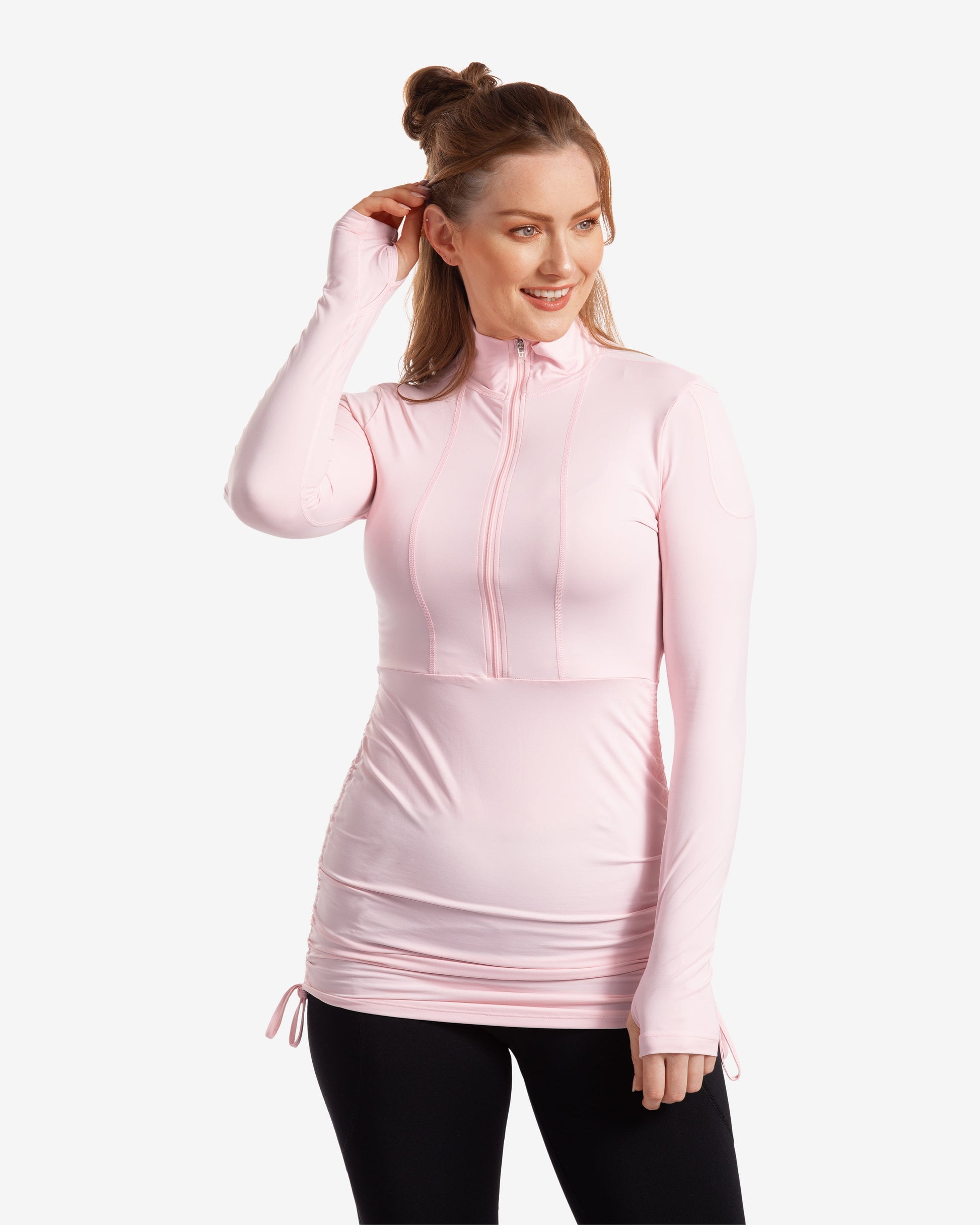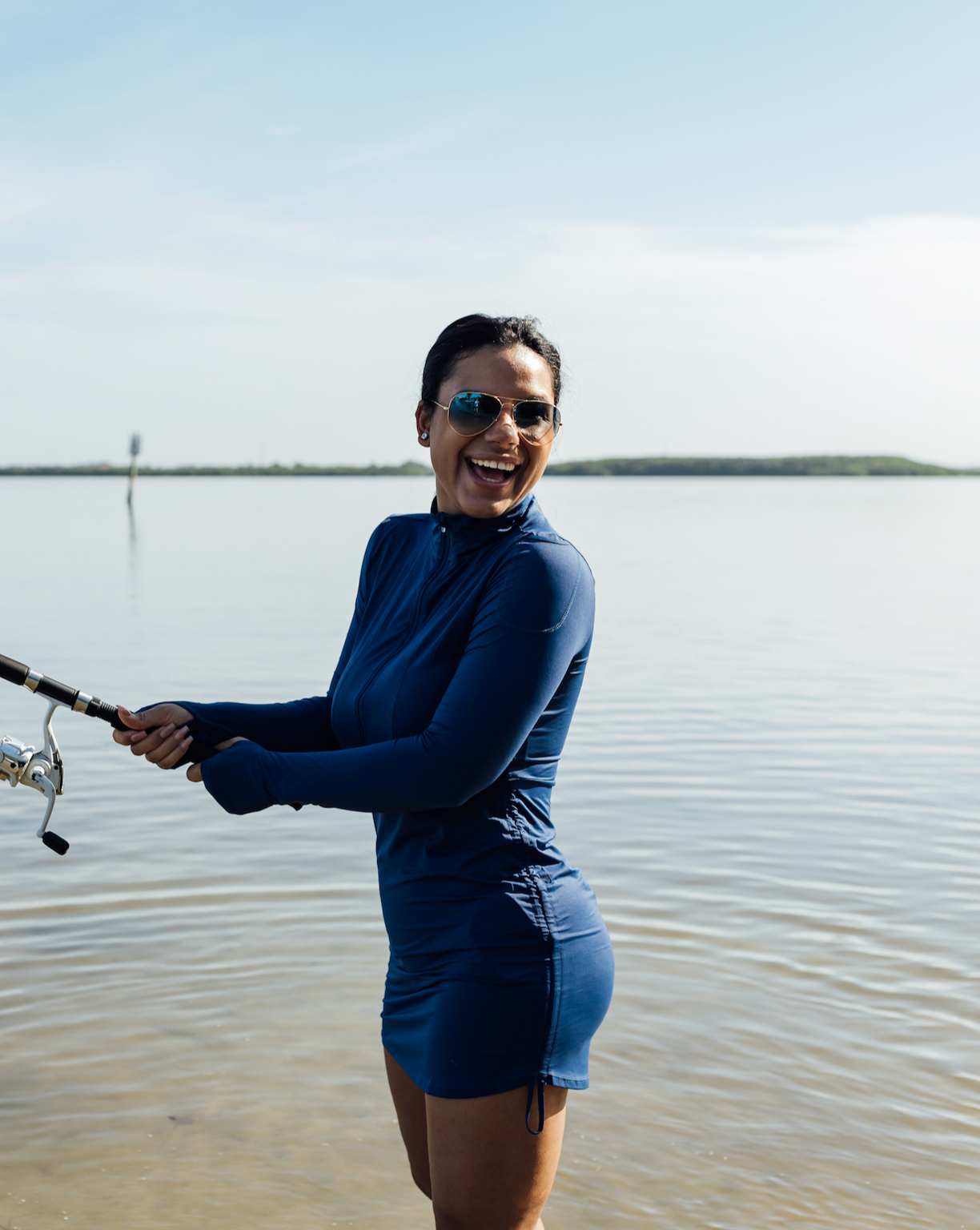 The BloqUV adjustable cover up features side ruching to convert the length from a dress to a tunic to a shirt. High zippered neck and long sleeves offer sun protection while keeping you cool and comfortable. This indispensable, multi-functional piece can serve as a swim shirt, swim dress, rash guard or beach cover up. Wear it short as you play, let down the sides and you’re ready for lunch in town. Great worn over BloqUV tights. Enjoy SPF protection while playing tennis, paddle boarding, boating, boating, fishing, running, swimming, walking or shopping.