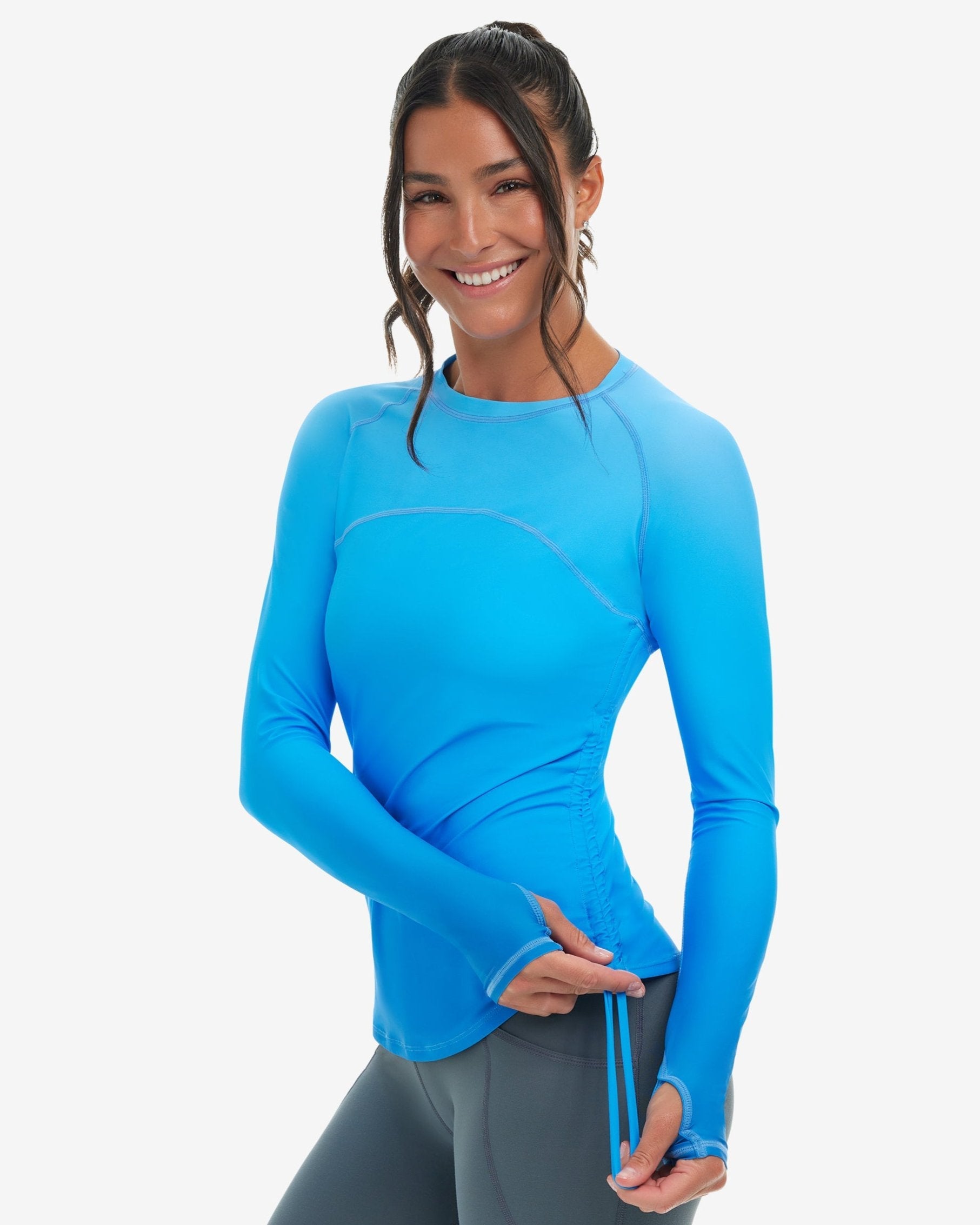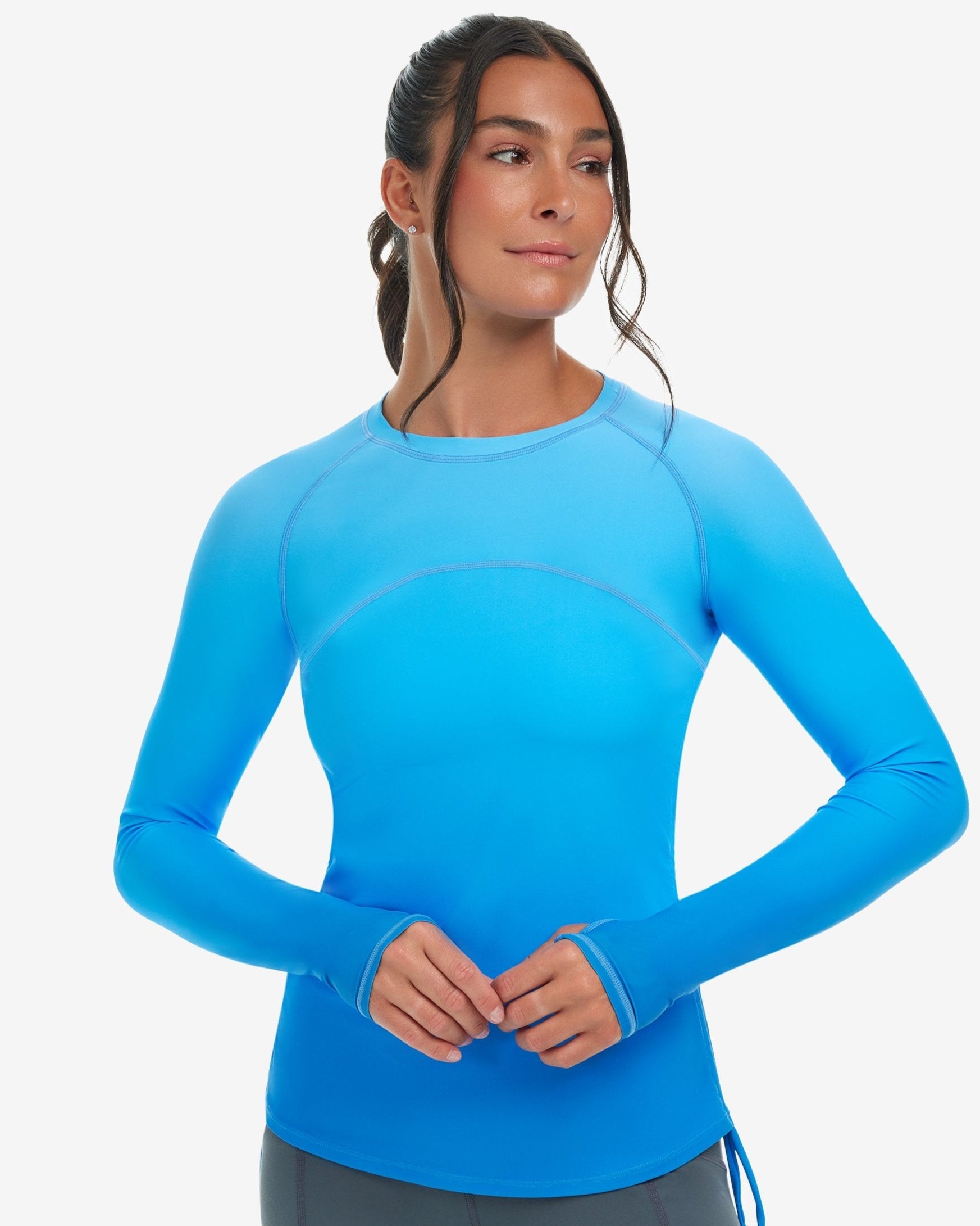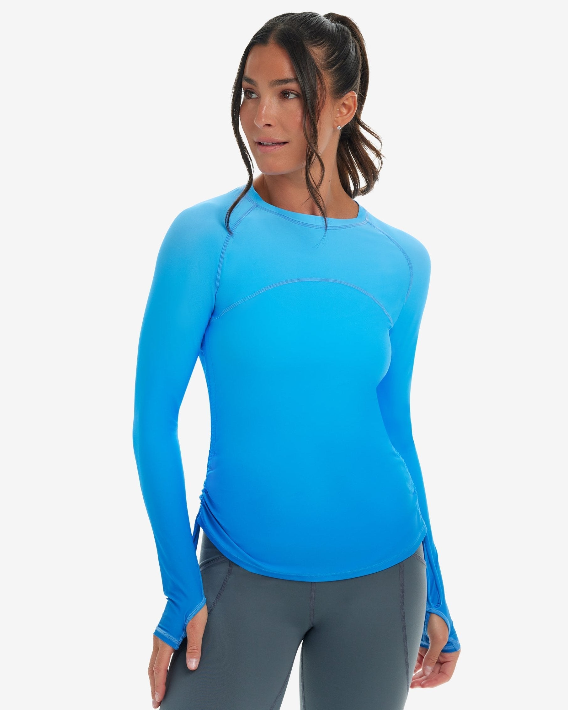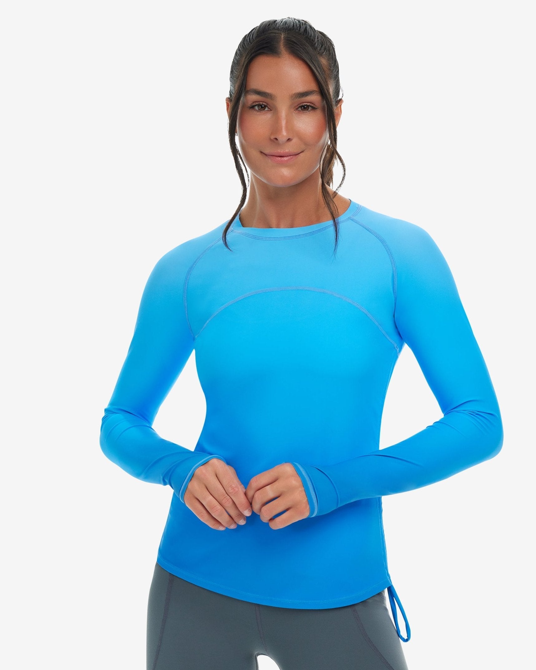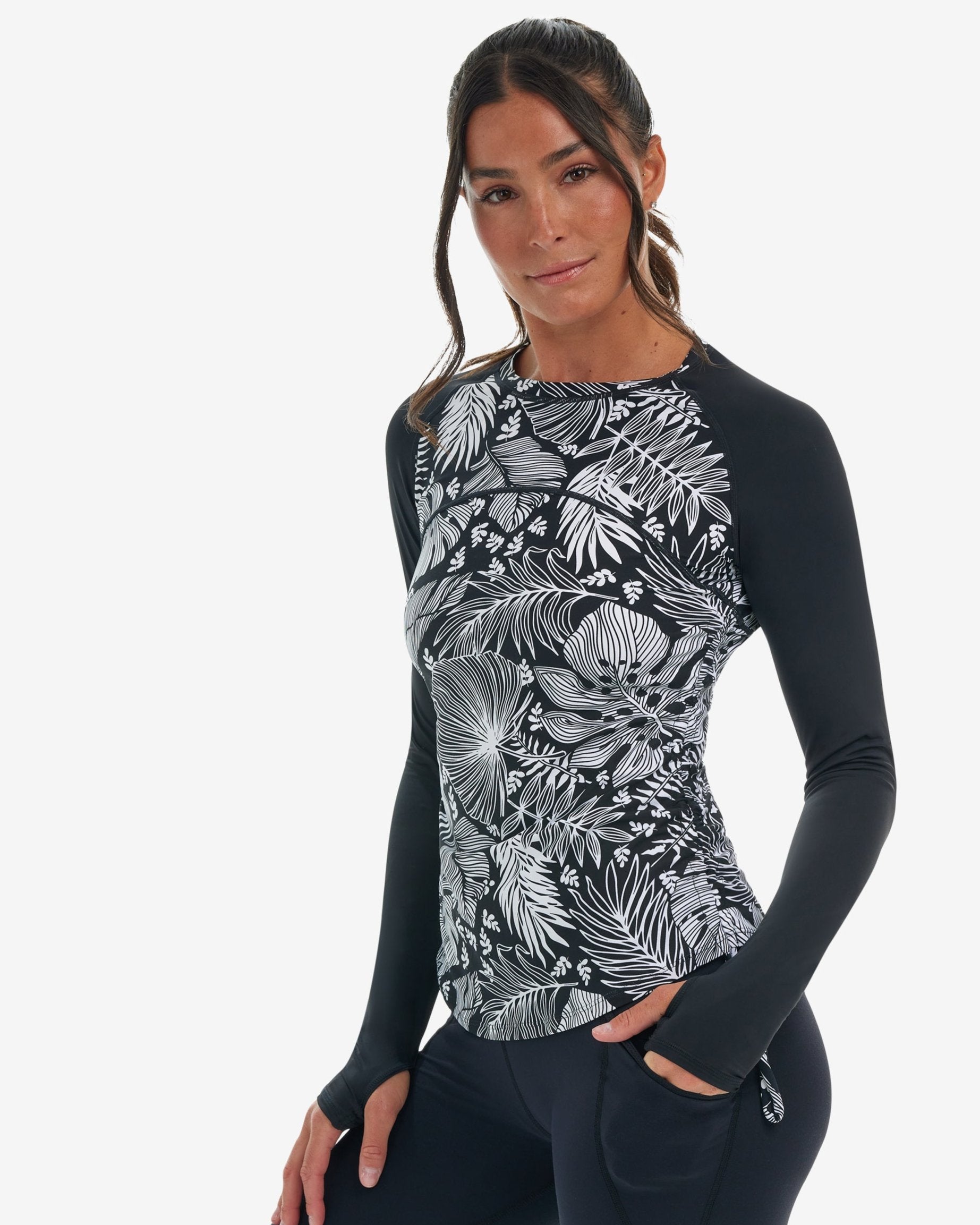 One of our top seller is now available in prints! A staple piece to have as part of your athleisure wardrobe. This crew long sleeve UPF Shirt has drawstring for adjustable length. The side ruching allows you to wear the shirt as long or as short as you like. This indispensable, multi-functional piece looks great with joggers, pants or BloqUV tights and can also serve as a swim shirt or rash guard. Enjoy SPF protection while playing tennis, pickle ball, paddle boarding, boating, running, swimming, walking or shopping.