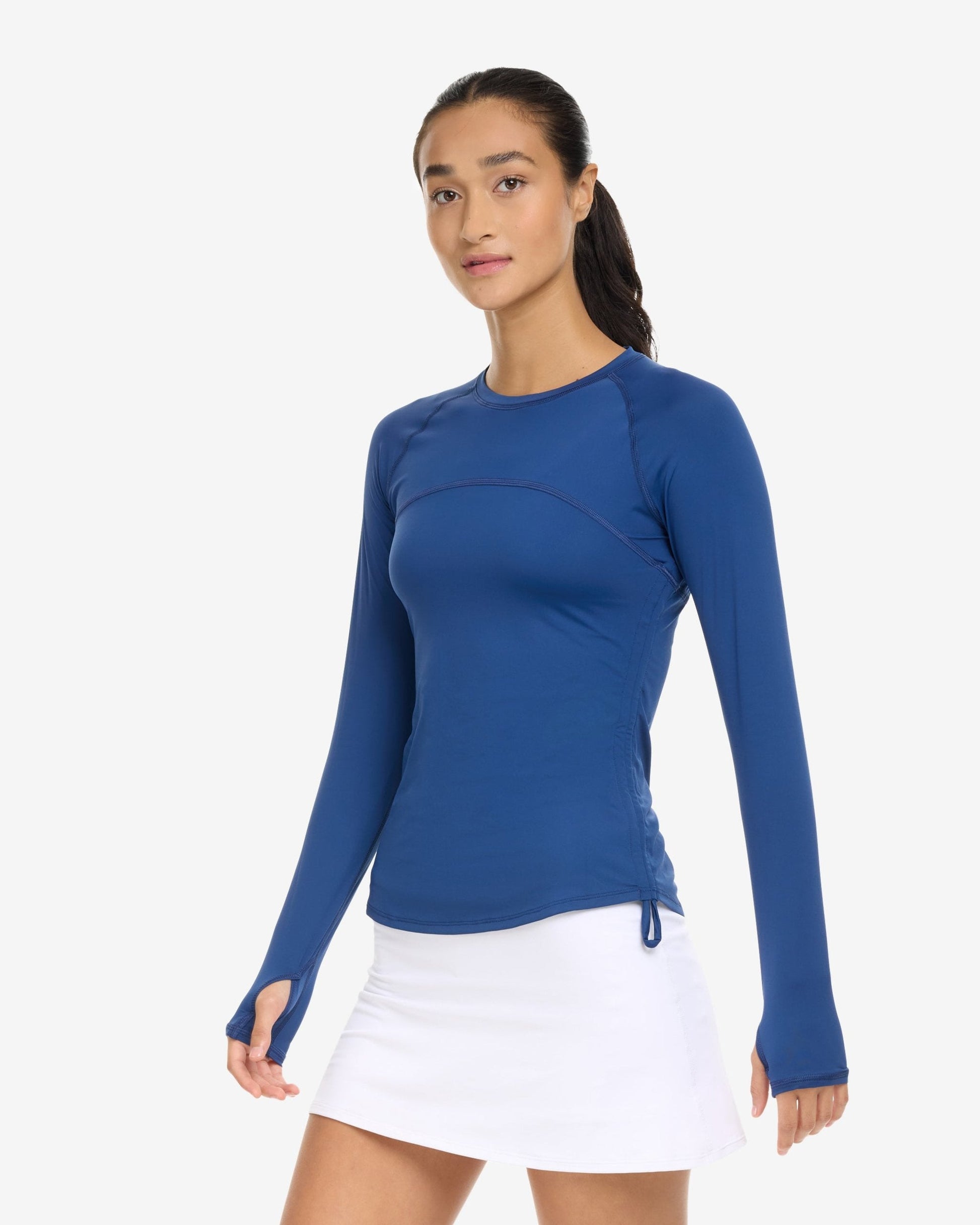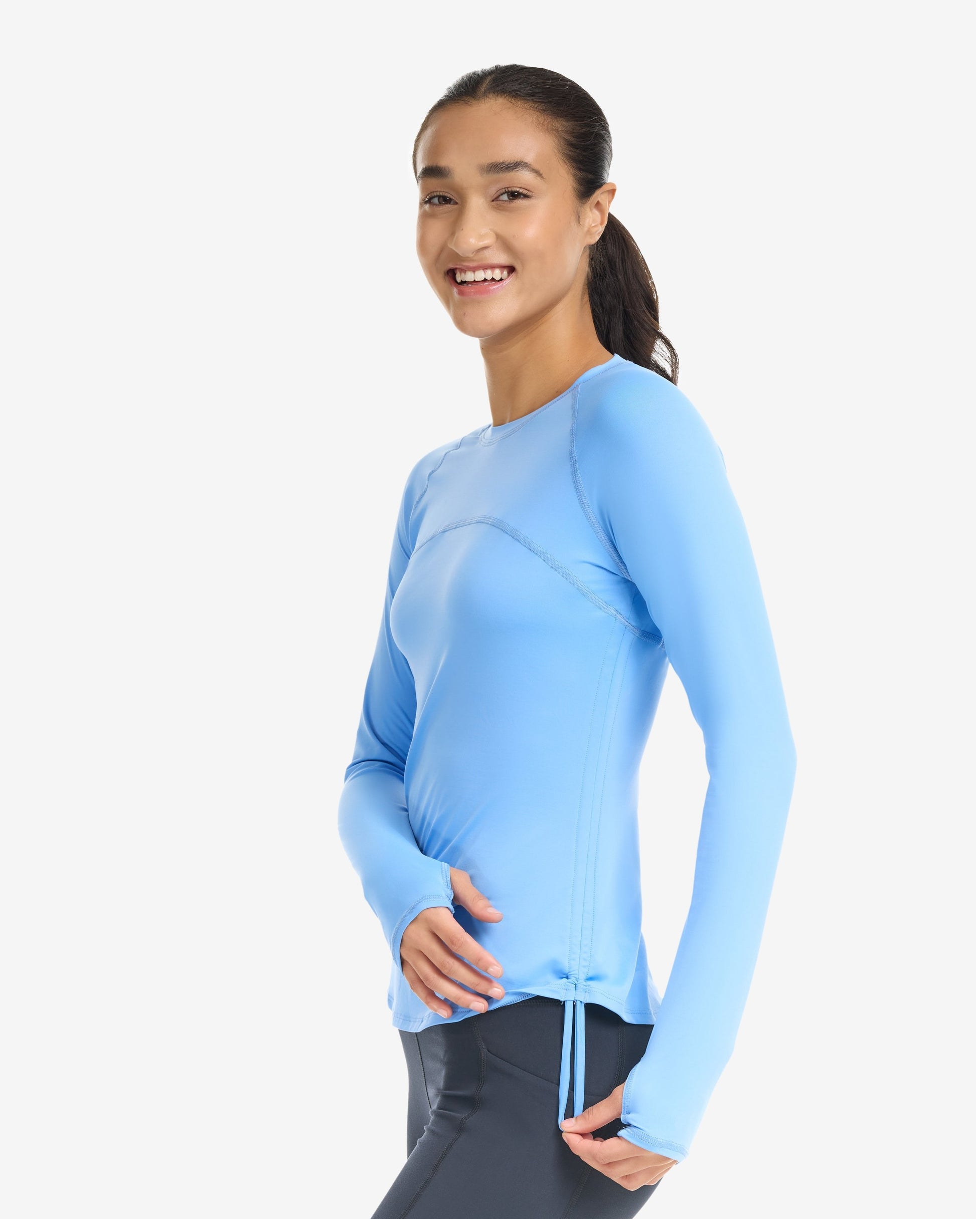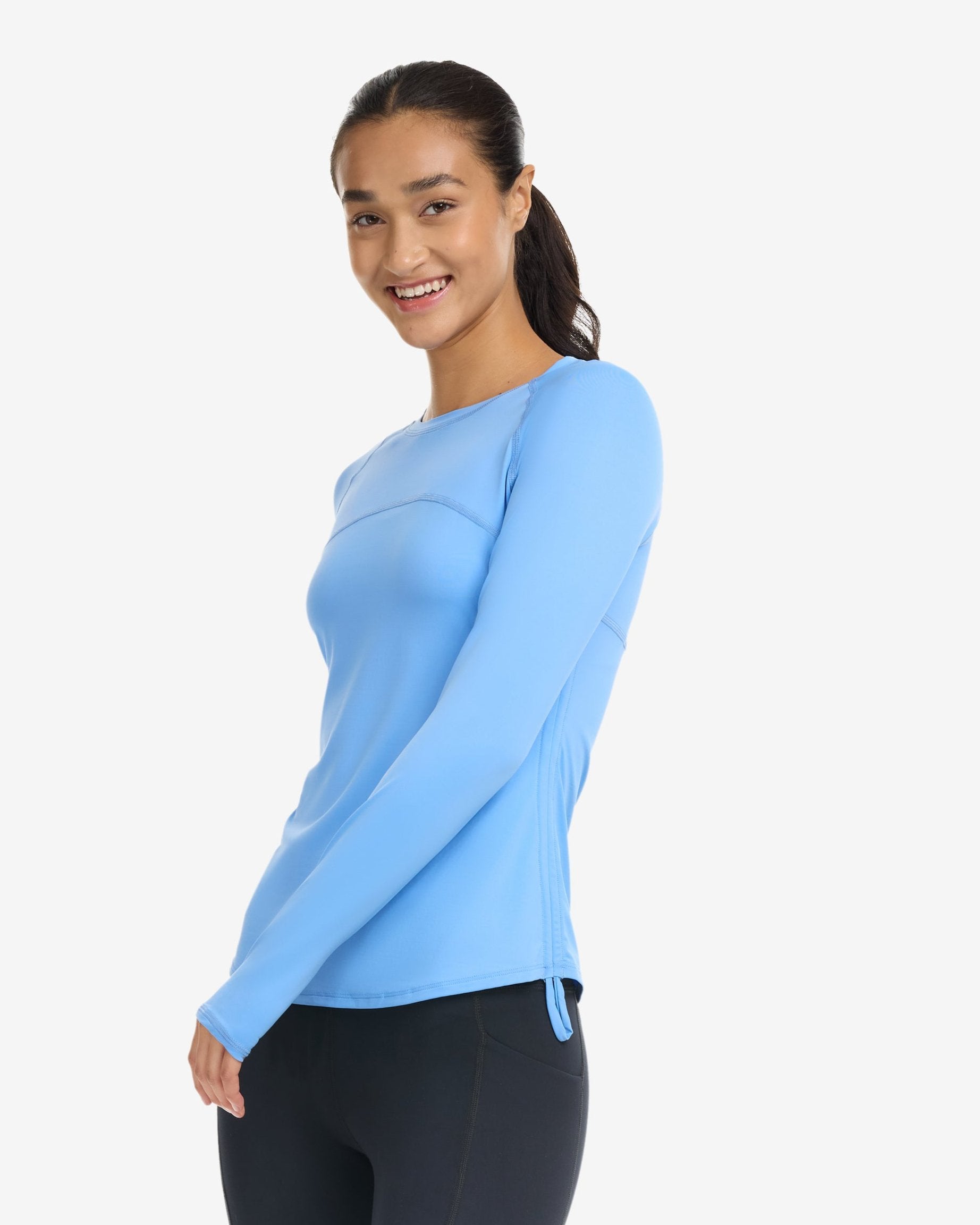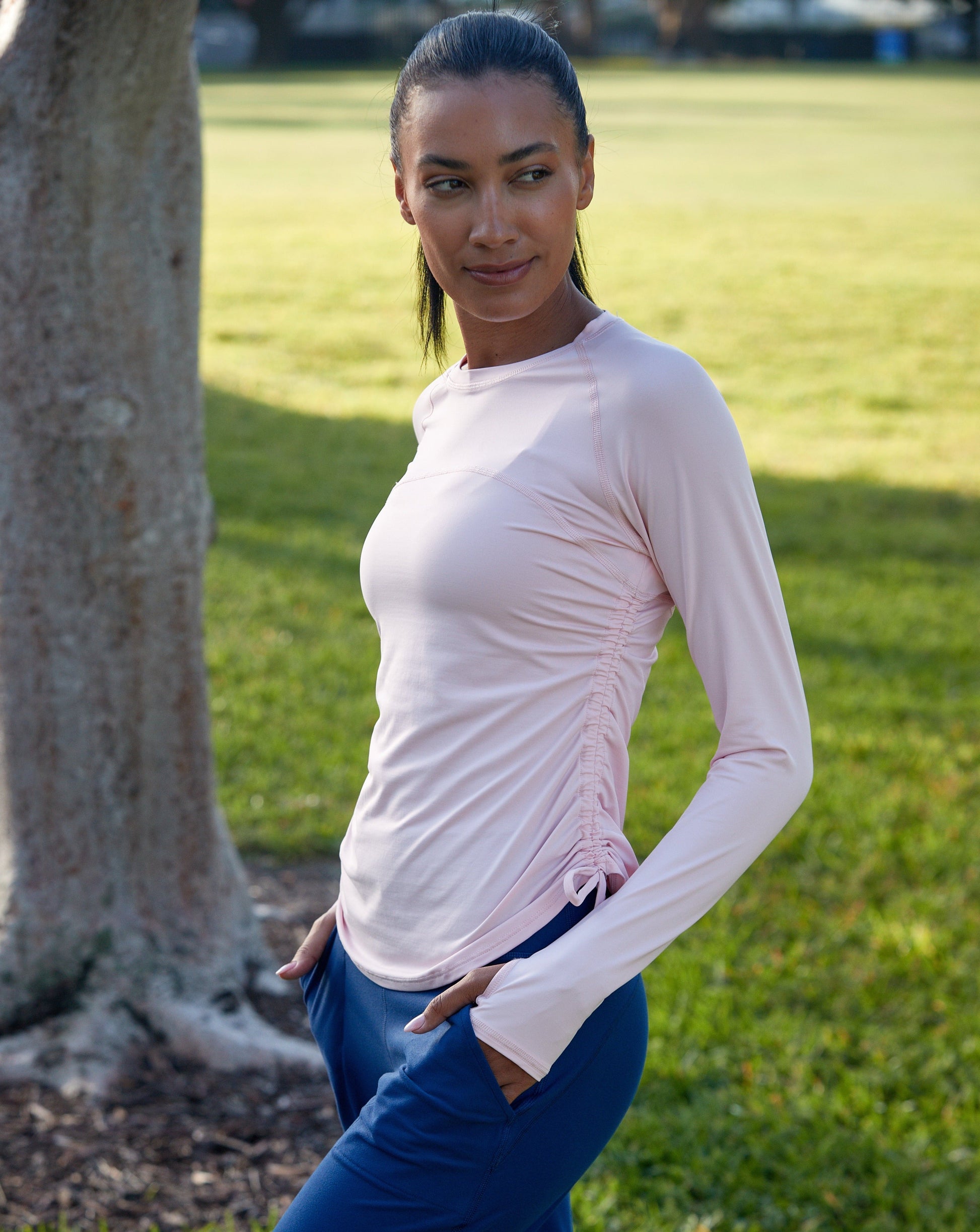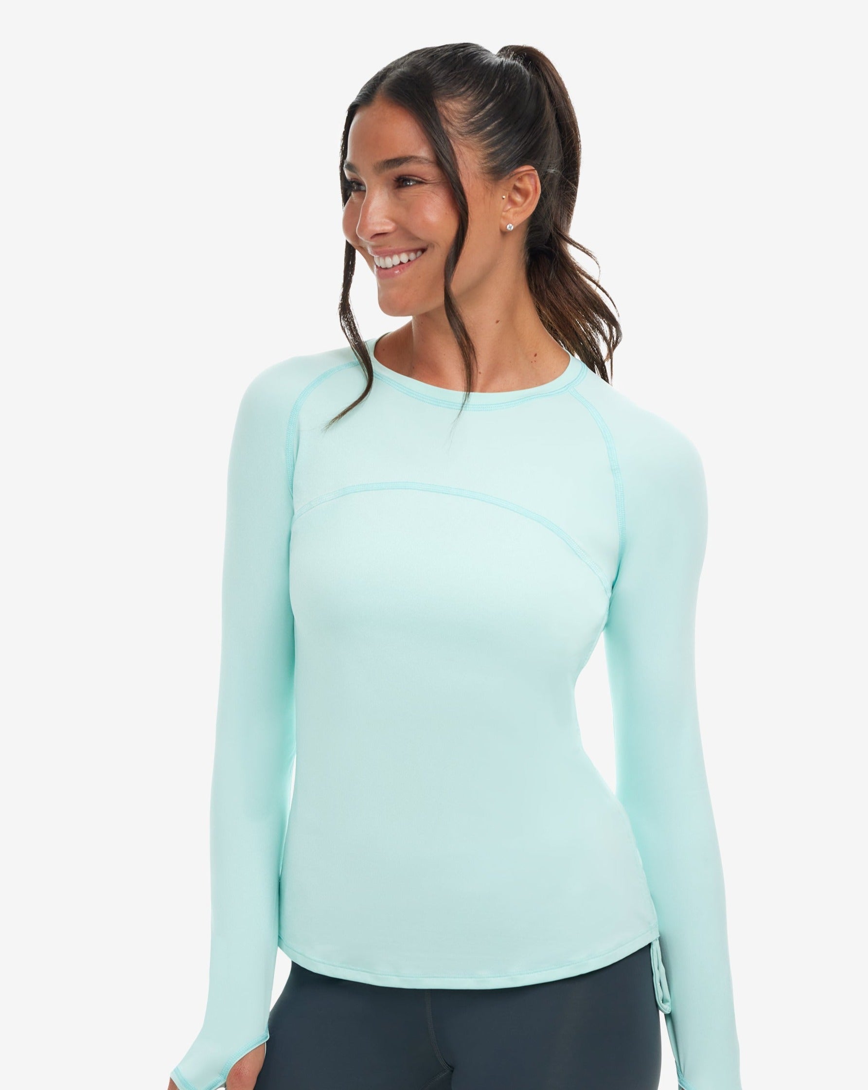 A staple piece to have as part of your athleisure wardrobe. This crew long sleeve UPF Shirt has drawstring for adjustable length. The side ruching allows you to wear the shirt as long or as short as you like. This indispensable, multi-functional piece looks great with joggers, pants or BloqUV tights and can also serve as a swim shirt or rash guard. Enjoy SPF protection while playing tennis, pickle ball, paddle boarding, boating, running, swimming, walking or shopping.