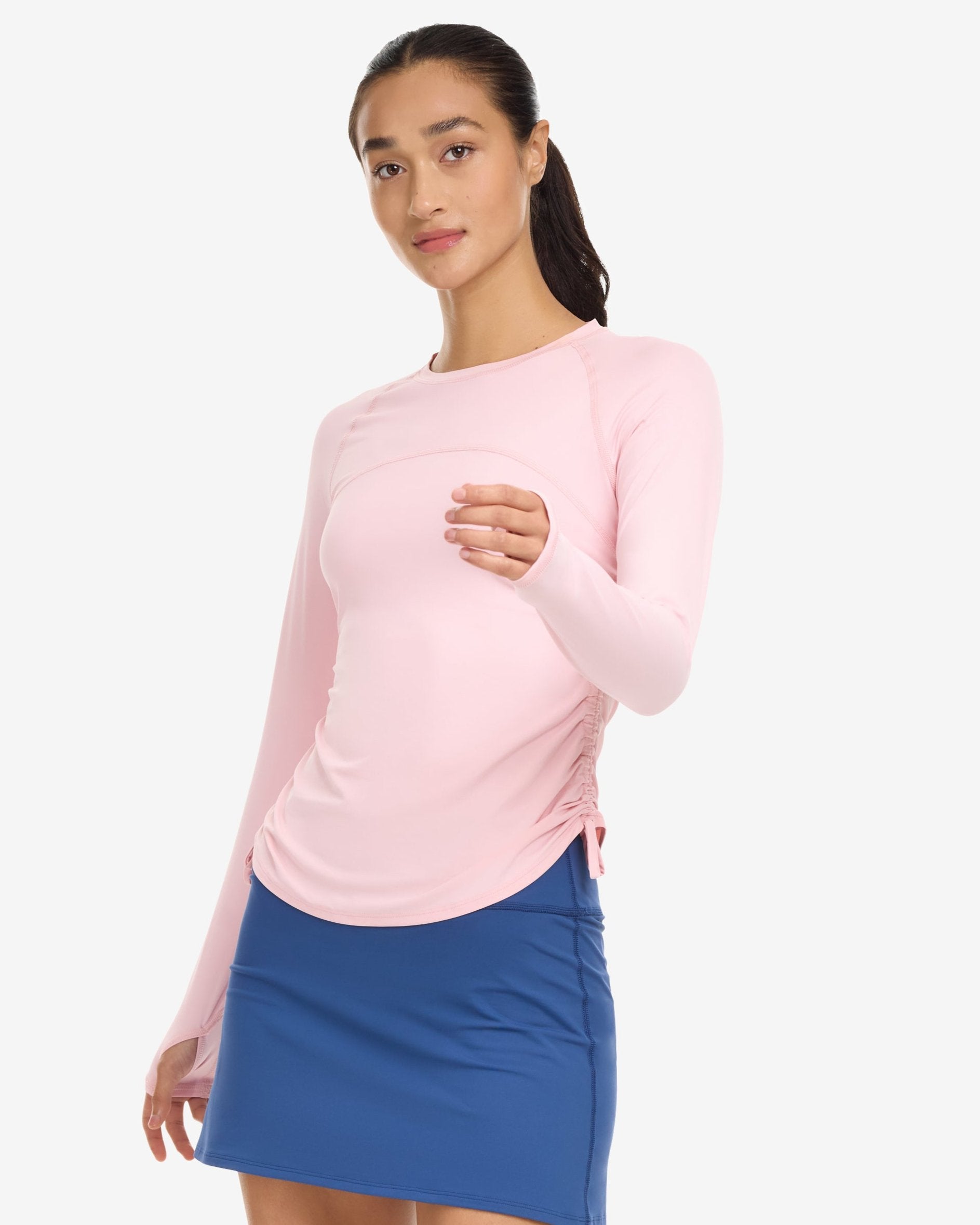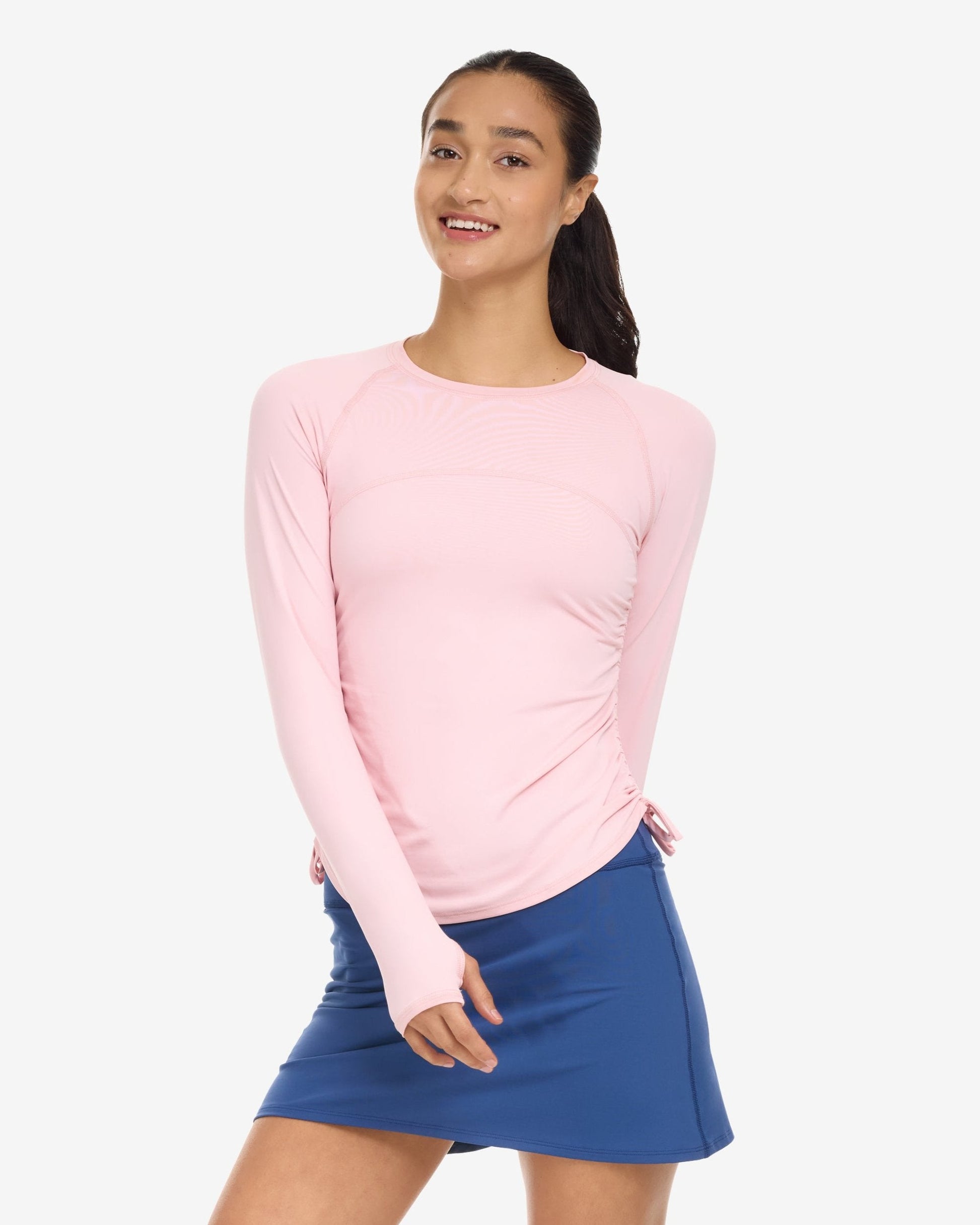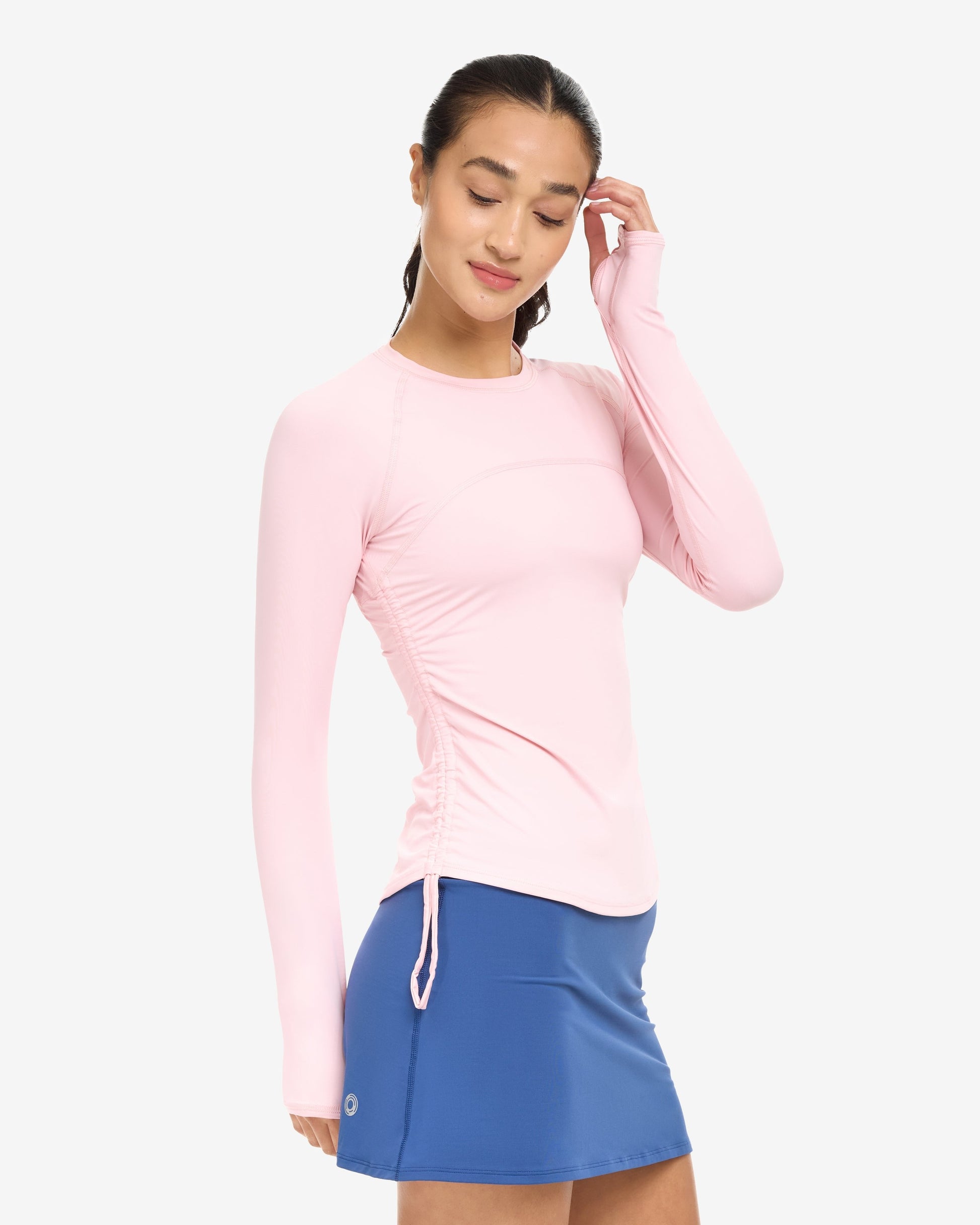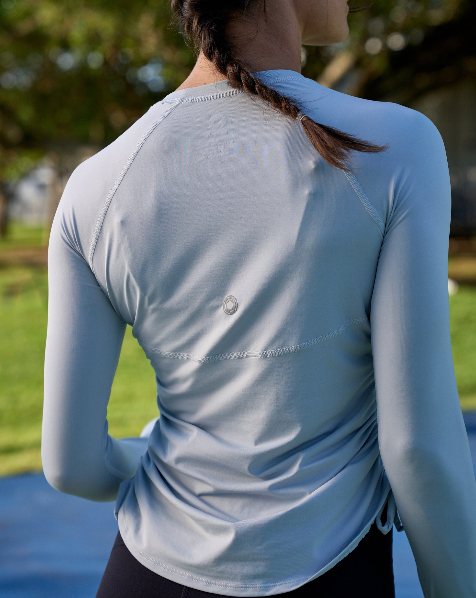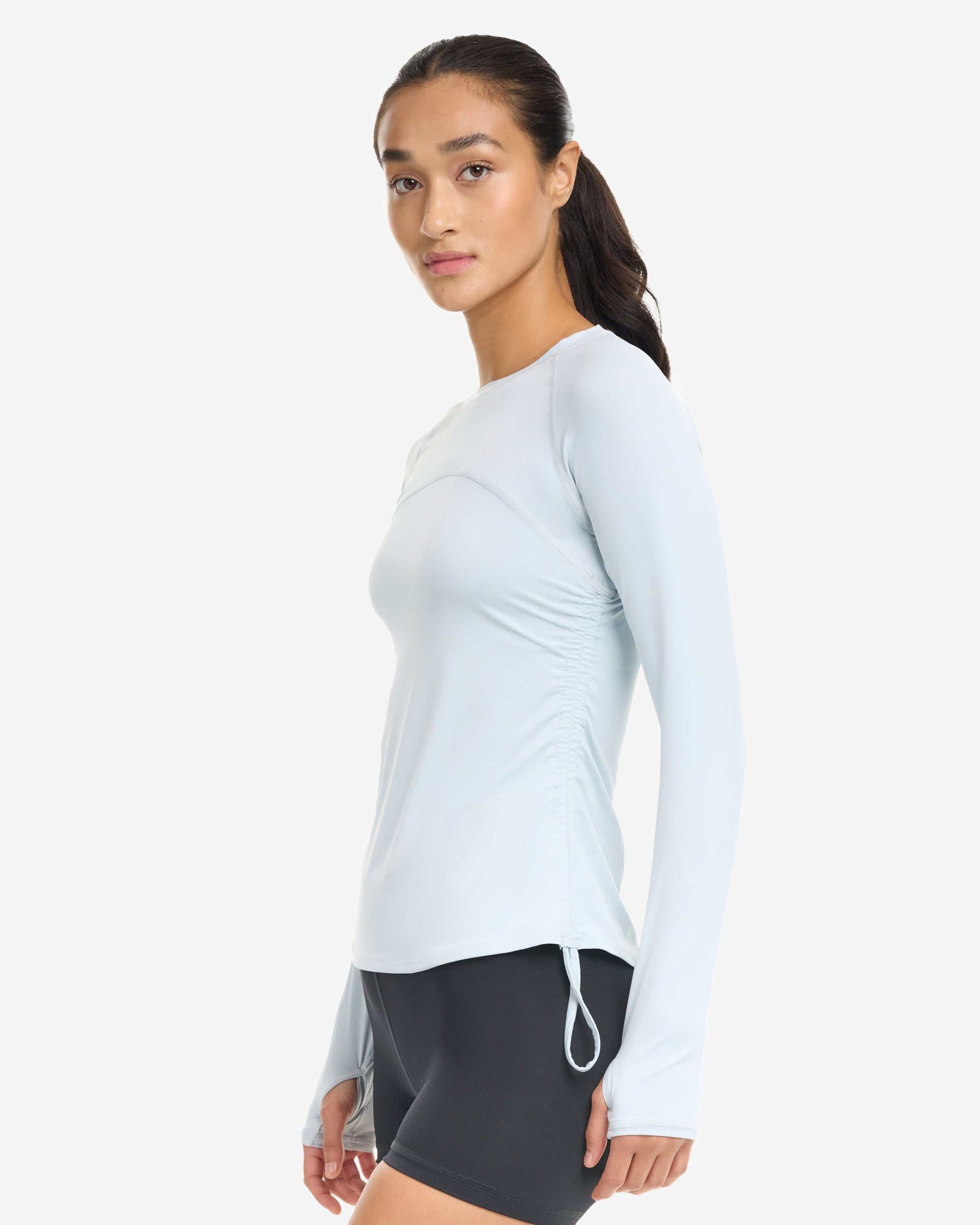 A staple piece to have as part of your athleisure wardrobe. This crew long sleeve UPF Shirt has drawstring for adjustable length. The side ruching allows you to wear the shirt as long or as short as you like. This indispensable, multi-functional piece looks great with joggers, pants or BloqUV tights and can also serve as a swim shirt or rash guard. Enjoy SPF protection while playing tennis, pickle ball, paddle boarding, boating, running, swimming, walking or shopping.