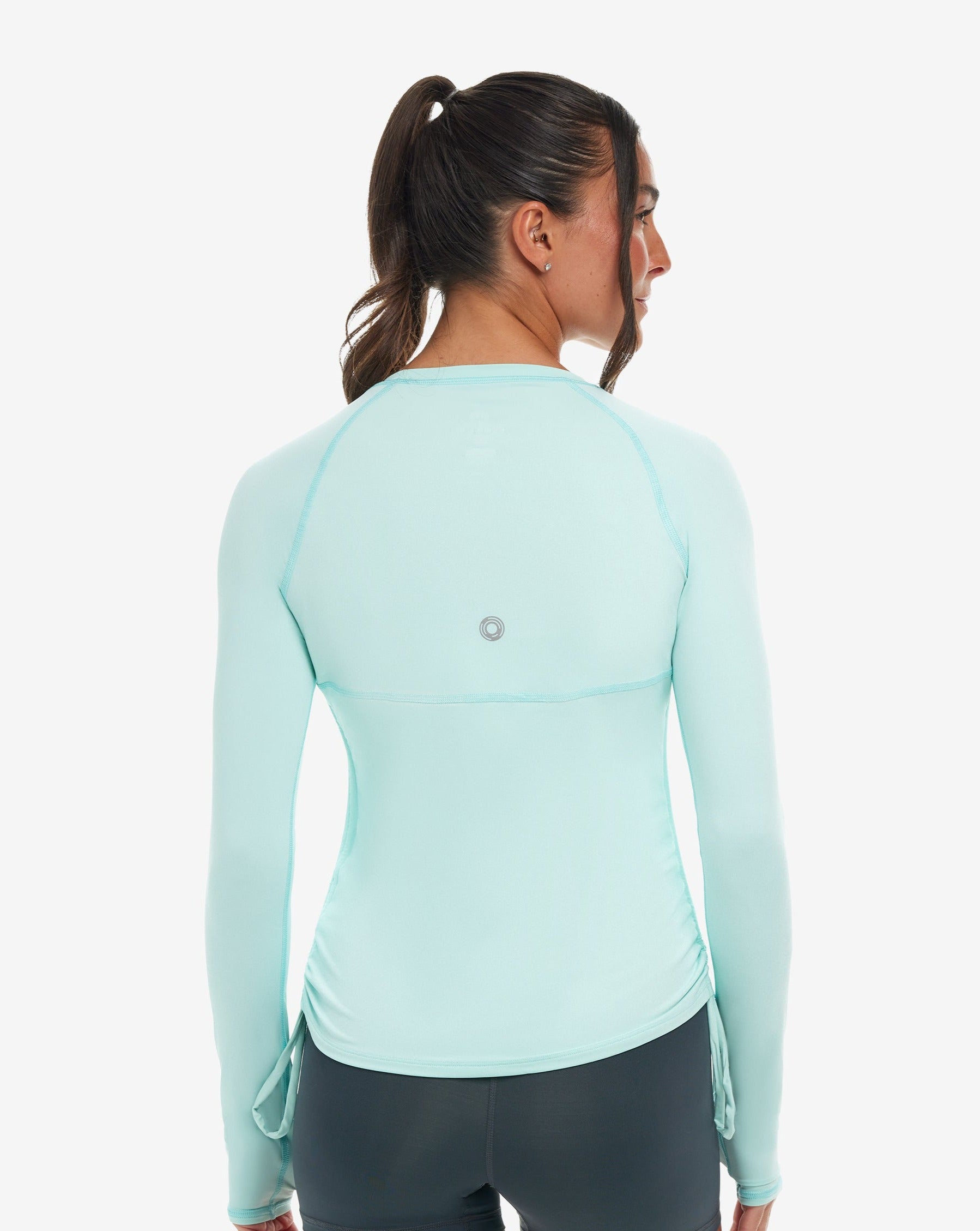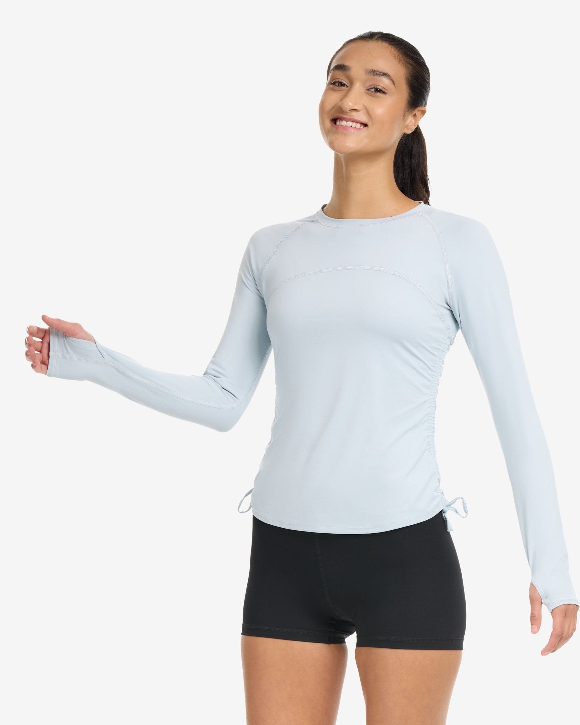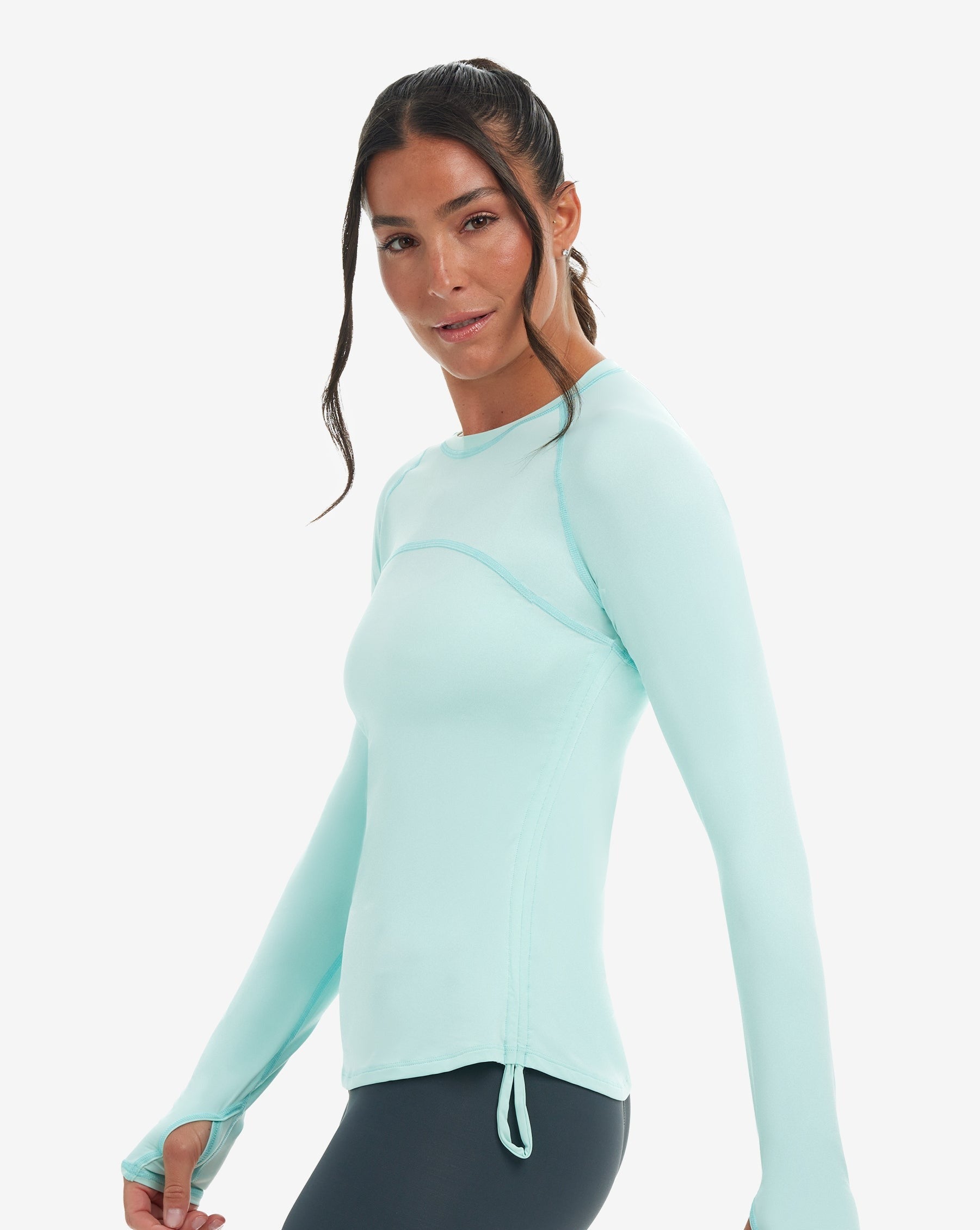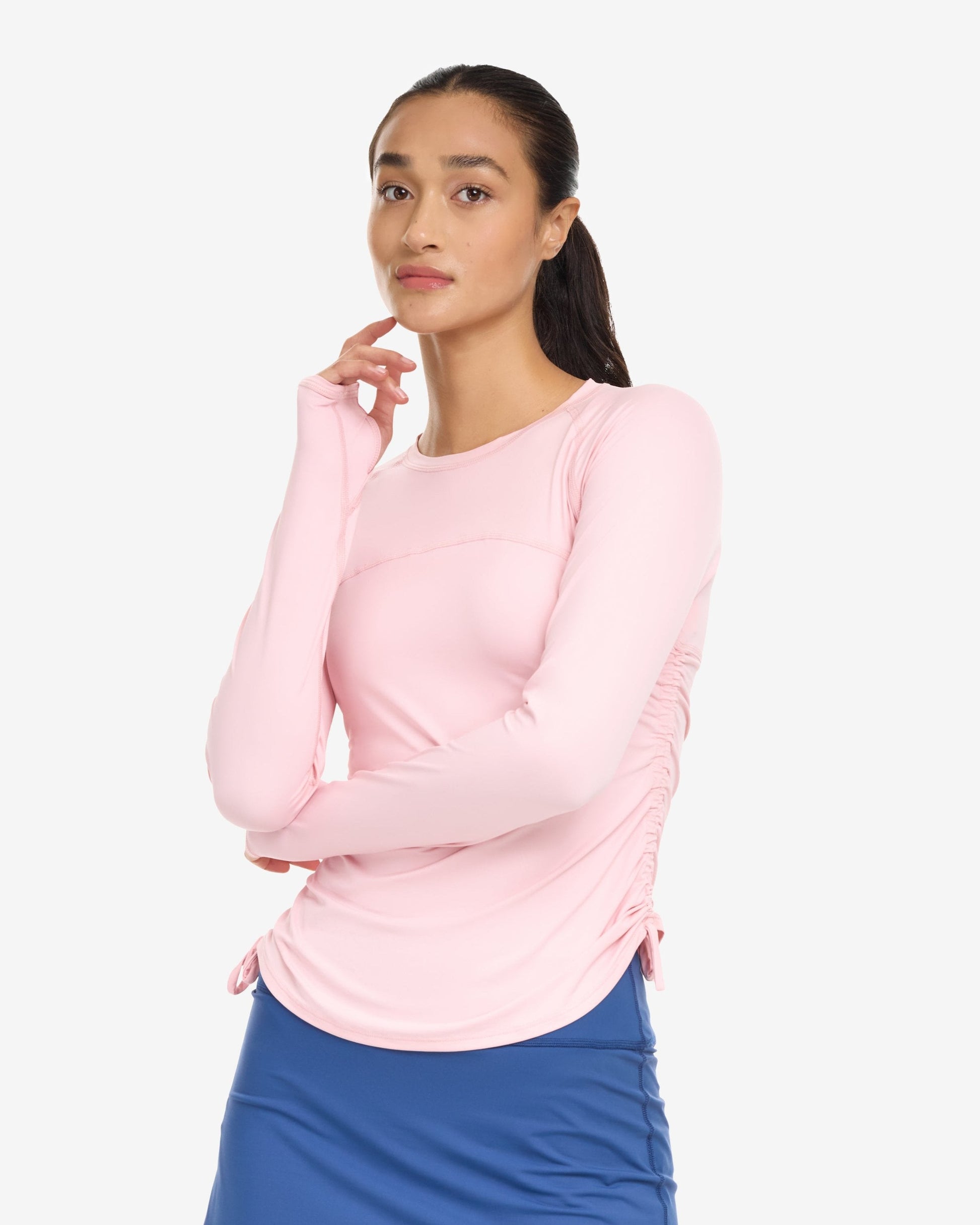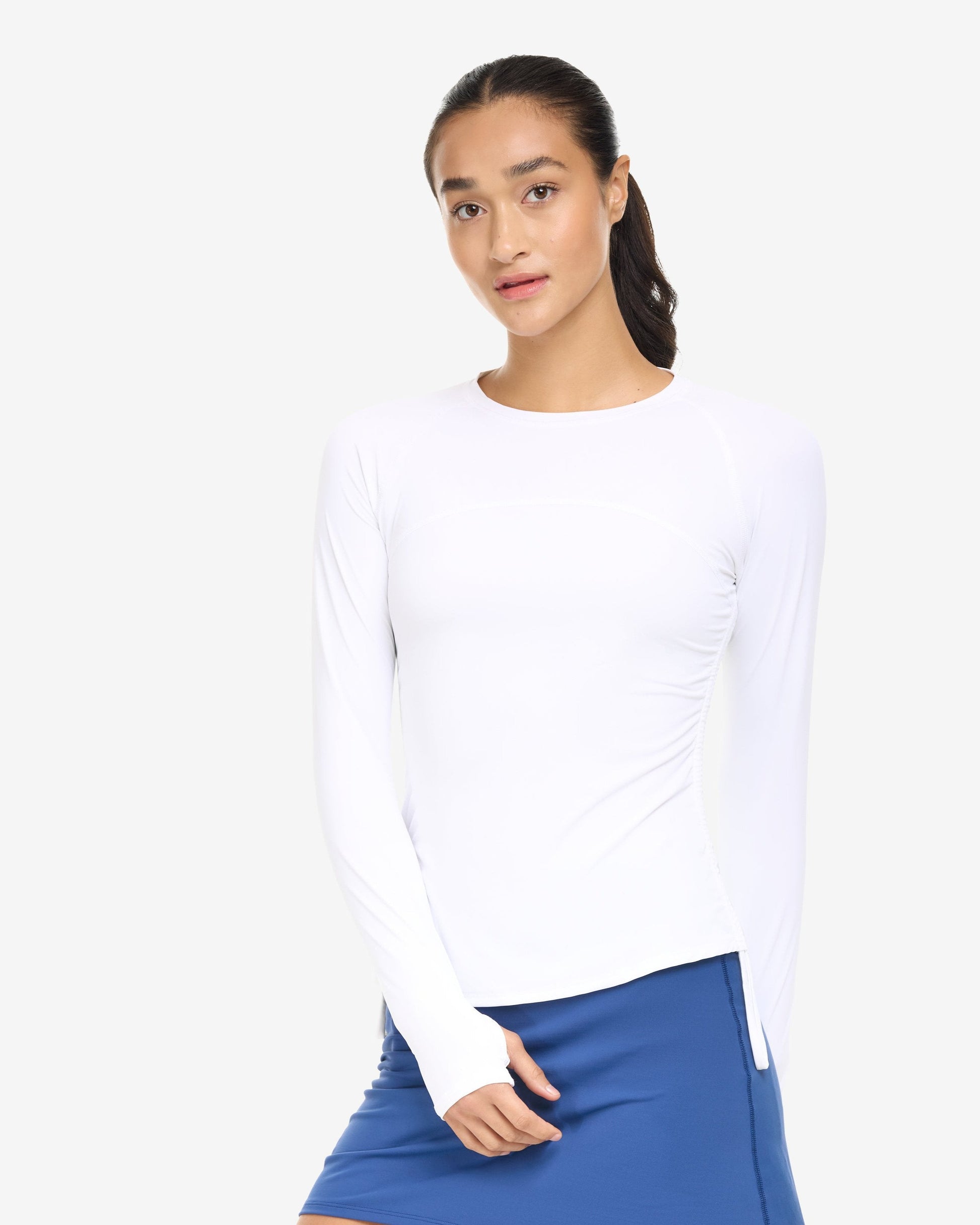 A staple piece to have as part of your athleisure wardrobe. This crew long sleeve UPF Shirt has drawstring for adjustable length. The side ruching allows you to wear the shirt as long or as short as you like. This indispensable, multi-functional piece looks great with joggers, pants or BloqUV tights and can also serve as a swim shirt or rash guard. Enjoy SPF protection while playing tennis, pickle ball, paddle boarding, boating, running, swimming, walking or shopping.