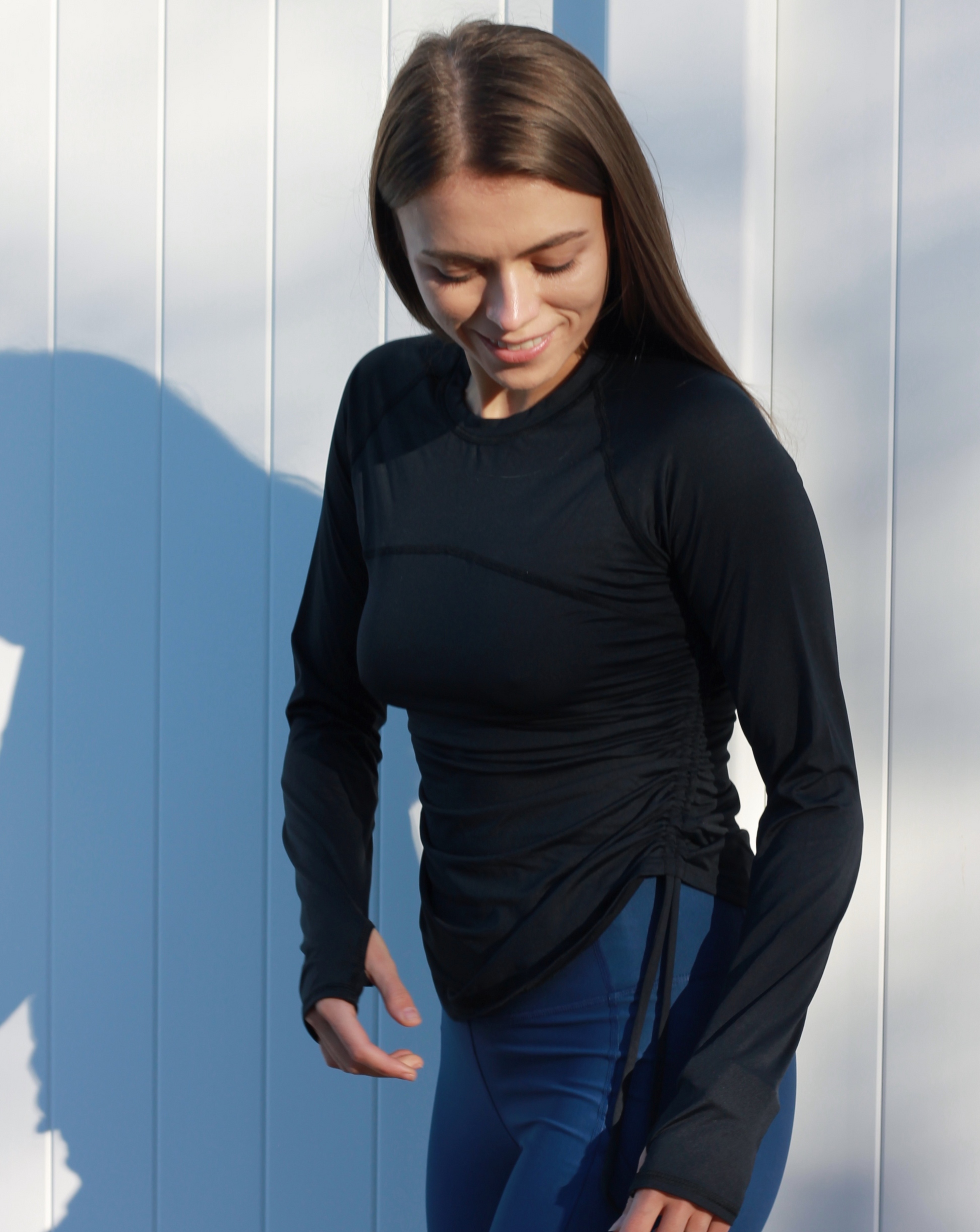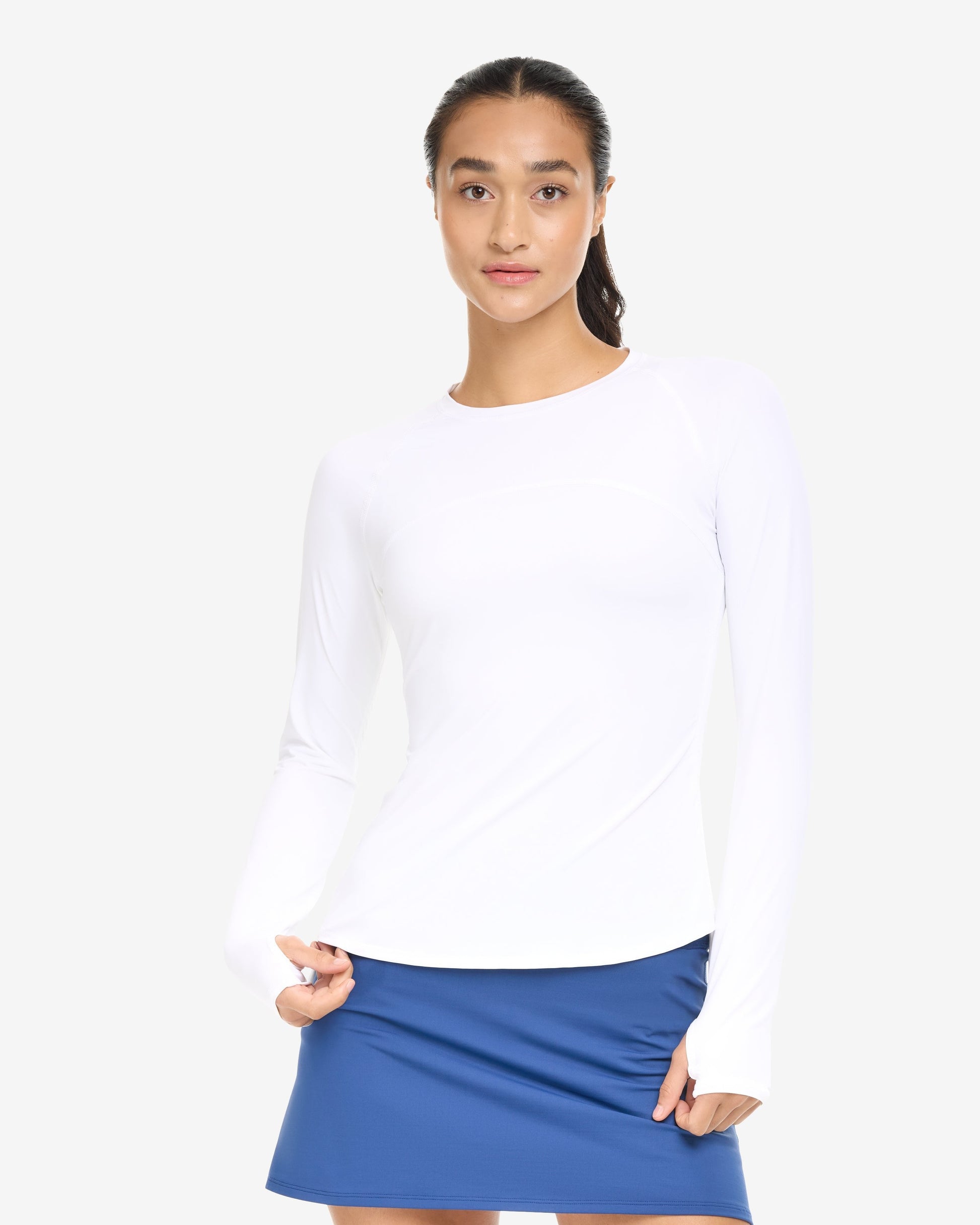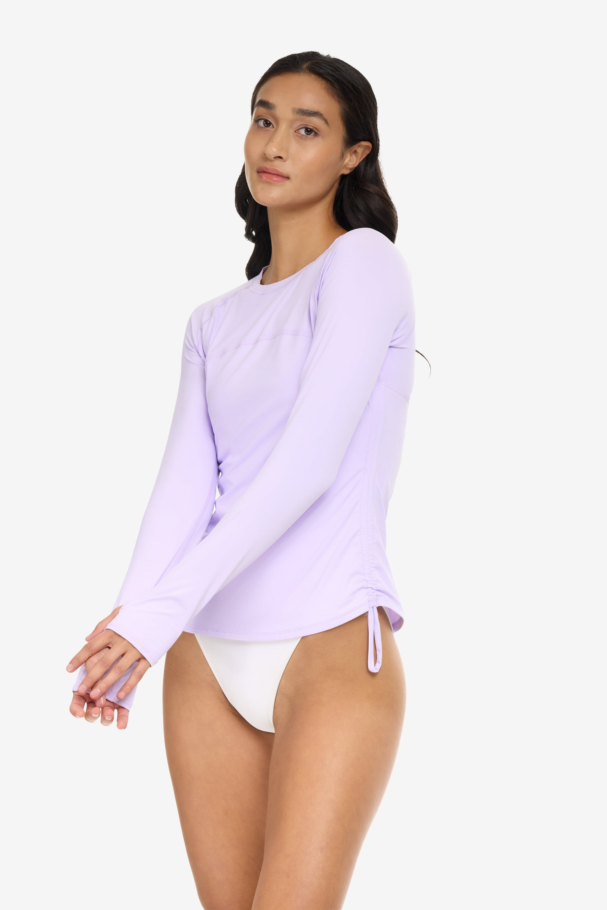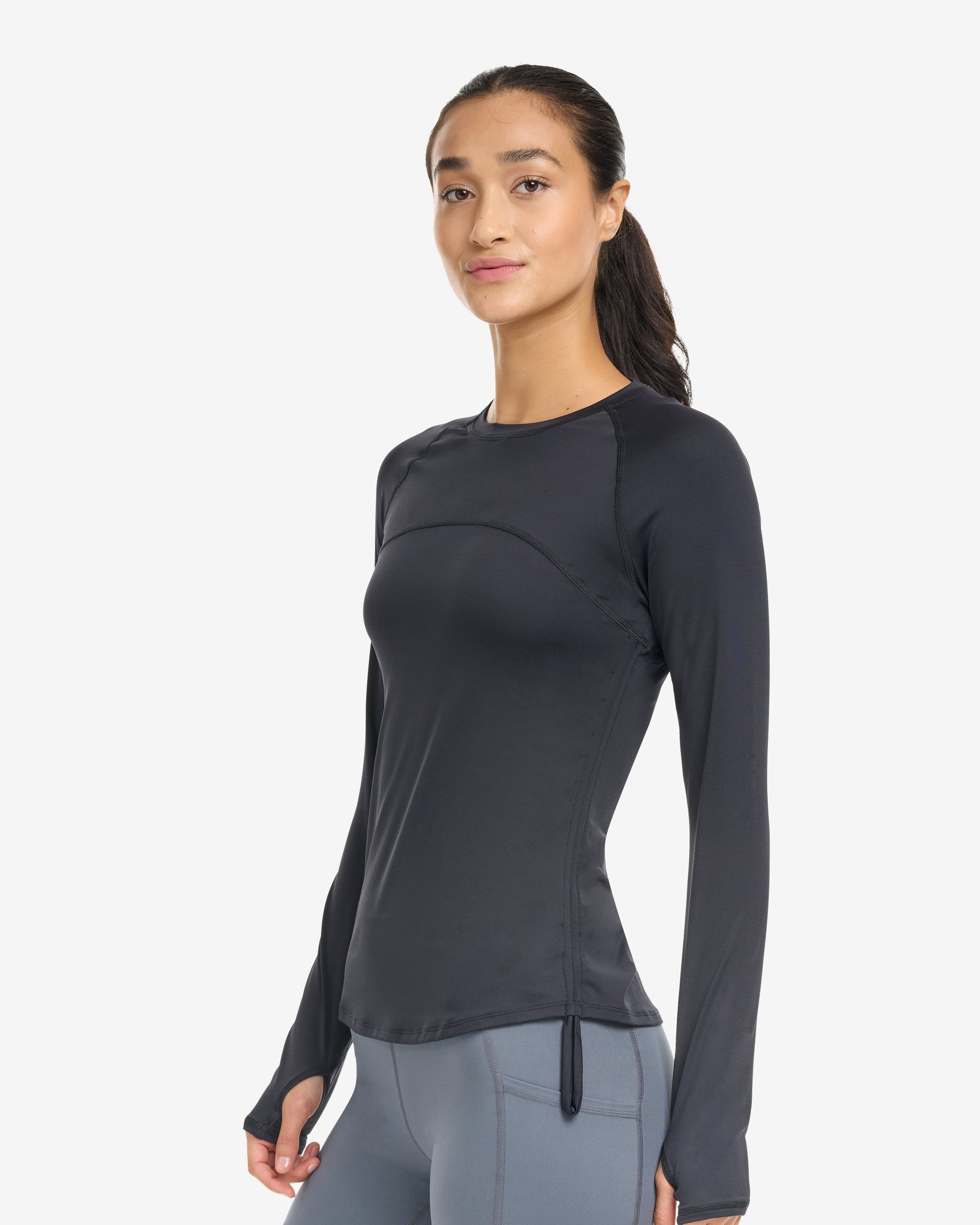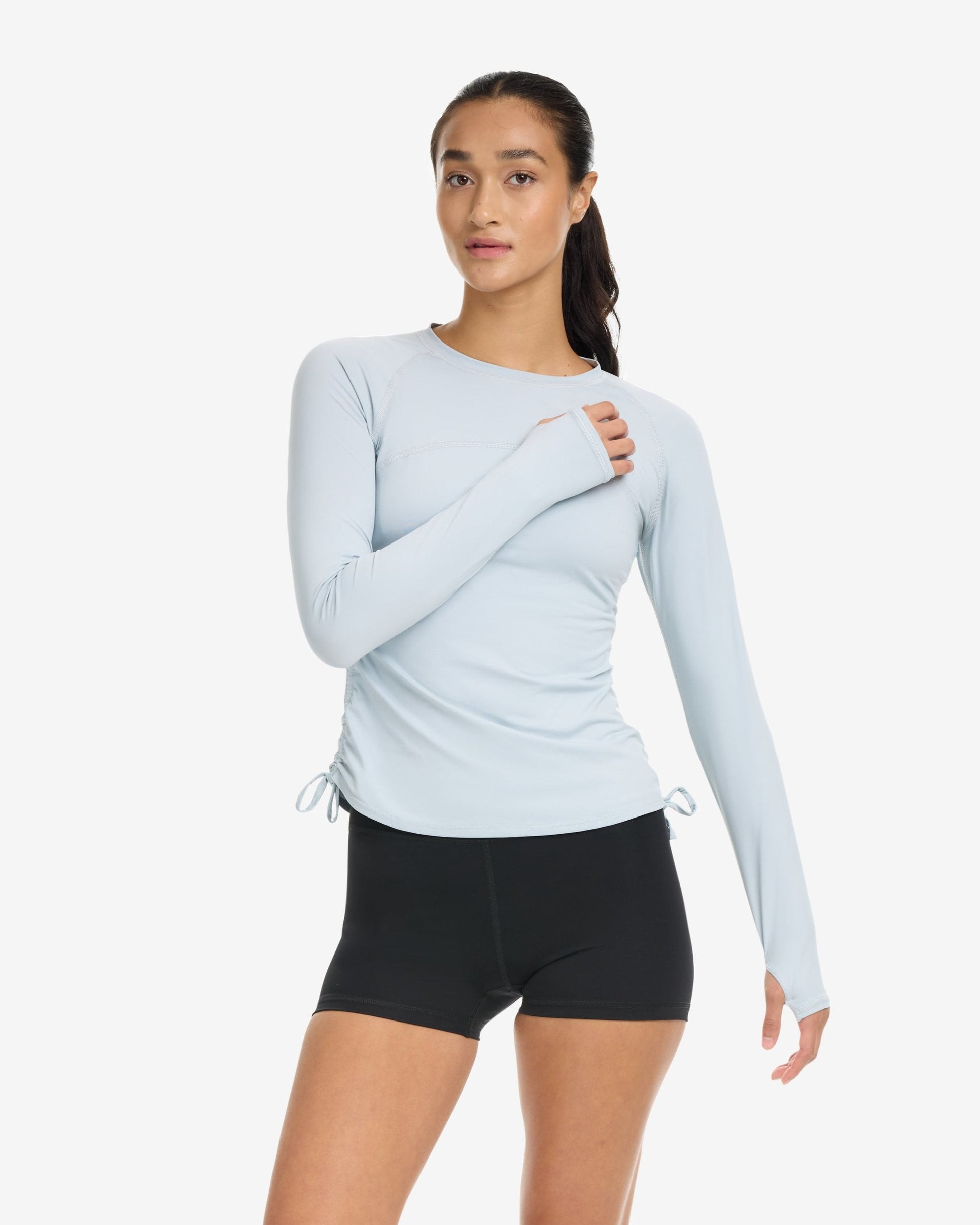 A staple piece to have as part of your athleisure wardrobe. This crew long sleeve UPF Shirt has drawstring for adjustable length. The side ruching allows you to wear the shirt as long or as short as you like. This indispensable, multi-functional piece looks great with joggers, pants or BloqUV tights and can also serve as a swim shirt or rash guard. Enjoy SPF protection while playing tennis, pickle ball, paddle boarding, boating, running, swimming, walking or shopping.