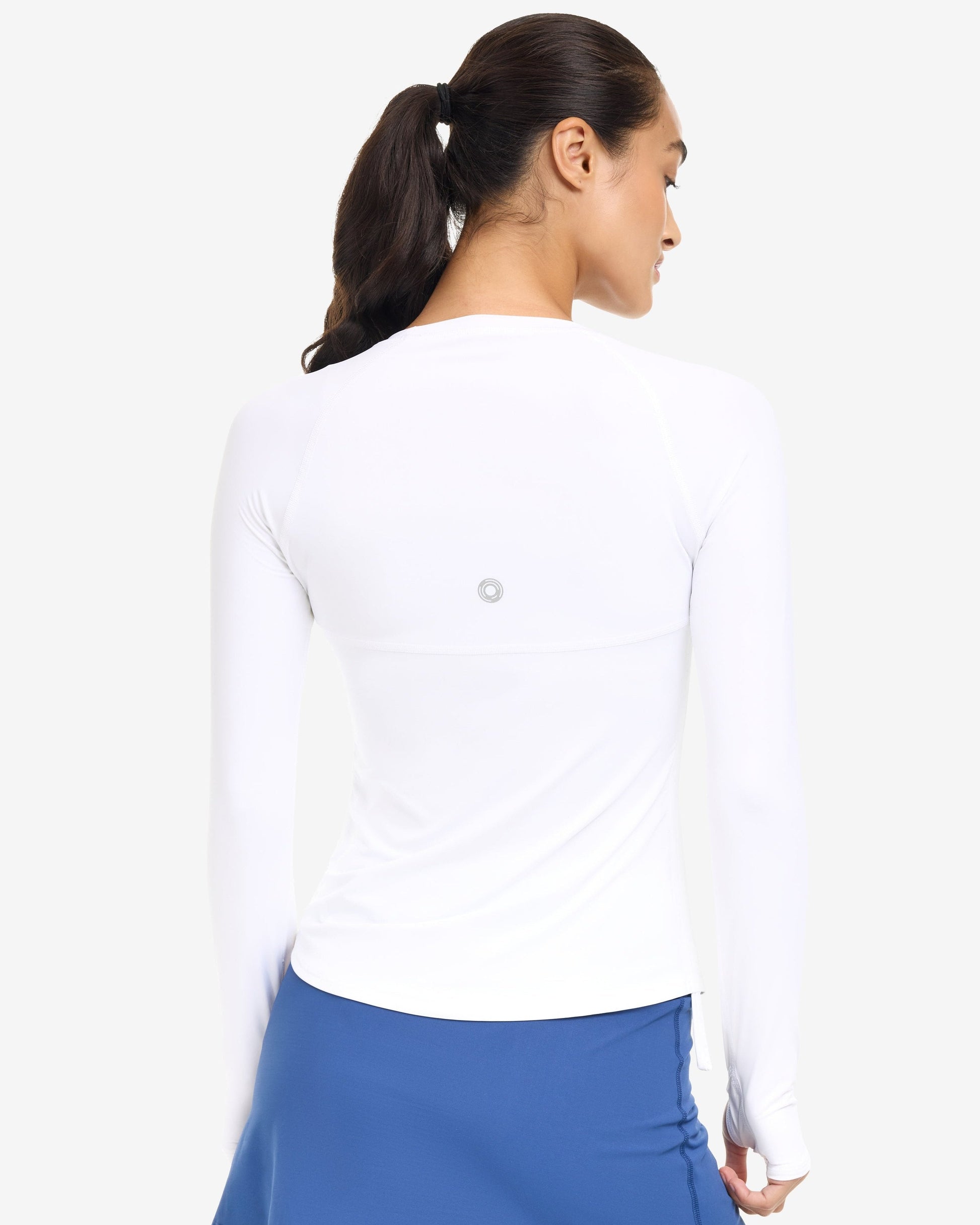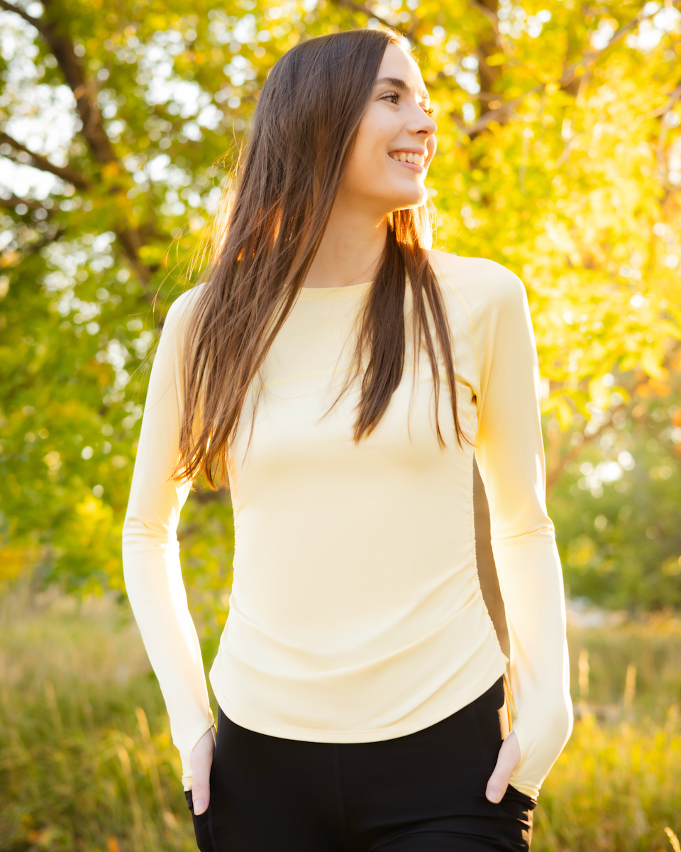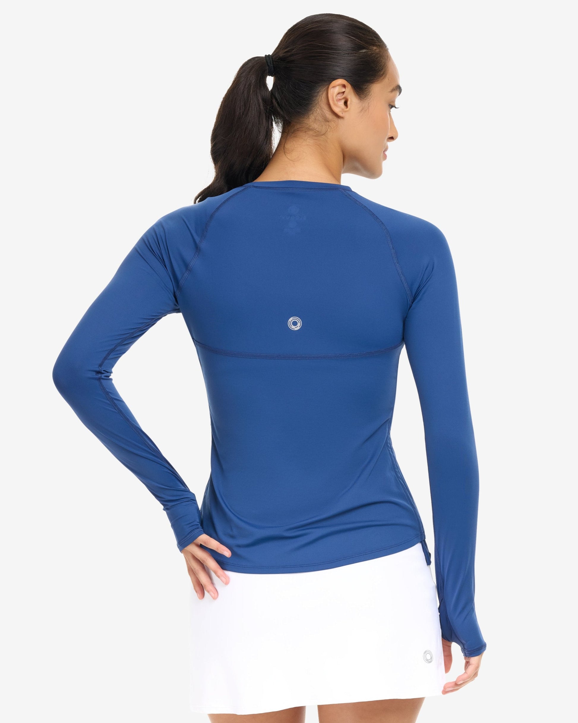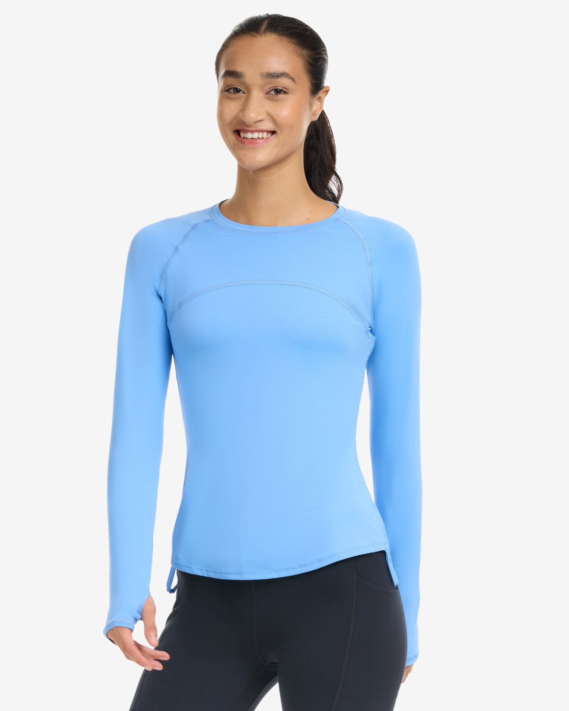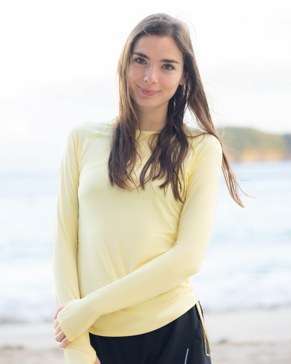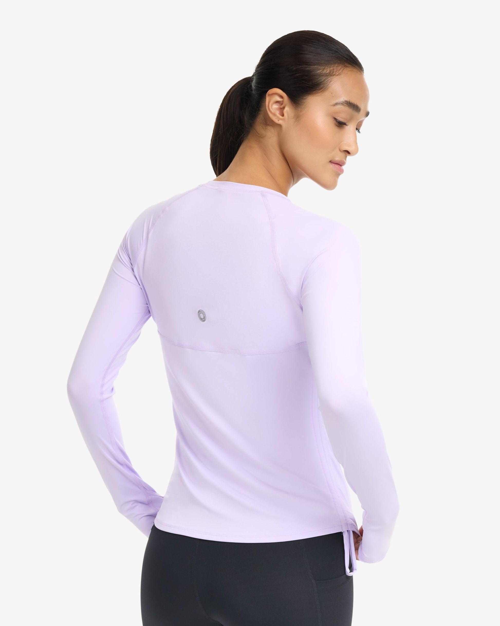 A staple piece to have as part of your athleisure wardrobe. This crew long sleeve UPF Shirt has drawstring for adjustable length. The side ruching allows you to wear the shirt as long or as short as you like. This indispensable, multi-functional piece looks great with joggers, pants or BloqUV tights and can also serve as a swim shirt or rash guard. Enjoy SPF protection while playing tennis, pickle ball, paddle boarding, boating, running, swimming, walking or shopping.