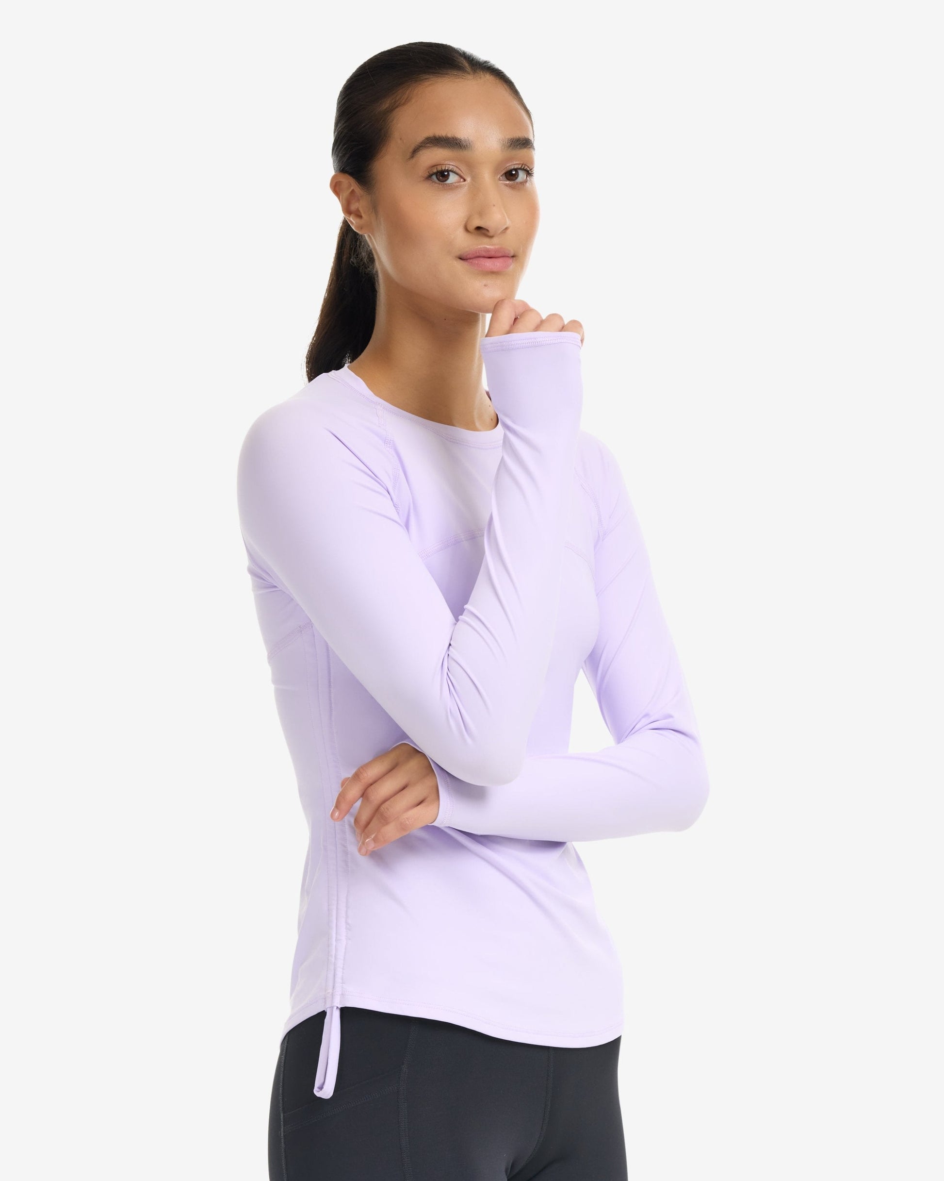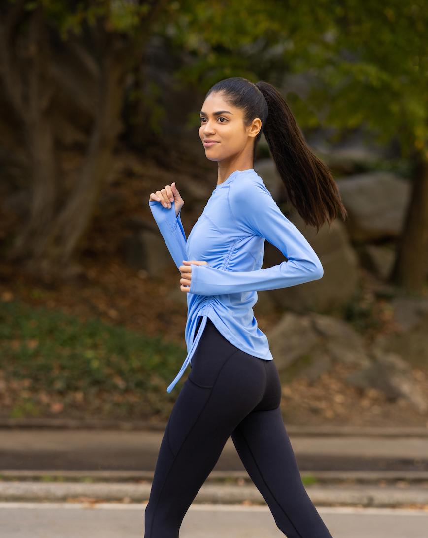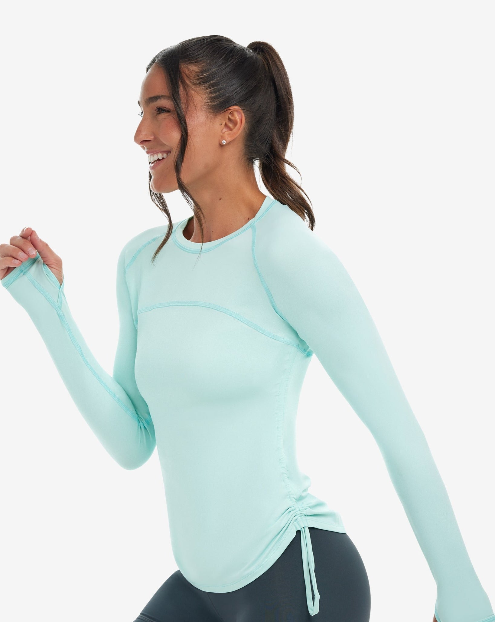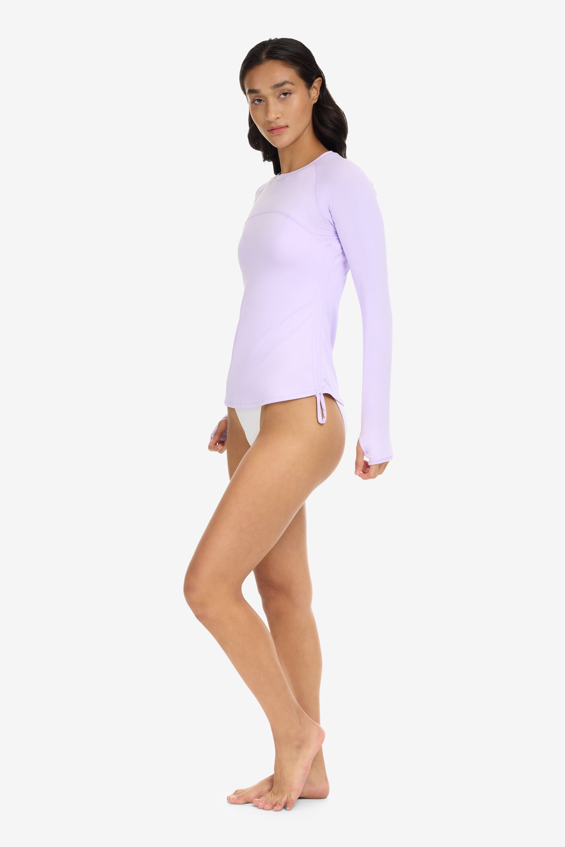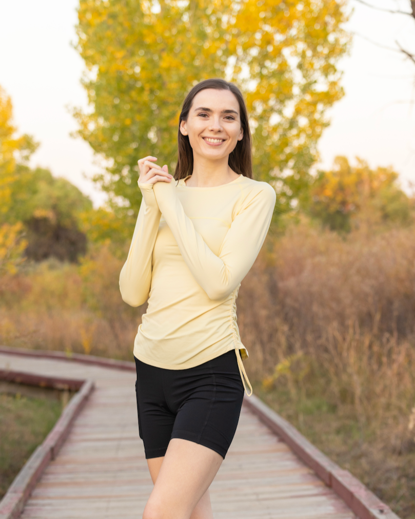 A staple piece to have as part of your athleisure wardrobe. This crew long sleeve UPF Shirt has drawstring for adjustable length. The side ruching allows you to wear the shirt as long or as short as you like. This indispensable, multi-functional piece looks great with joggers, pants or BloqUV tights and can also serve as a swim shirt or rash guard. Enjoy SPF protection while playing tennis, pickle ball, paddle boarding, boating, running, swimming, walking or shopping.