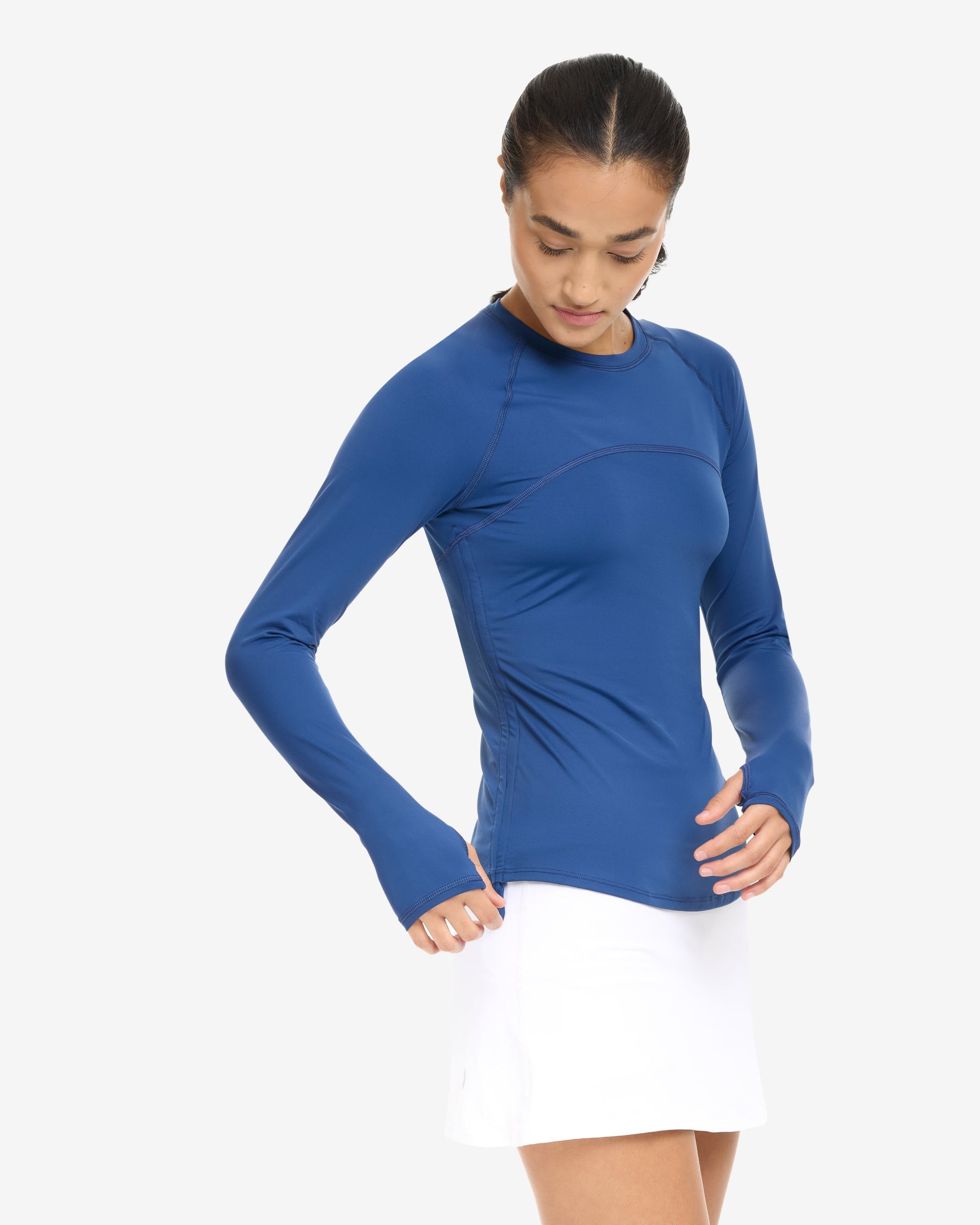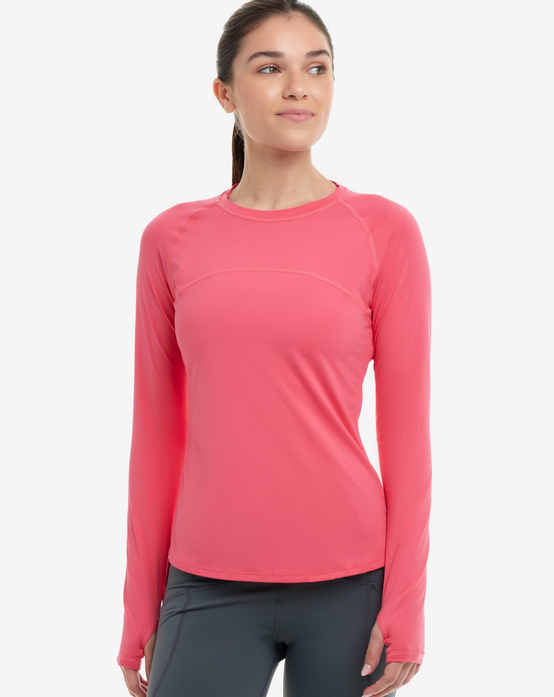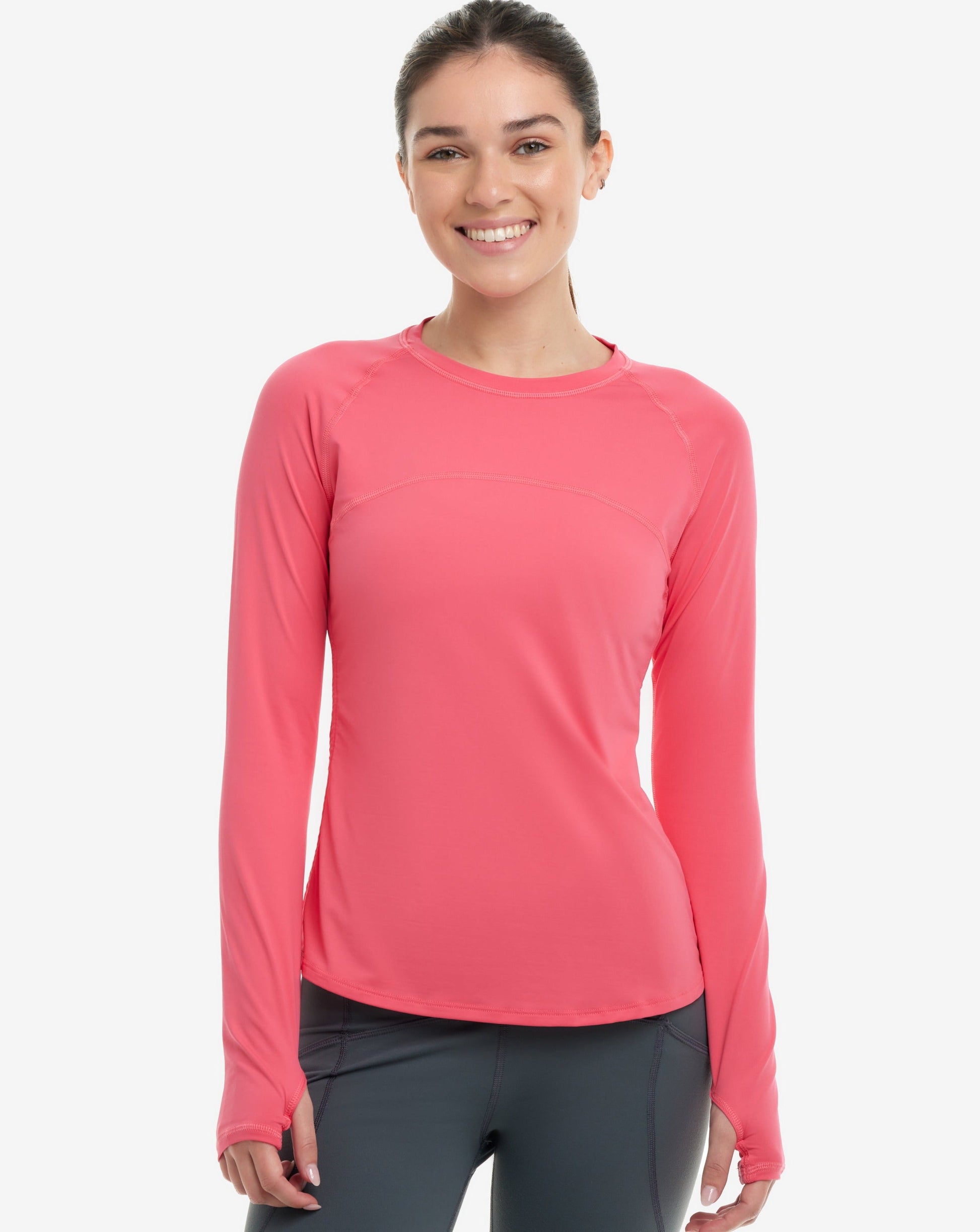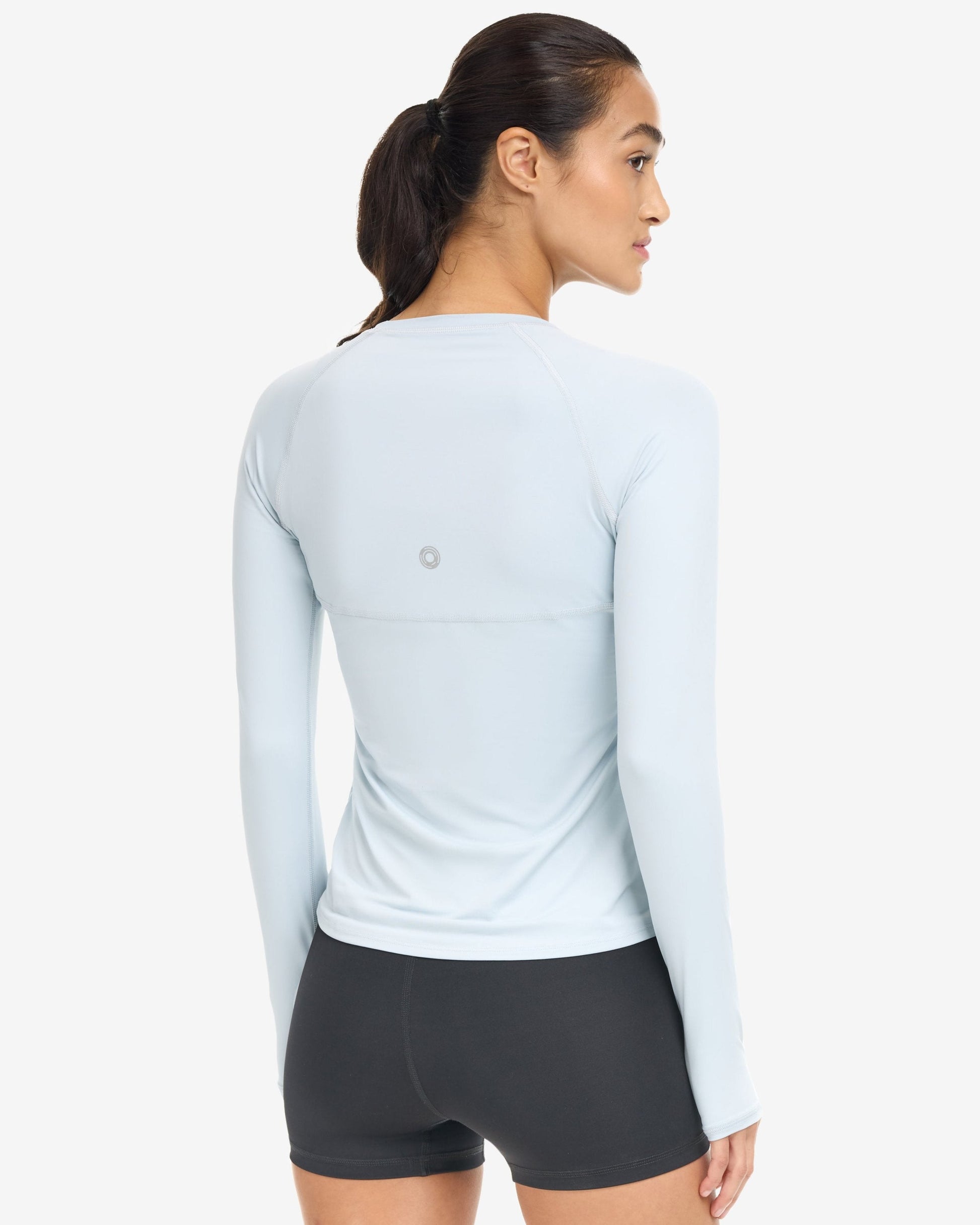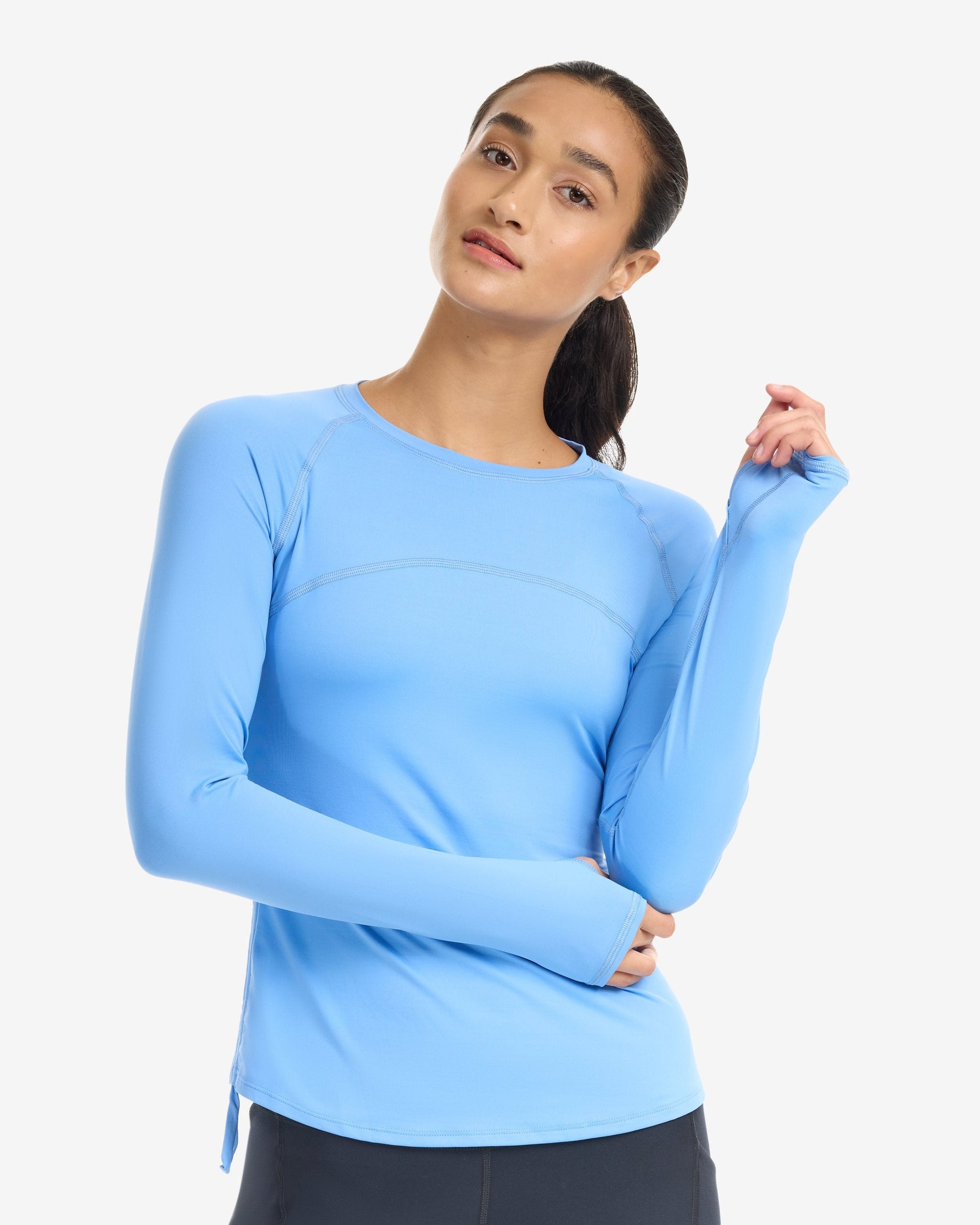 A staple piece to have as part of your athleisure wardrobe. This crew long sleeve UPF Shirt has drawstring for adjustable length. The side ruching allows you to wear the shirt as long or as short as you like. This indispensable, multi-functional piece looks great with joggers, pants or BloqUV tights and can also serve as a swim shirt or rash guard. Enjoy SPF protection while playing tennis, pickle ball, paddle boarding, boating, running, swimming, walking or shopping.