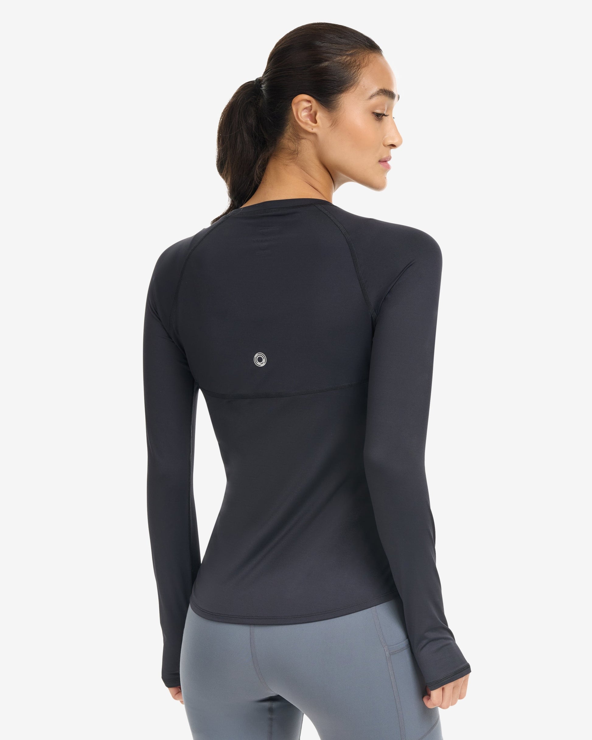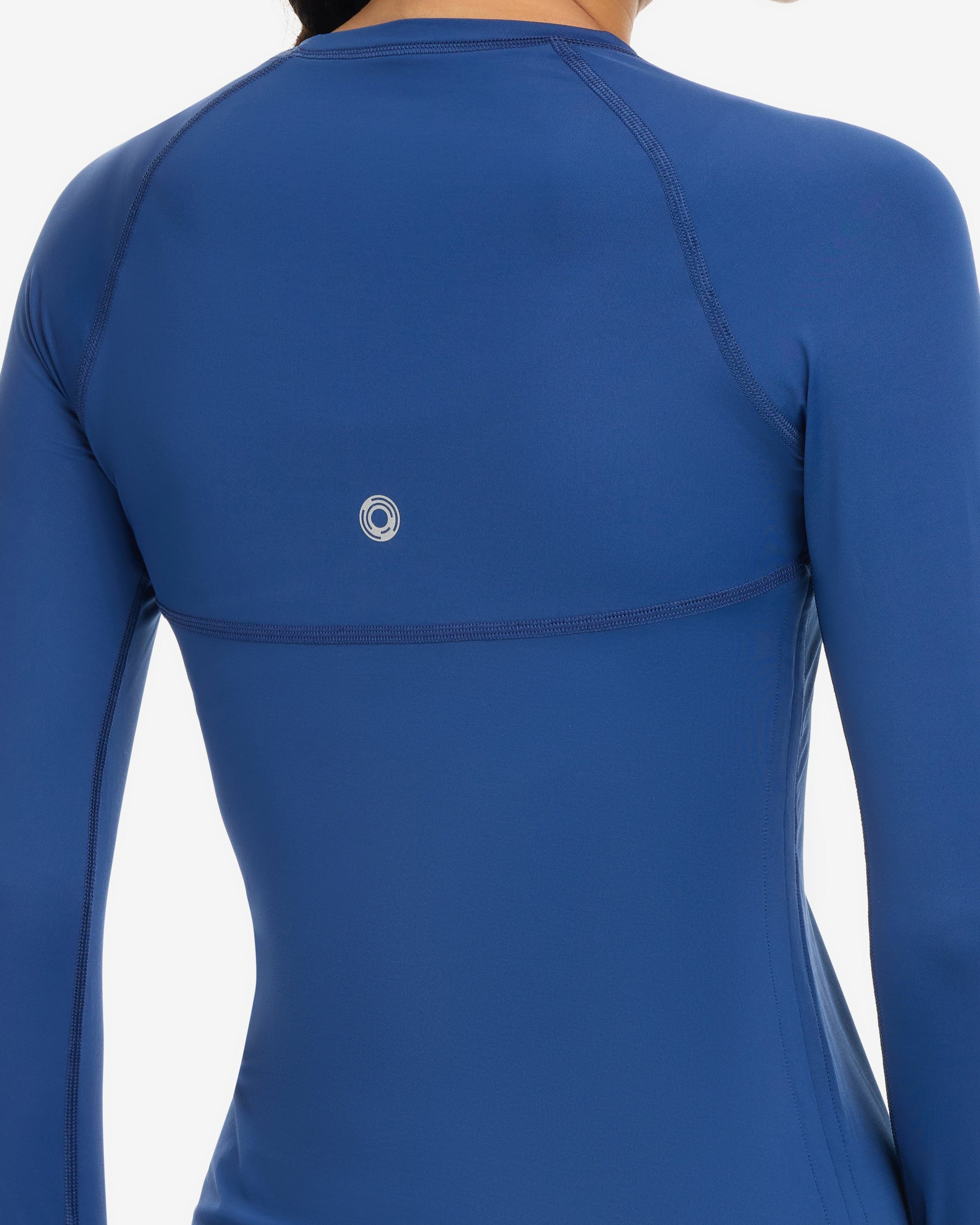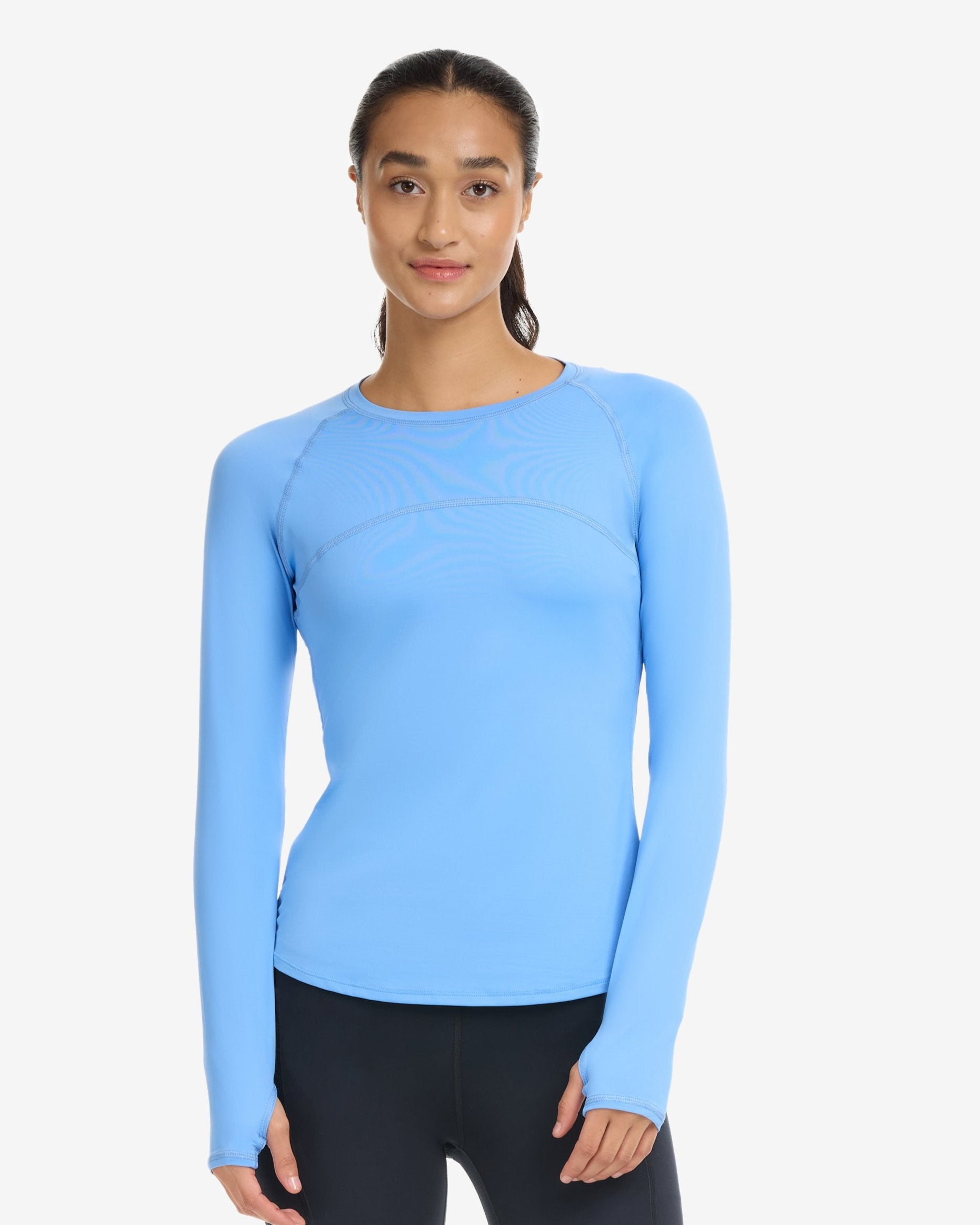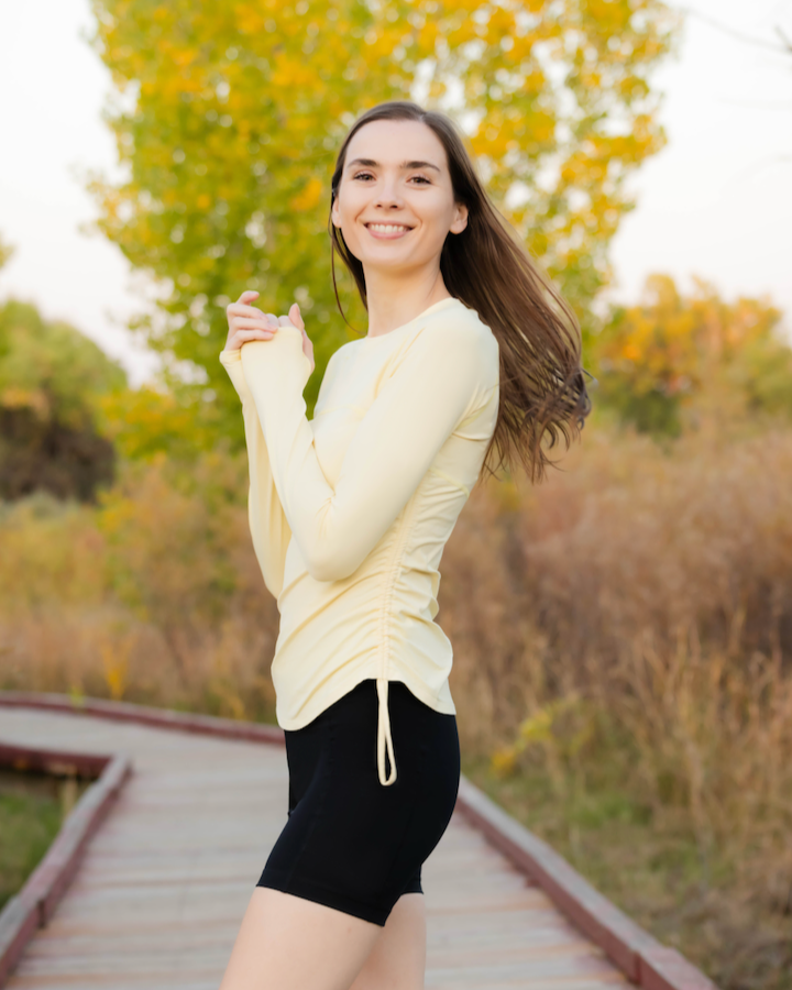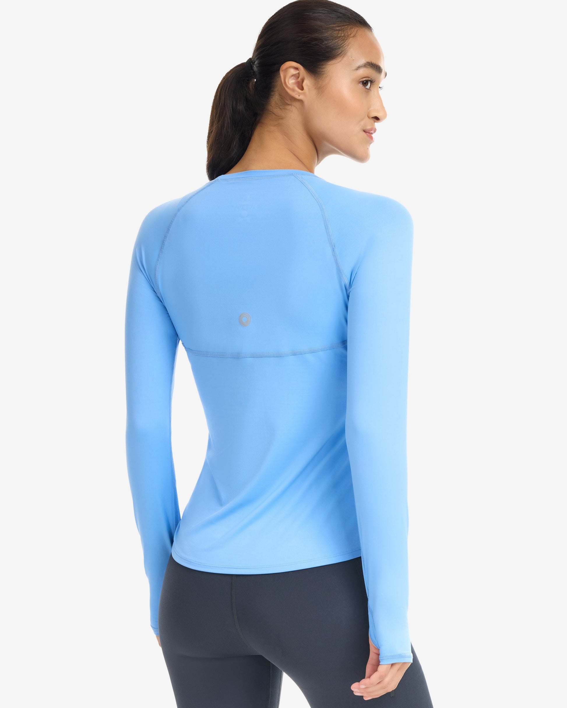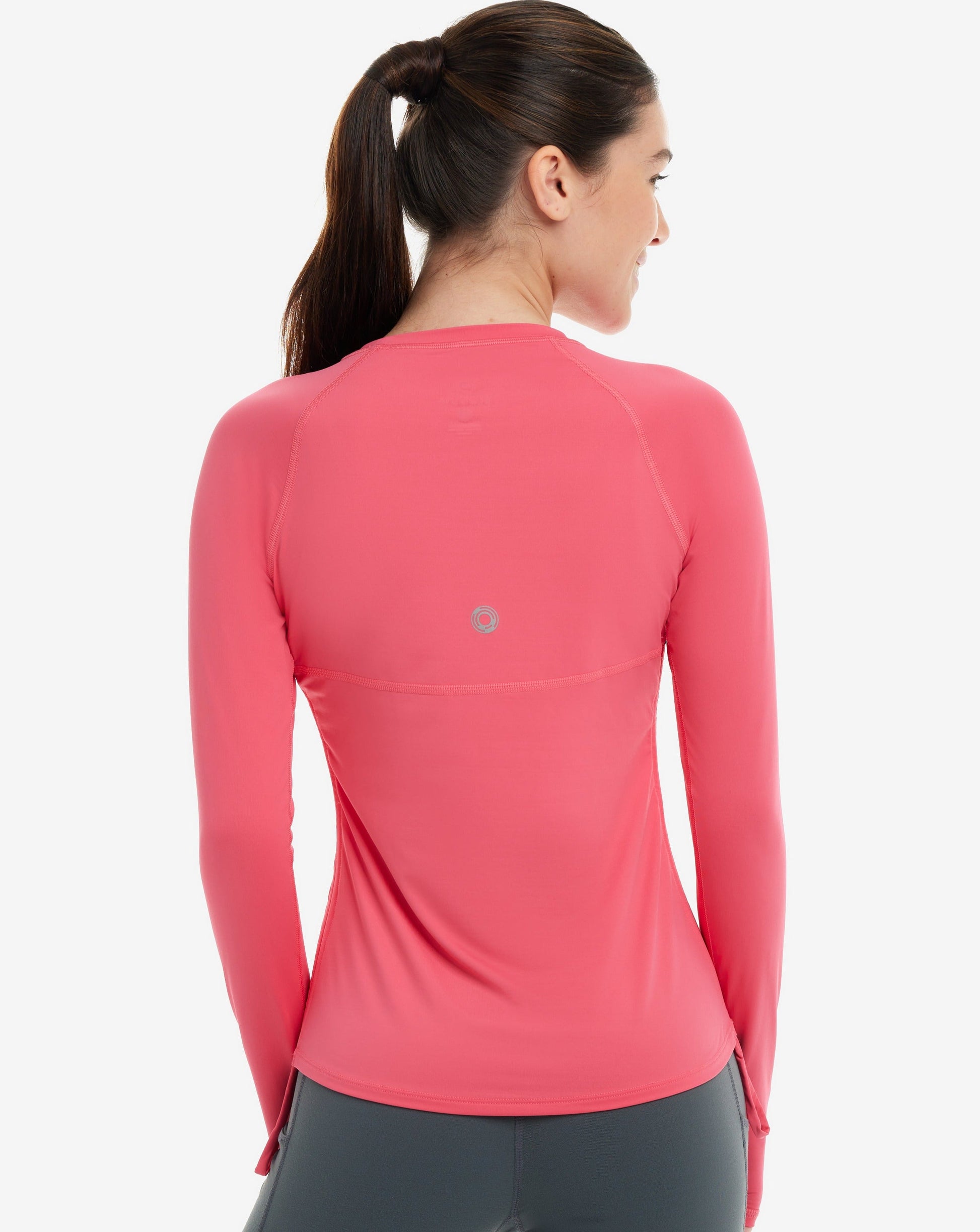 A staple piece to have as part of your athleisure wardrobe. This crew long sleeve UPF Shirt has drawstring for adjustable length. The side ruching allows you to wear the shirt as long or as short as you like. This indispensable, multi-functional piece looks great with joggers, pants or BloqUV tights and can also serve as a swim shirt or rash guard. Enjoy SPF protection while playing tennis, pickle ball, paddle boarding, boating, running, swimming, walking or shopping.