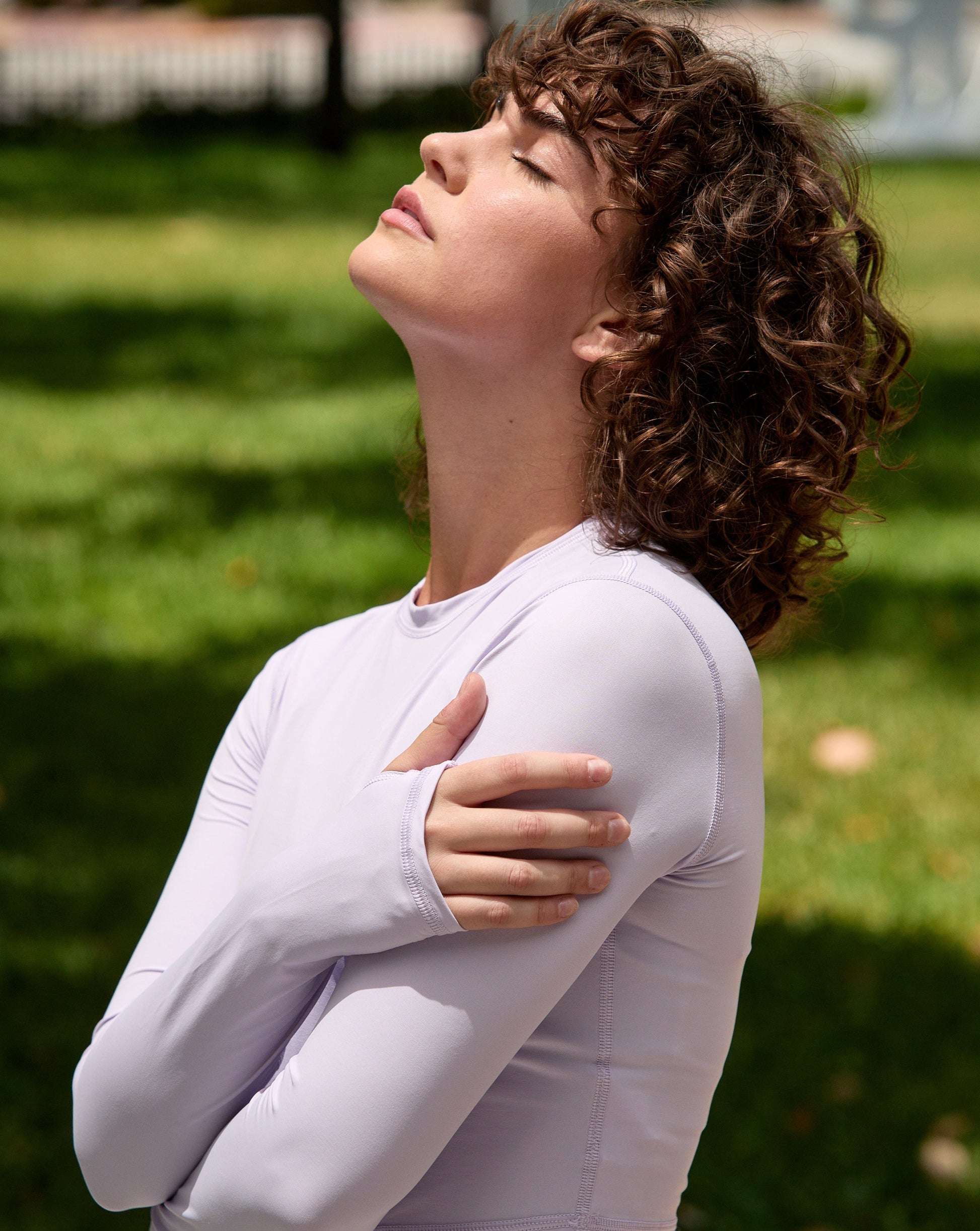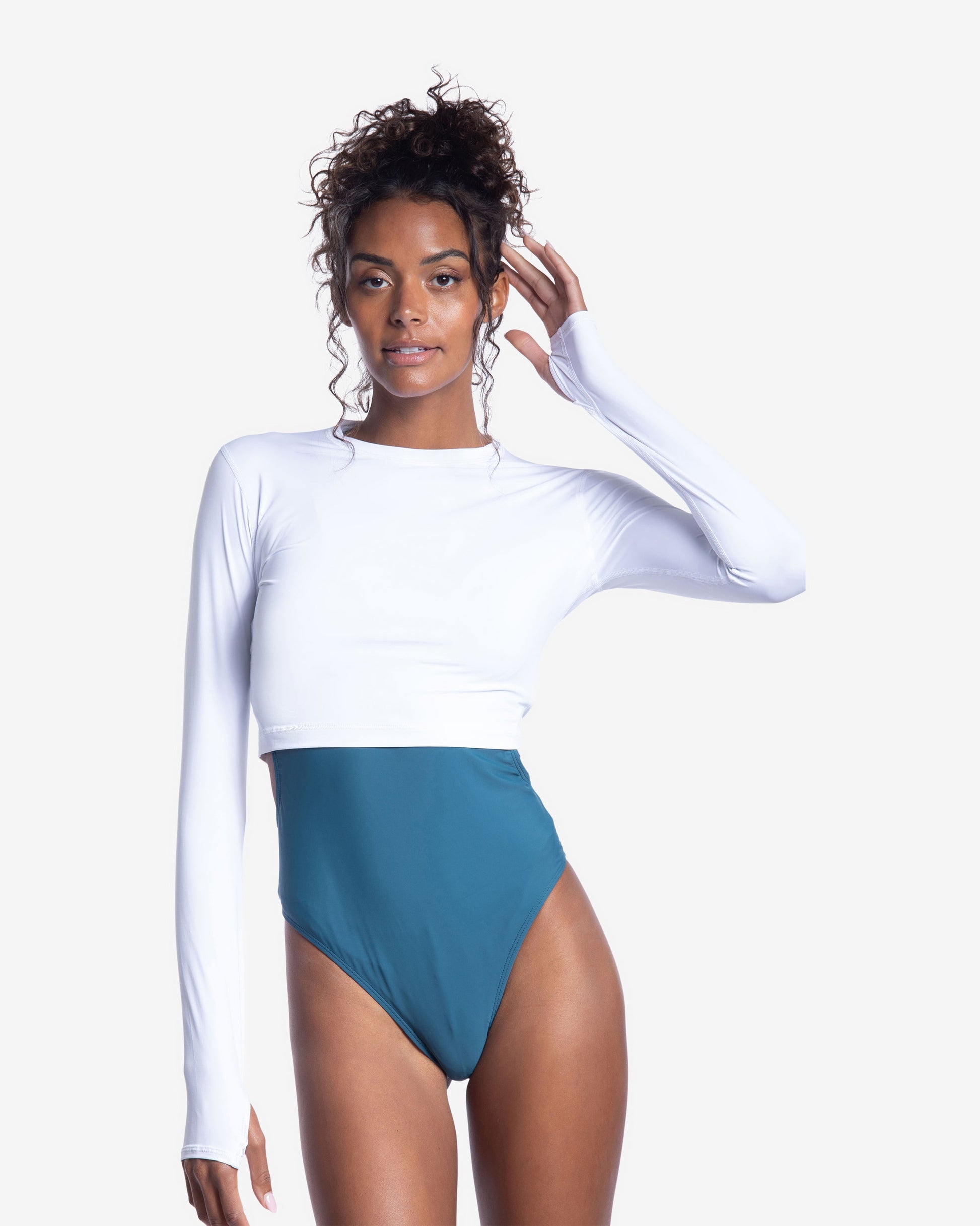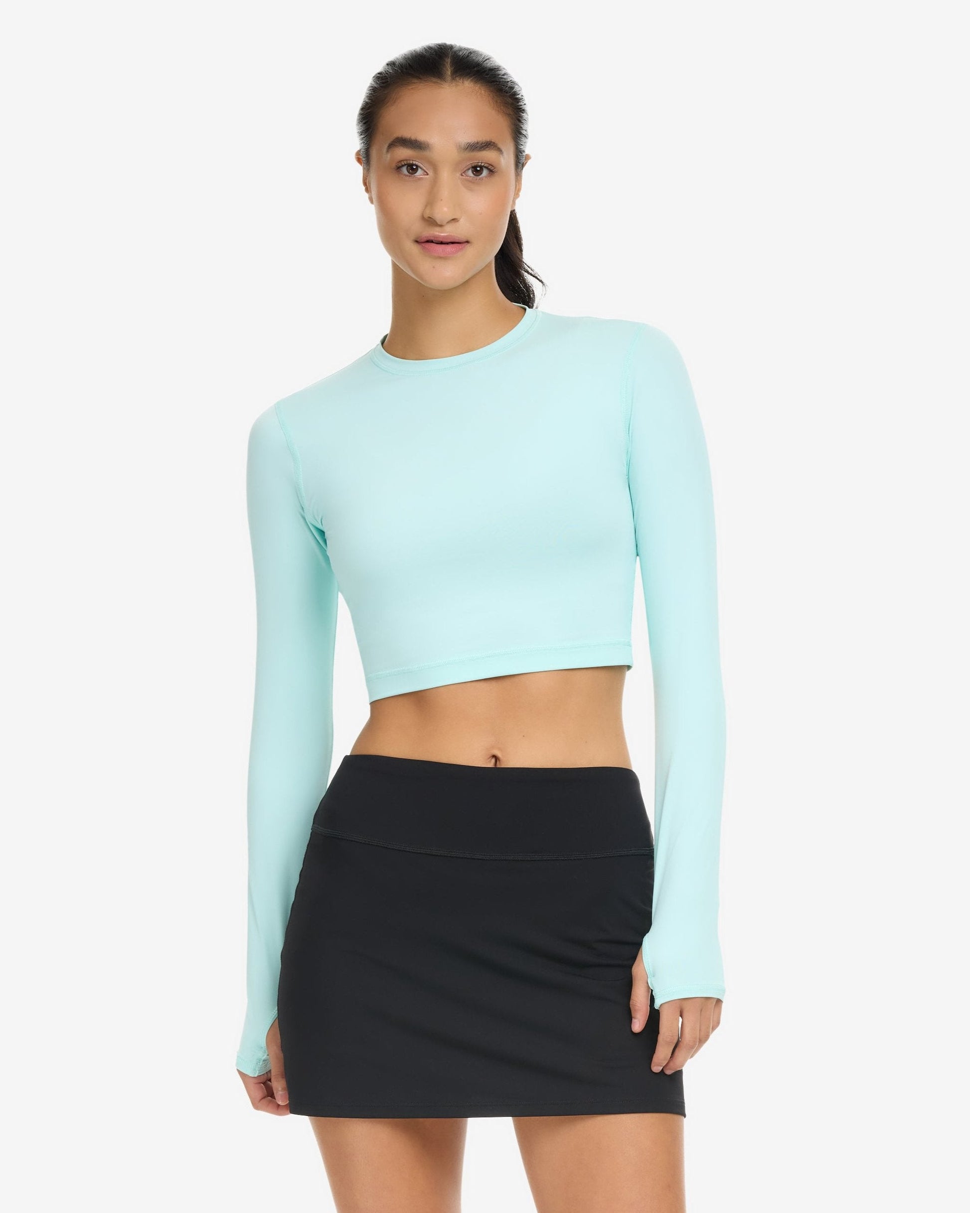 This is the perfect Everyday BloqUV UPF 50+ crop shirt when you want sun protection for your arms and shoulders without adding bulk. This extended body length everyday crop top was designed with a longer length to be worn over your favorite tank or swimsuit and with tights to provide superior SPF sun protection while keeping cool. It's suitable for activities on and off the water: running, biking, swimming, paddle boarding, yoga, tennis, beach tennis, pickle ball, sight-seeing, or just to protect you arms while driving! This extended-length crop top provides ample chest coverage when engaged in beach volleyball and racquet sports, ensuring it stays in place and avoids exposing your chest while serving or making slam shots.