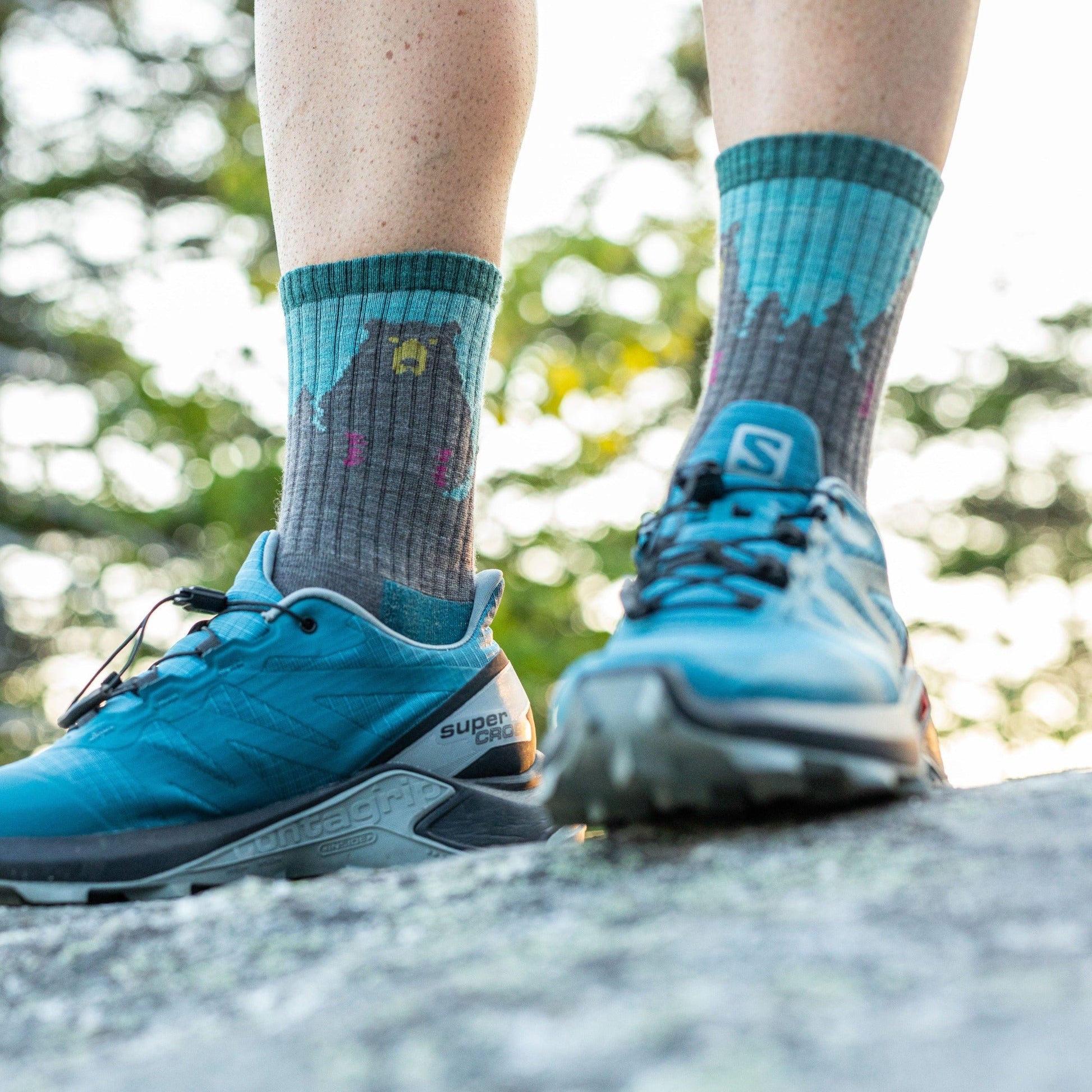Bears, trees and boot socks, oh my. Adding humor to your outdoors encounters, wearing a symbol of your vertical goals, or buckling down for a serious thru-hike, this quiver of our light, mid and full cushion Hike socks is ready for any trek.