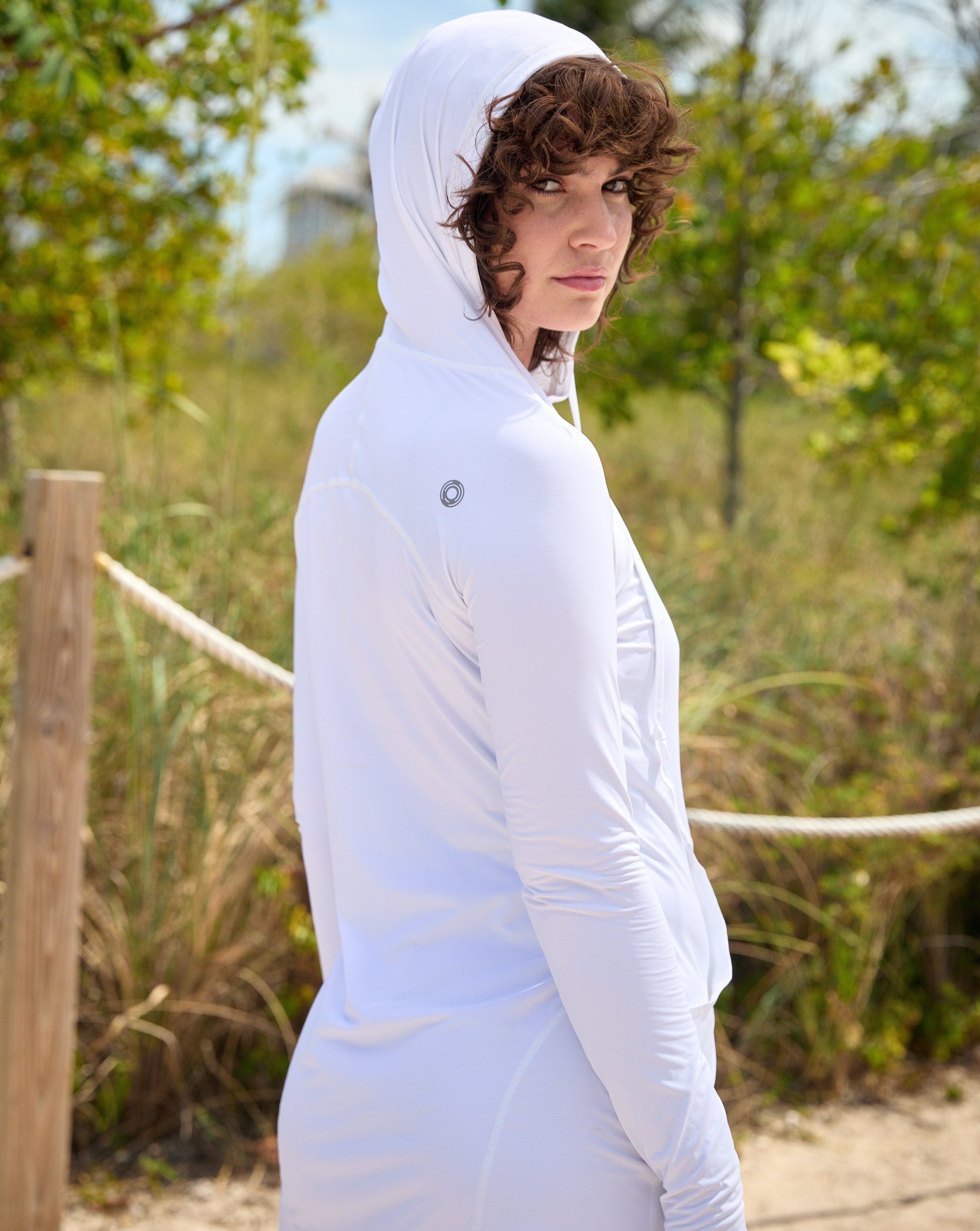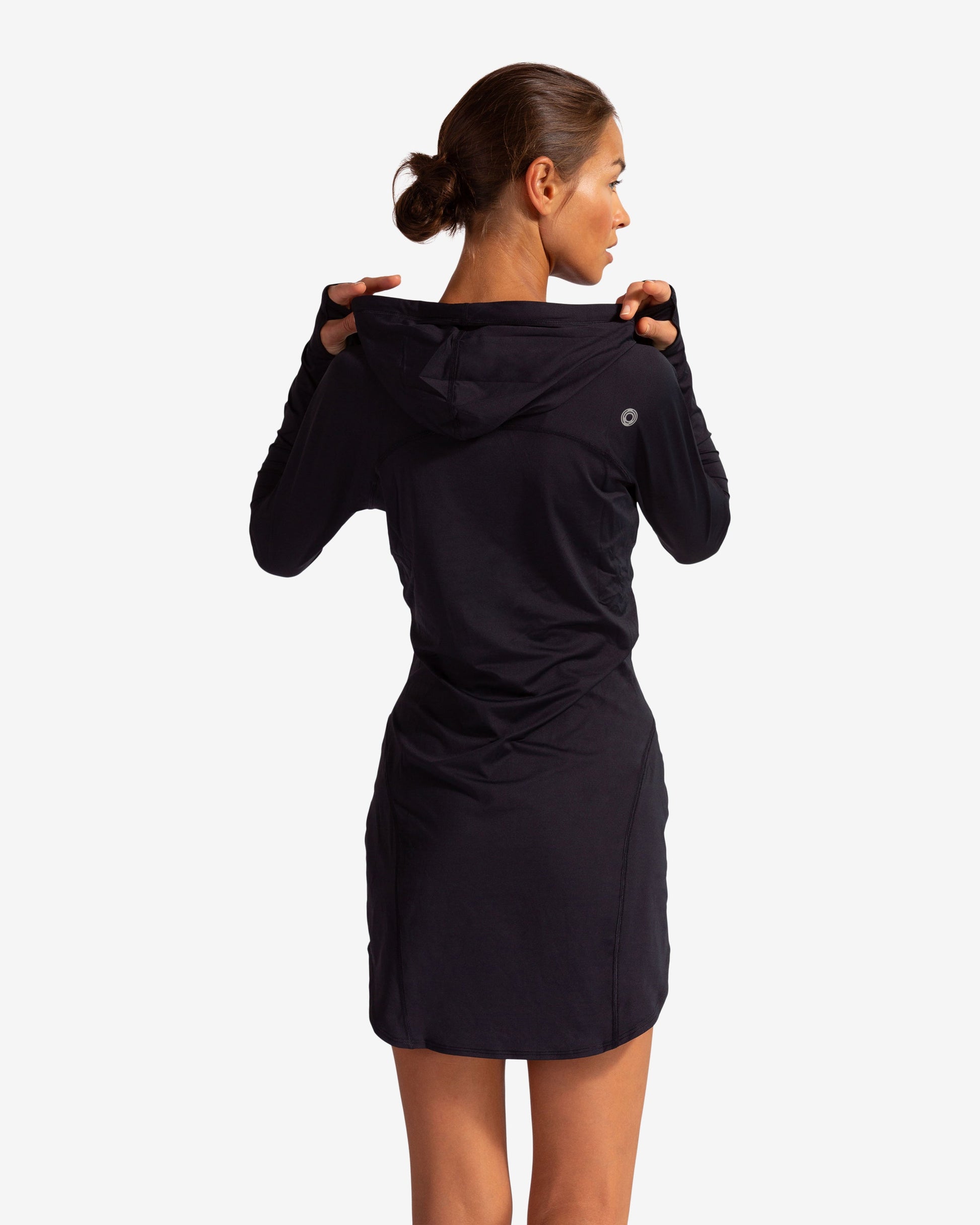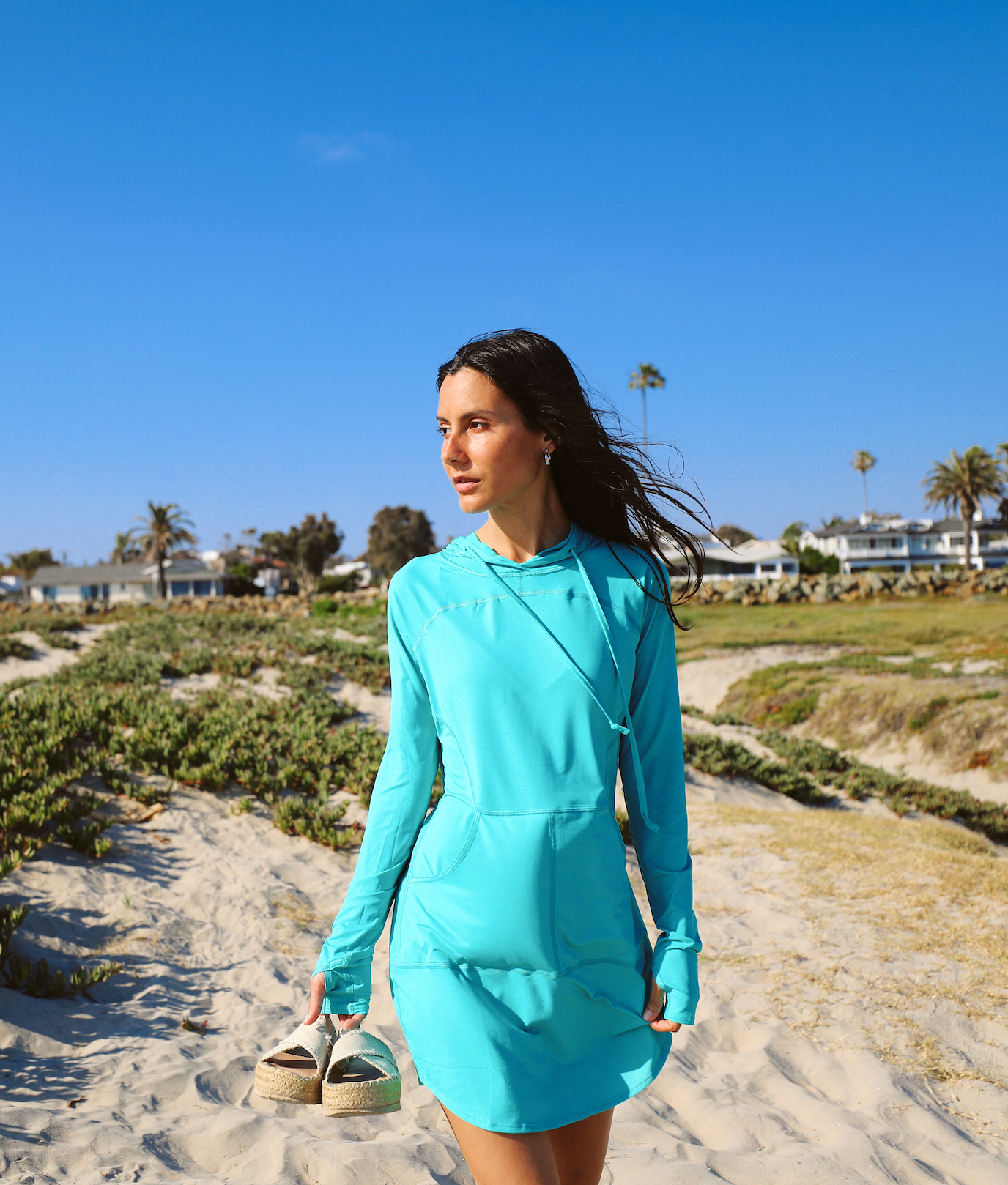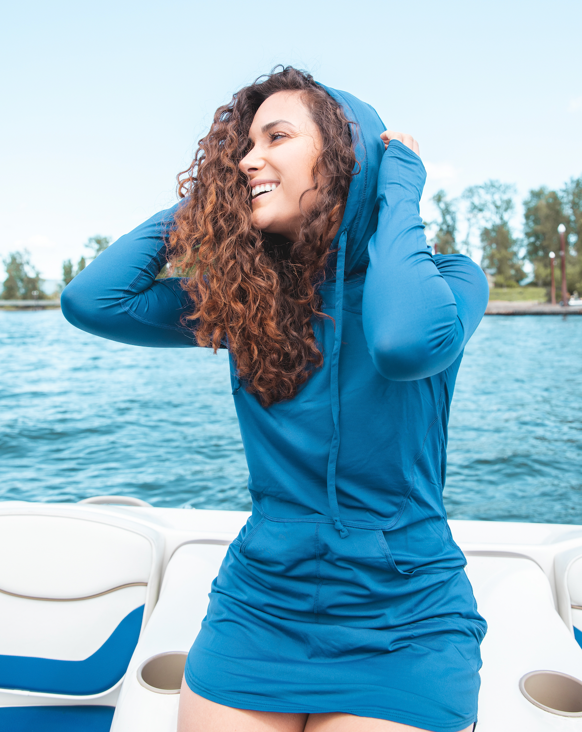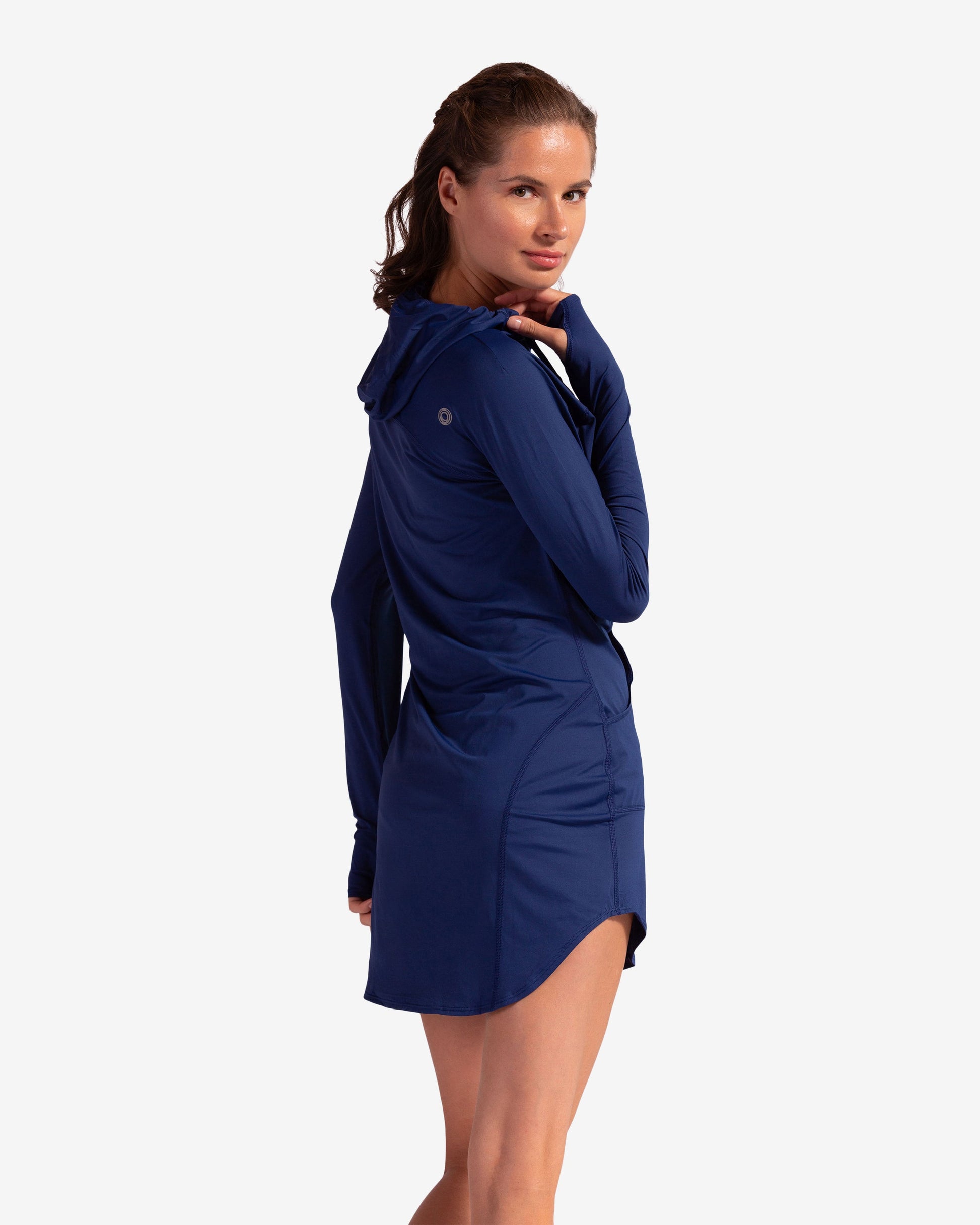 Take cover in the BloqUV sun protective long sleeve hoodie dress! The full chest and head coverage, long sleeves and hood offer wind and UPF 50+ sun protection while keeping you comfortable and stylish. Ideal for the beach or boat or as the perfect pickle ball and beach tennis outfit, it can be worn as a swim dress, as a bathing suit cover up, or just to run errands with your favorite sneakers. Go directly to lunch in town, wearing it alone as a dress or a tunic top over BloqUV tights. An indispensable, multi-functional addition to your weekend getaway travel bag.