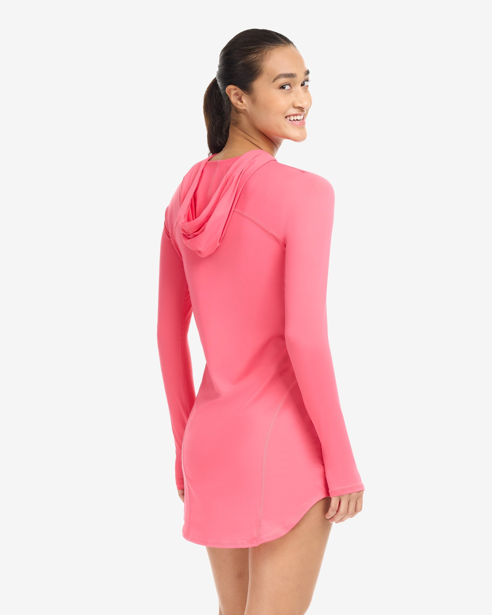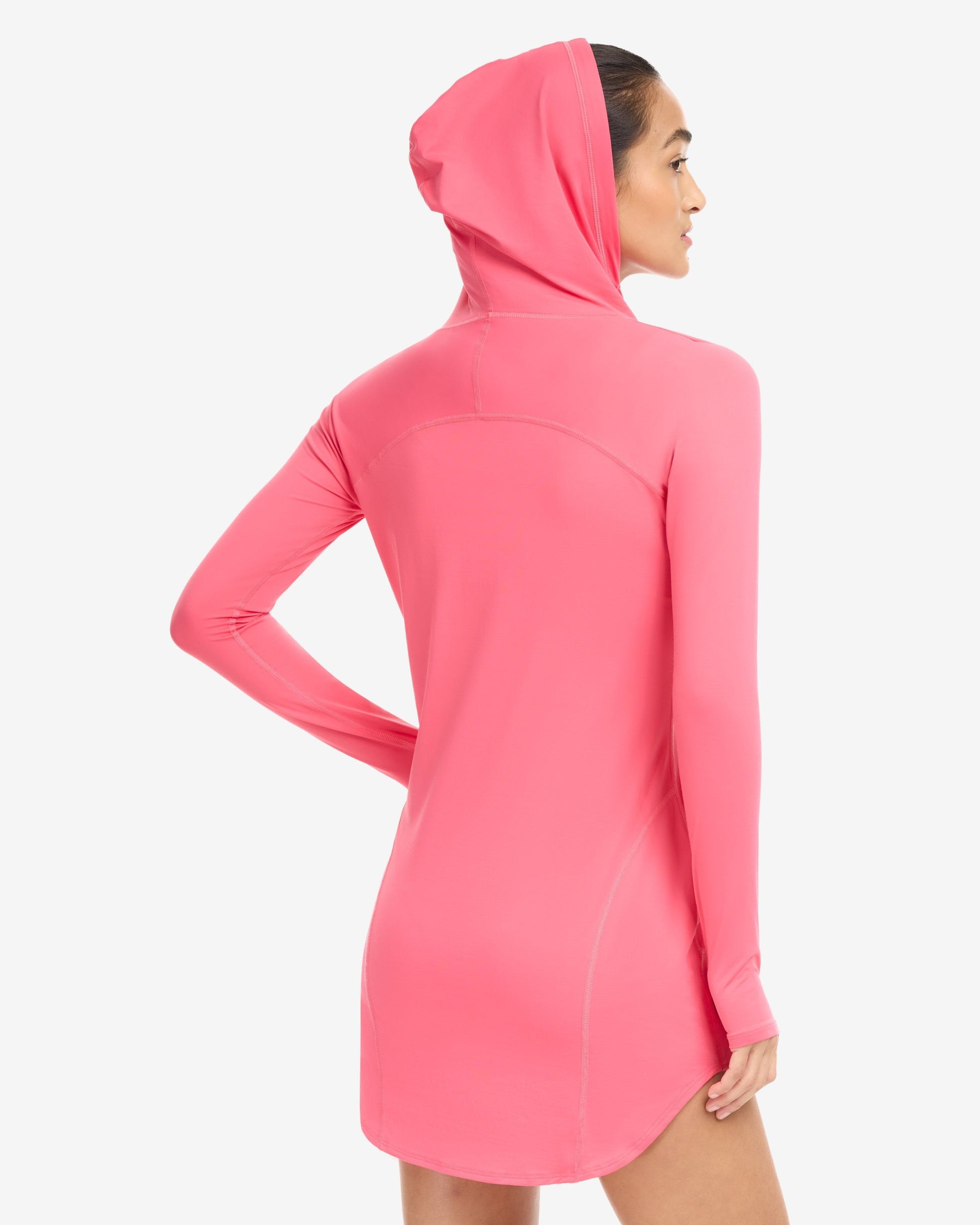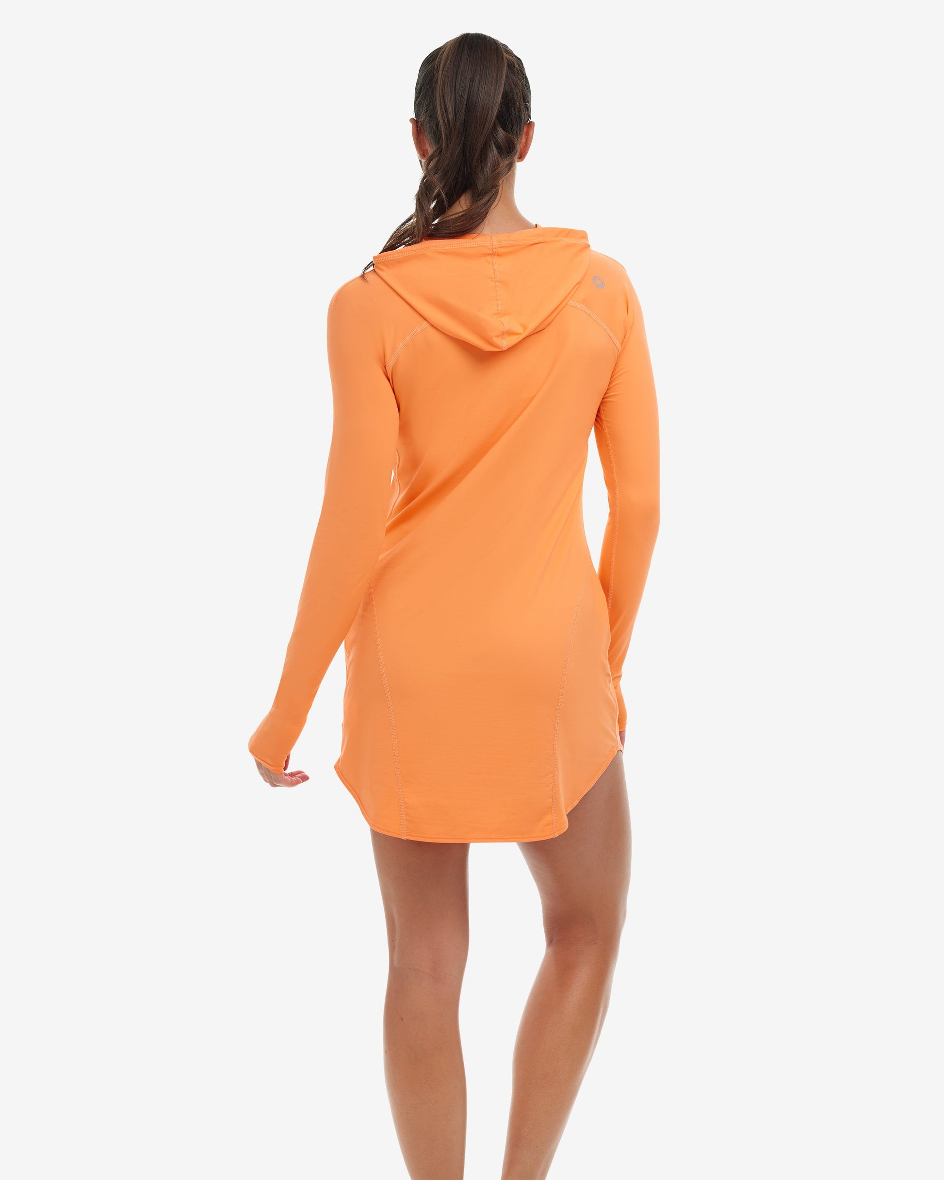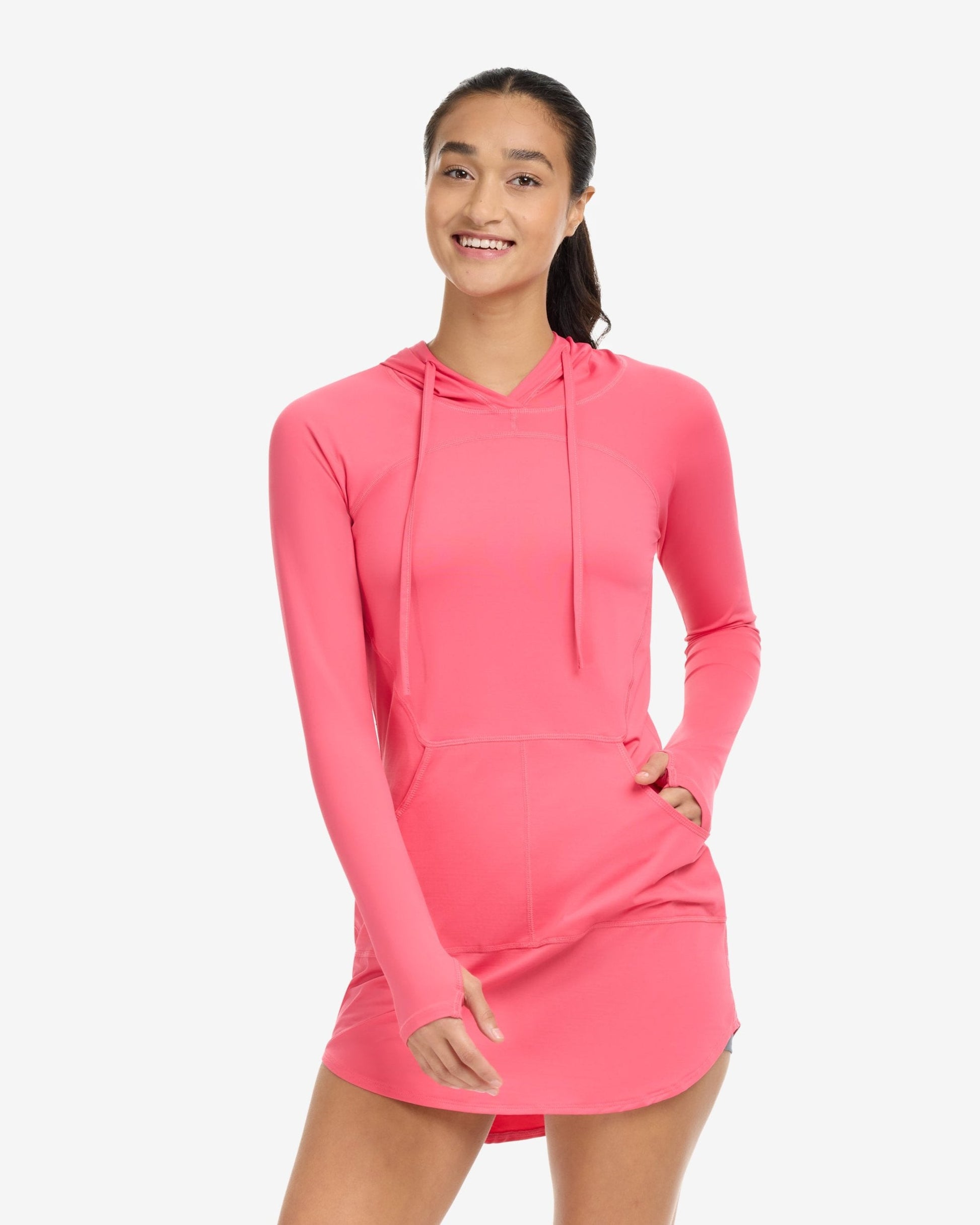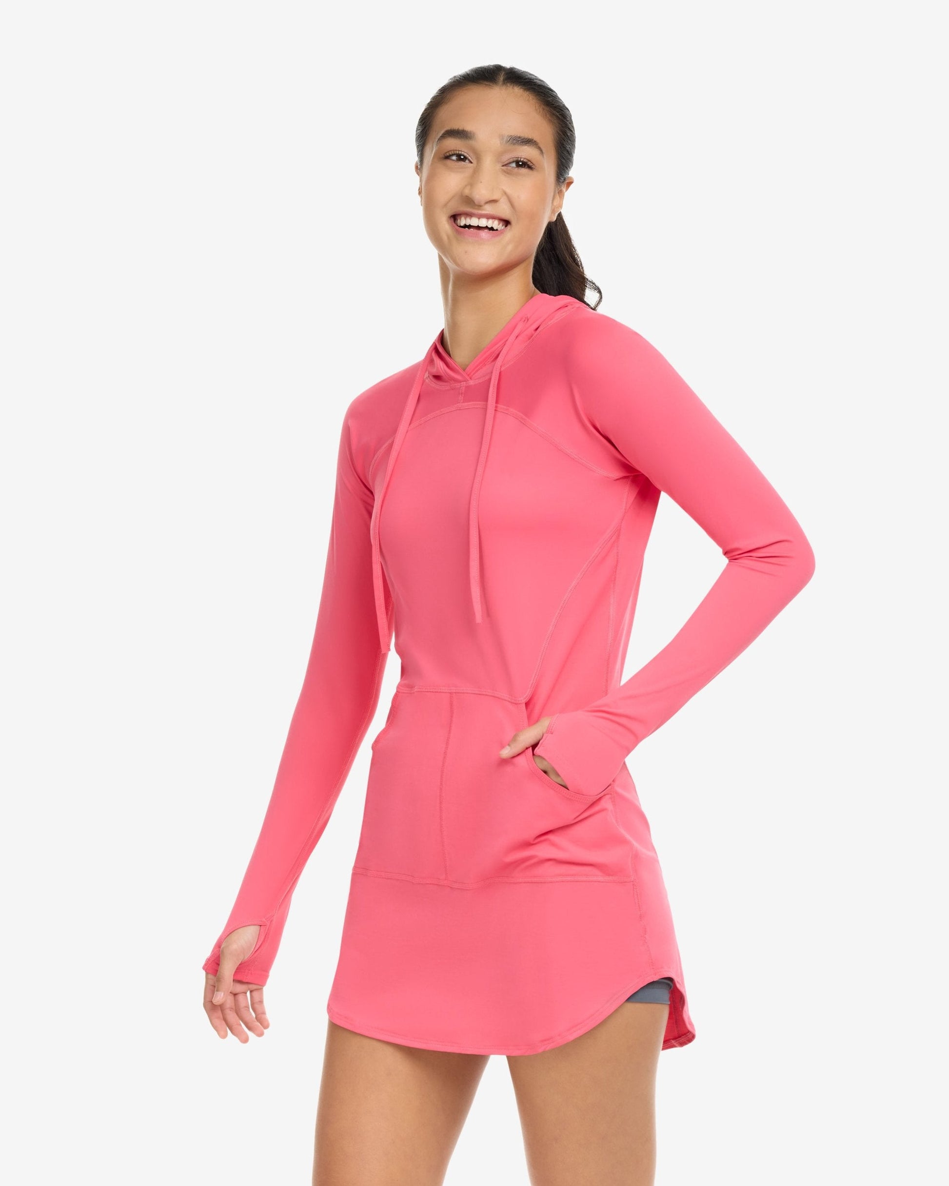 Take cover in the BloqUV sun protective long sleeve hoodie dress! The full chest and head coverage, long sleeves and hood offer wind and UPF 50+ sun protection while keeping you comfortable and stylish. Ideal for the beach or boat or as the perfect pickle ball and beach tennis outfit, it can be worn as a swim dress, as a bathing suit cover up, or just to run errands with your favorite sneakers. Go directly to lunch in town, wearing it alone as a dress or a tunic top over BloqUV tights. An indispensable, multi-functional addition to your weekend getaway travel bag.