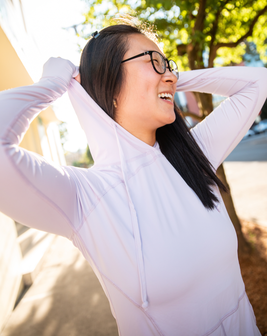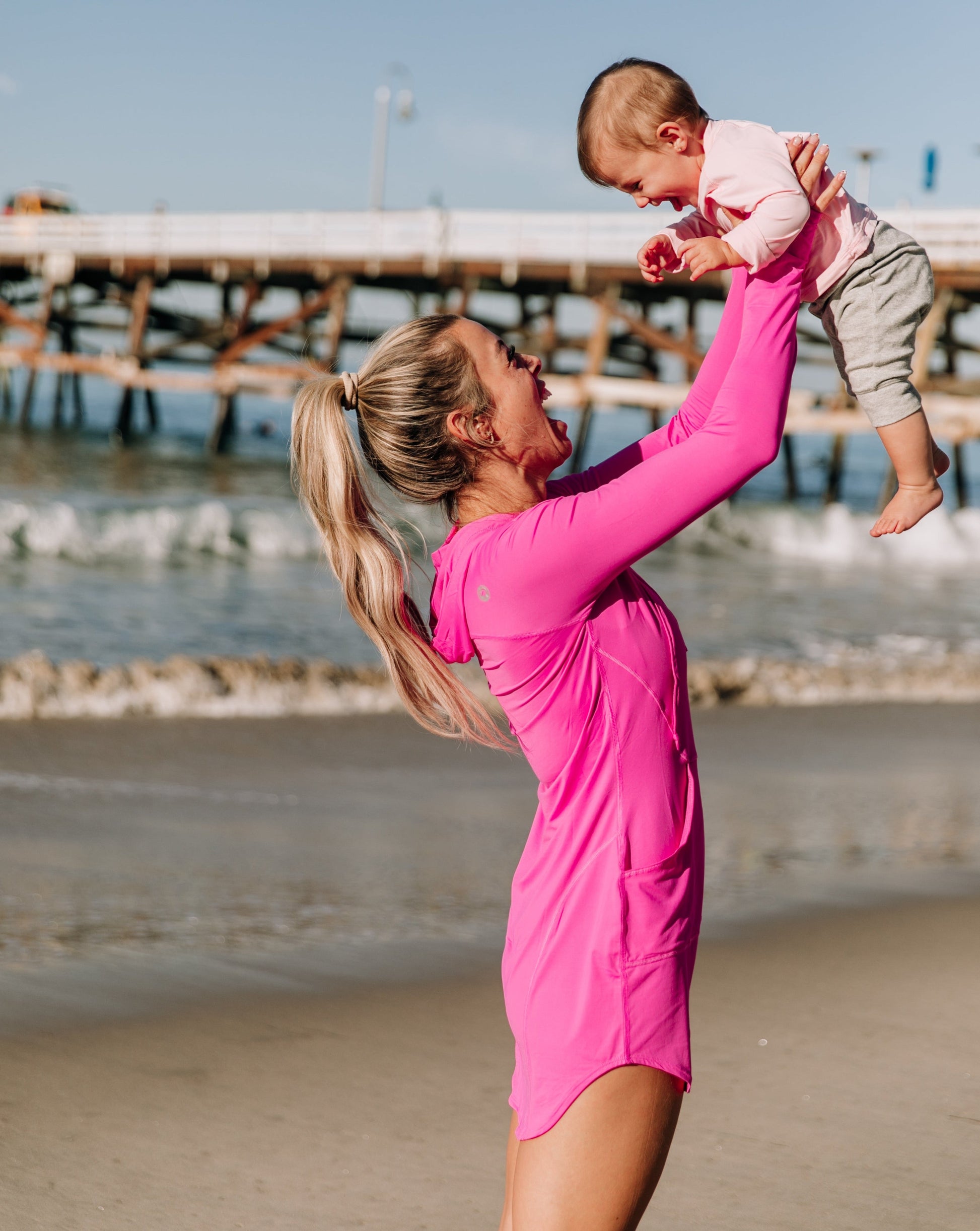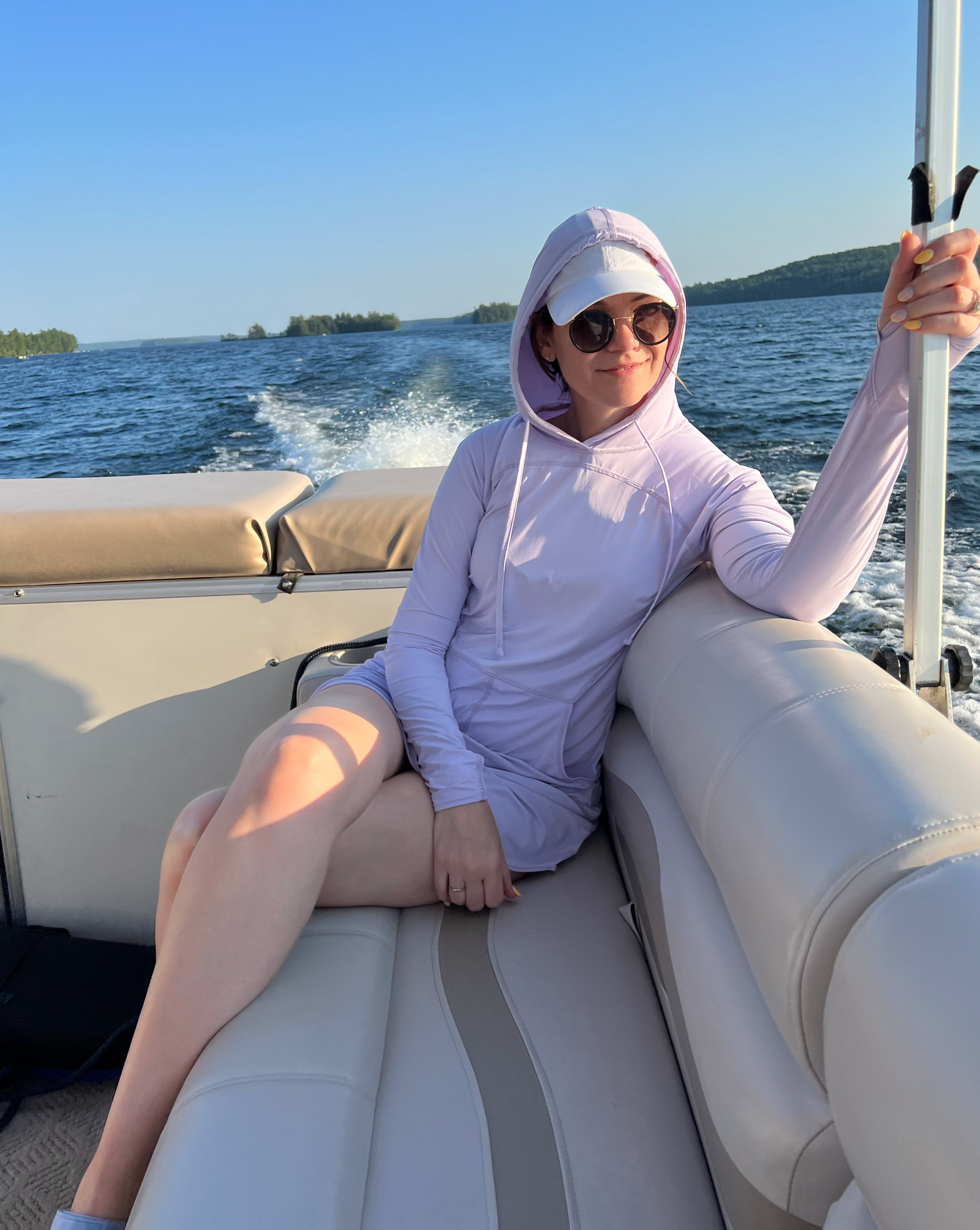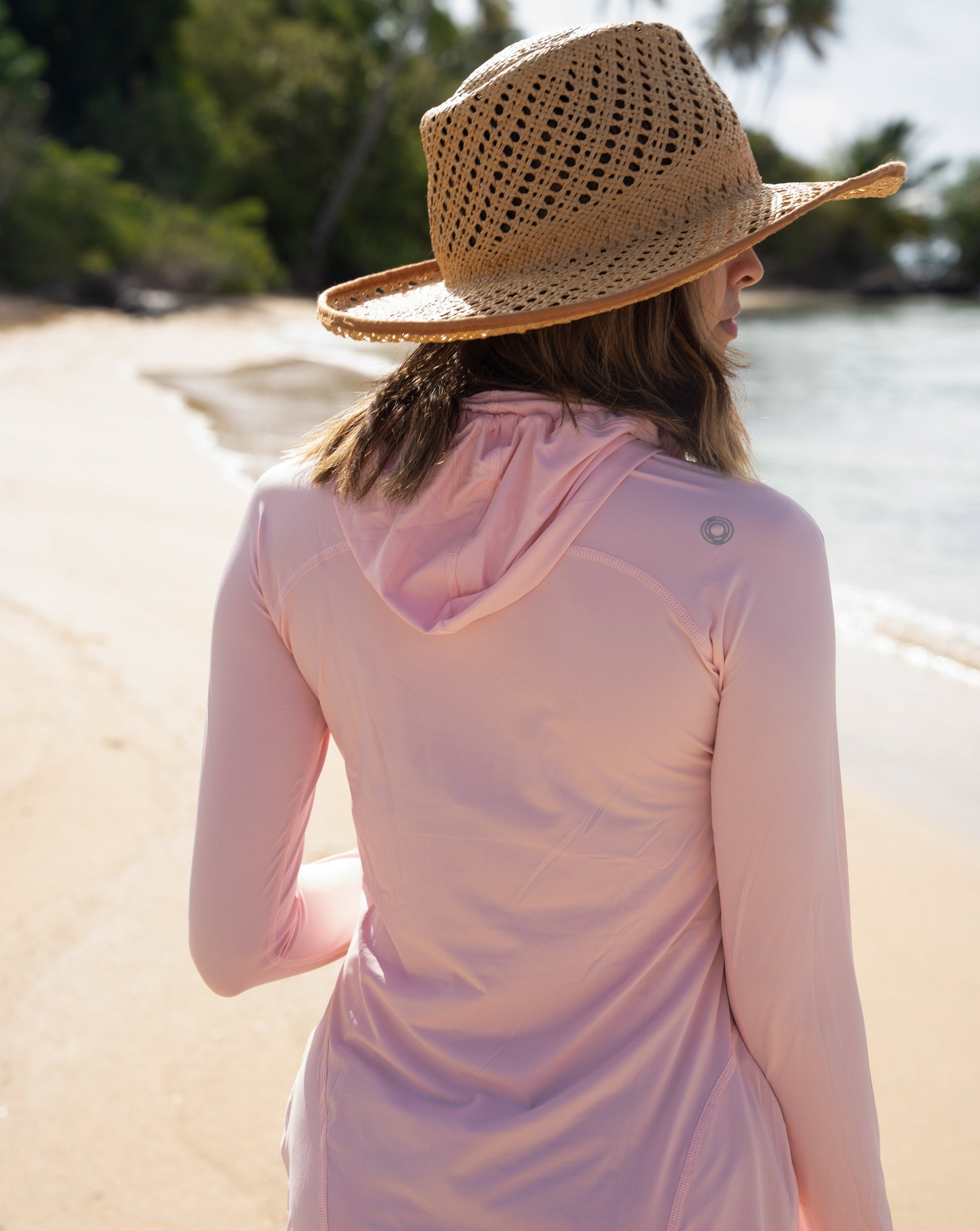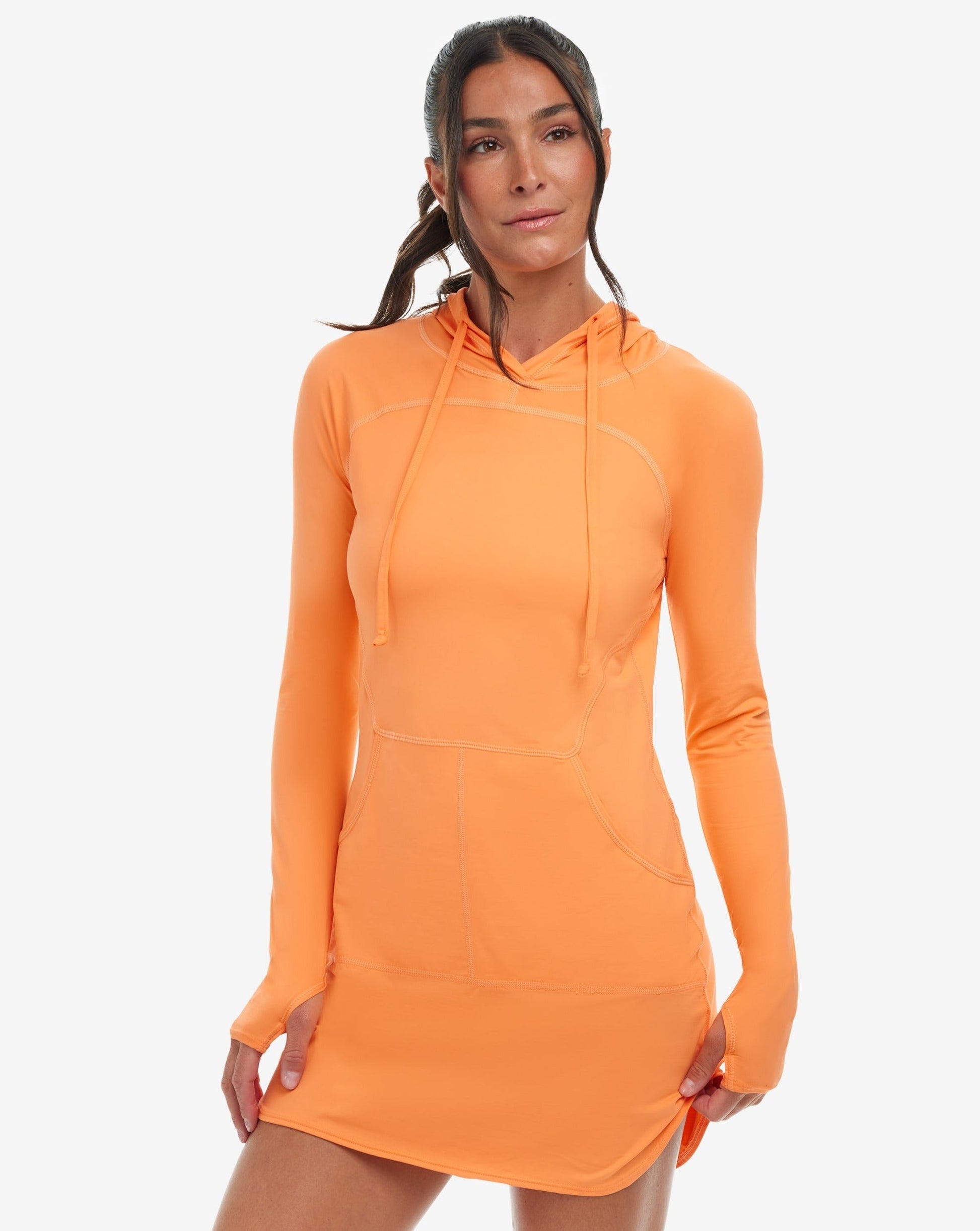 Take cover in the BloqUV sun protective long sleeve hoodie dress! The full chest and head coverage, long sleeves and hood offer wind and UPF 50+ sun protection while keeping you comfortable and stylish. Ideal for the beach or boat or as the perfect pickle ball and beach tennis outfit, it can be worn as a swim dress, as a bathing suit cover up, or just to run errands with your favorite sneakers. Go directly to lunch in town, wearing it alone as a dress or a tunic top over BloqUV tights. An indispensable, multi-functional addition to your weekend getaway travel bag.