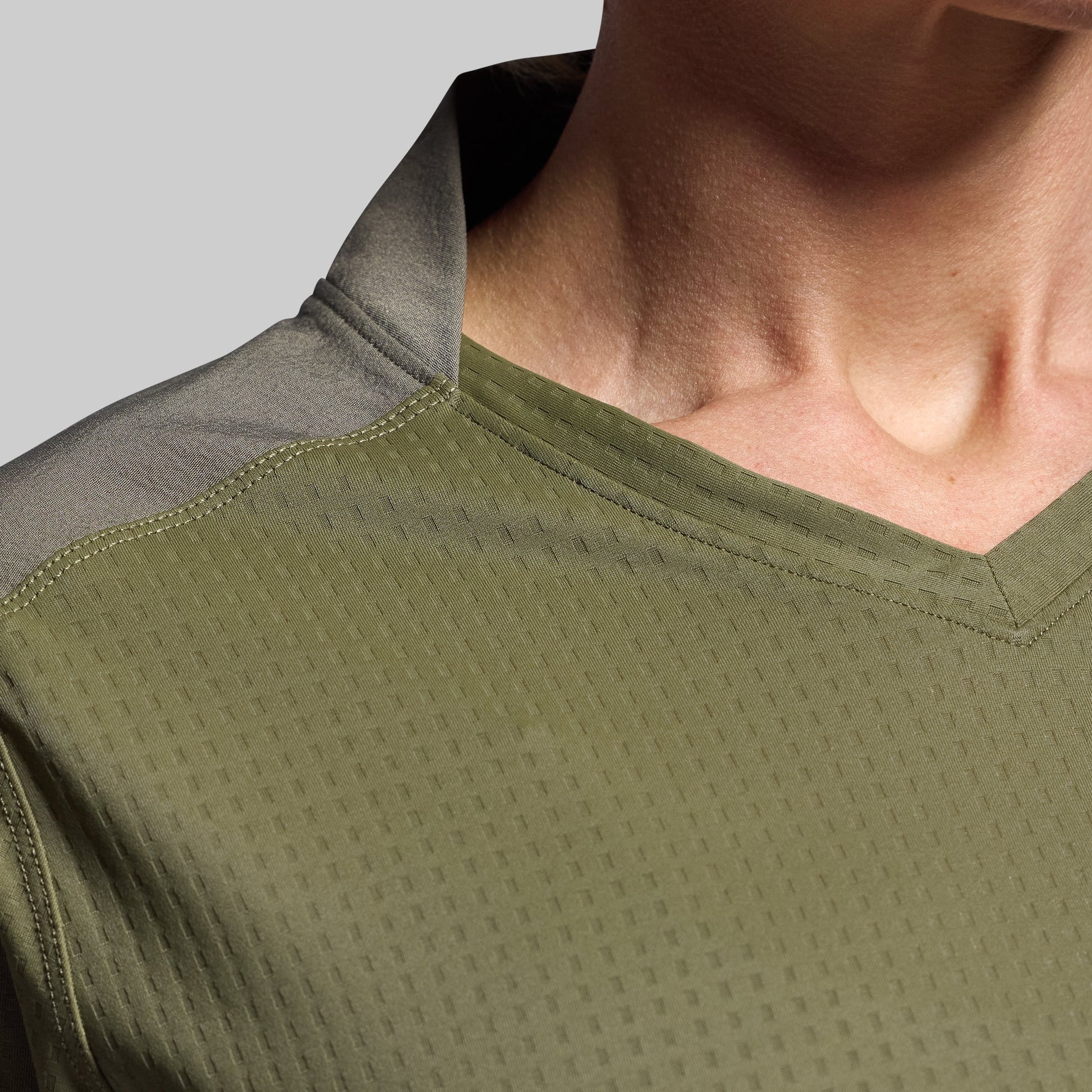 Designed with abrasion-resistant stretch fabric at the shoulders and arms, it offers durability and mobility when you're pushing your limits. Ventilated fabric on the chest and back provides breathability, while BP Shield technology delivers superior moisture-wicking, anti-odor, and UVA/UVB protection to keep you cool and focused in any environment. The shallow V-neck increases range of motion, and side zippered arm pockets with Velcro patches ensure your gear is always within reach.