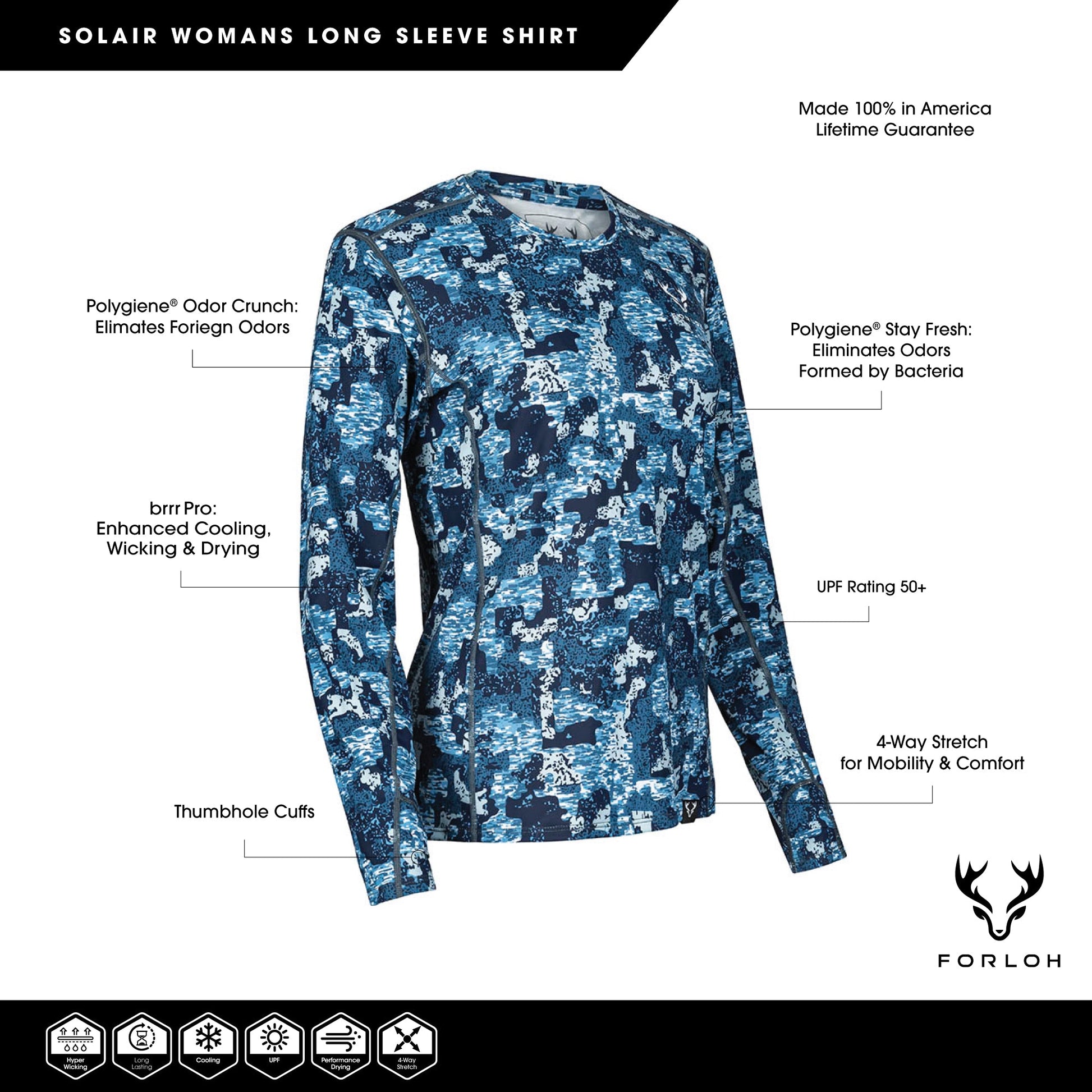 As with all FORLOH base layers, this women’s UPF long sleeve shirt employs Polygiene® Stay Fresh antimicrobial and Odor Crunch scent control systems to keep you fresher and less detectable to prey and humans alike. This crew neck sun protective shirt is our most versatile warm weather ‘next to skin’ layer for all your outdoor adventures.