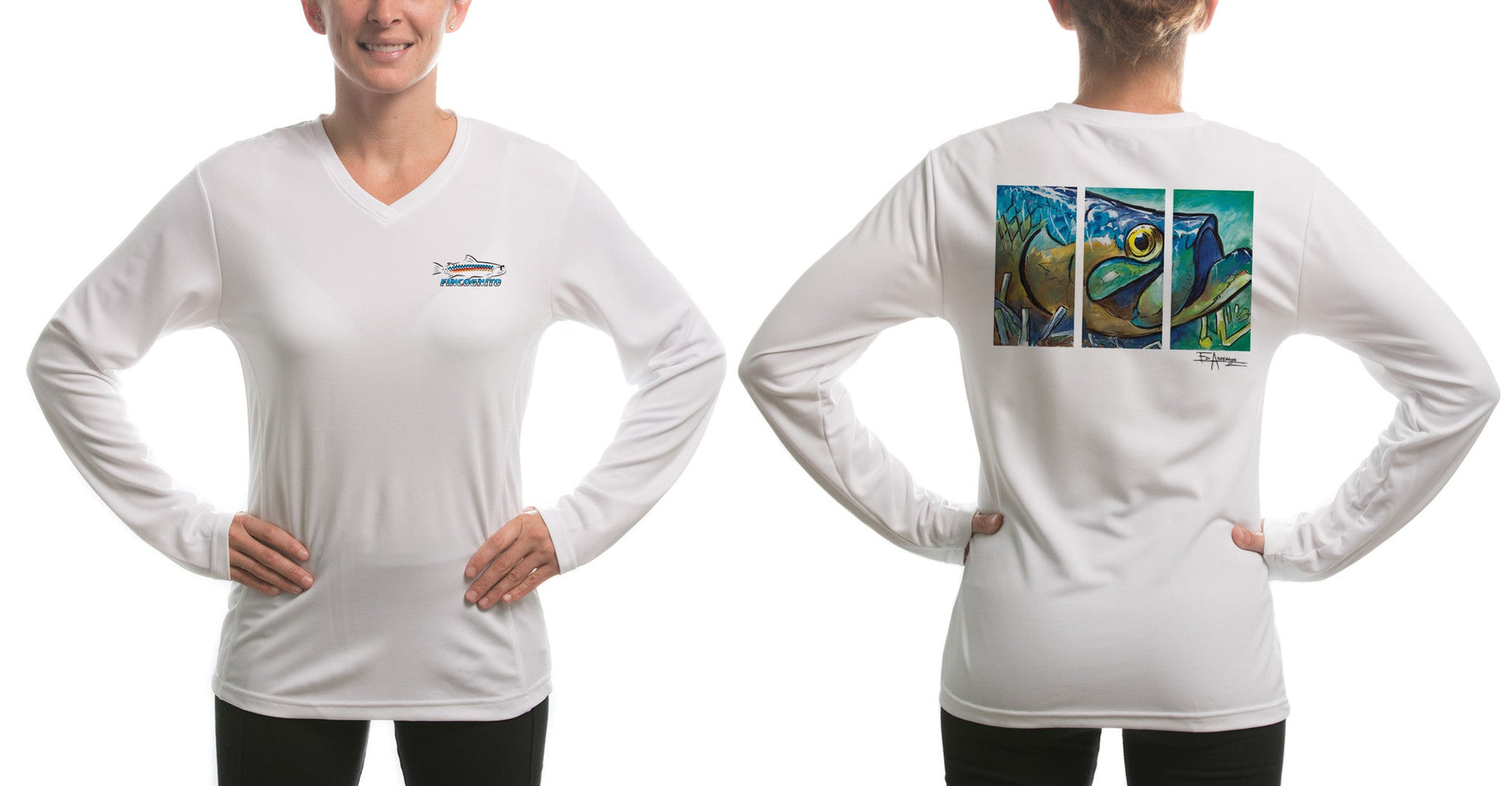 Lightweight sun protective SPF 50 fishing shirts with a raglan sleeve women's cut. We place Ed Anderson's "Tarpon Layup" on the back of this white-colored long sleeve T. The Fincognito logo adorns the left chest. 100% polyester with PURE-Tech wicking technology. Our fly fishing apparel works well on the water or as hiking clothes on the trail. Great sun protection, moisture wicking apparel.