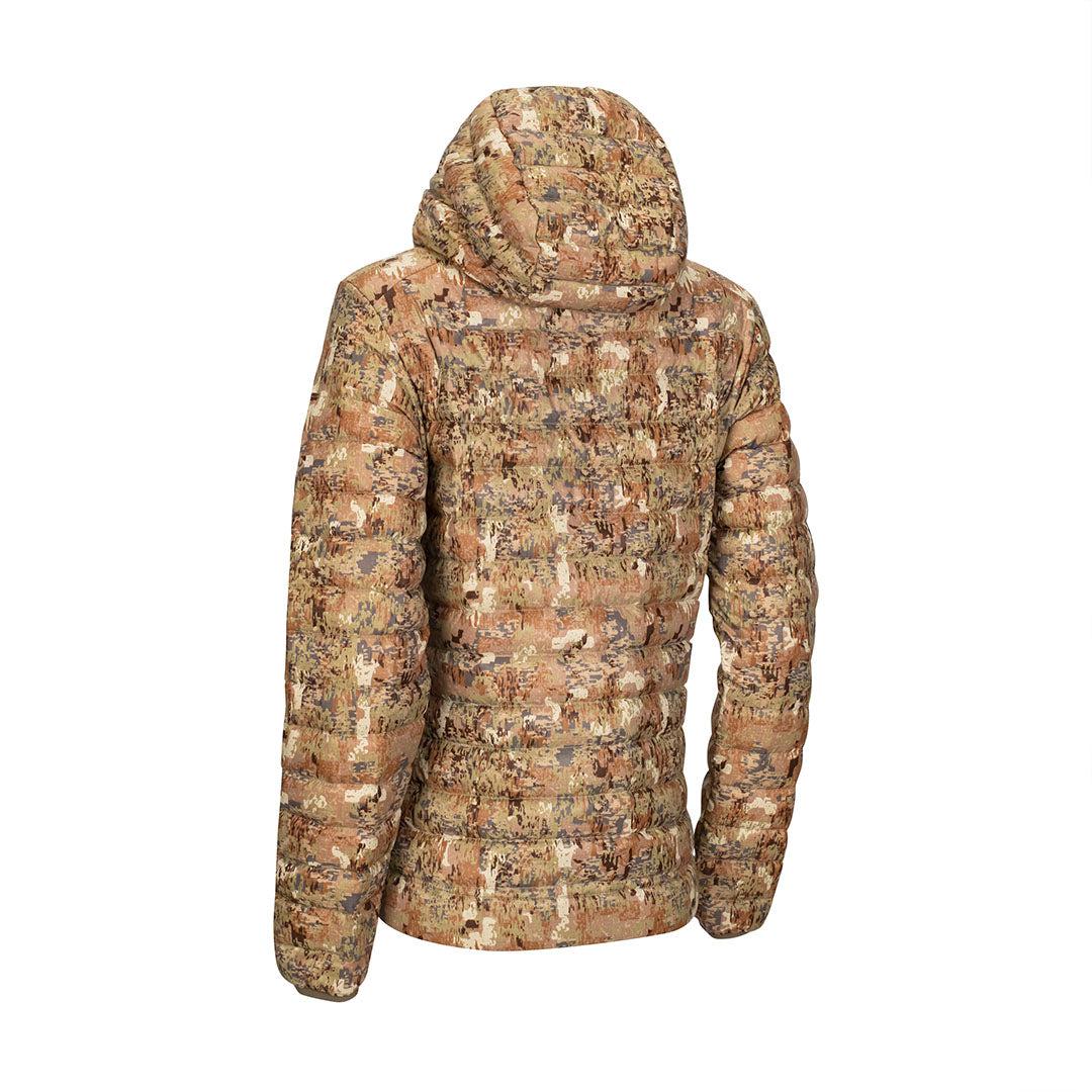At the core of this hooded down jacket is a commitment to outstanding insulation and rapid drying capabilities. Made with DWR-treated 800 fill organic duck down sourced locally in the USA, each feather is enhanced with Activ-Dri™ Down, significantly reducing moisture retention from rain or sweat by over 60%. This ensures the down maintains its loft and warmth-to-weight ratio, even in wet conditions, making it ideal for hunting trips and extended backcountry adventures. The jacket also features PrimaLoft Gold insulation that enhances moisture management.